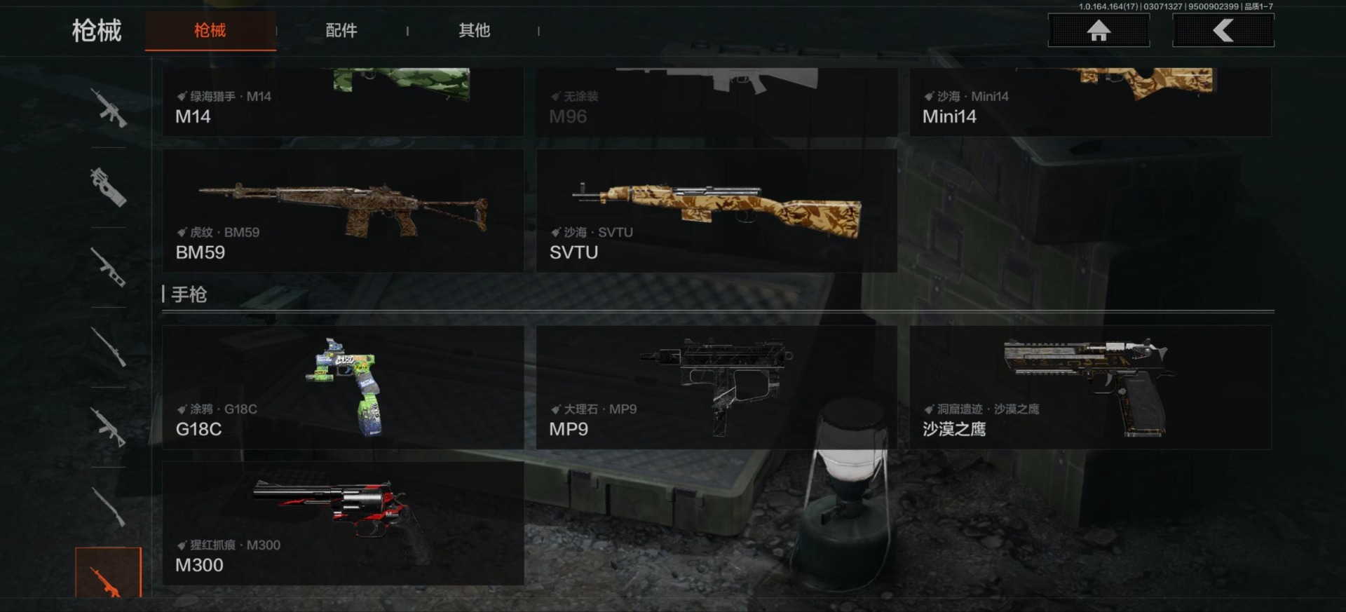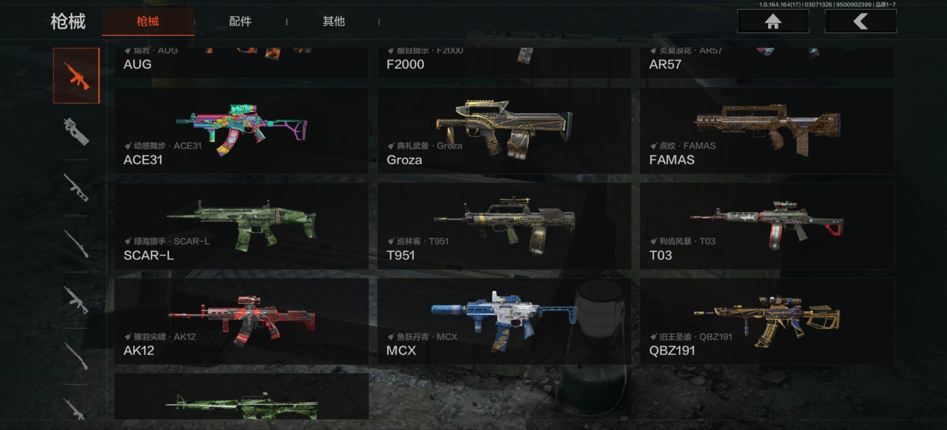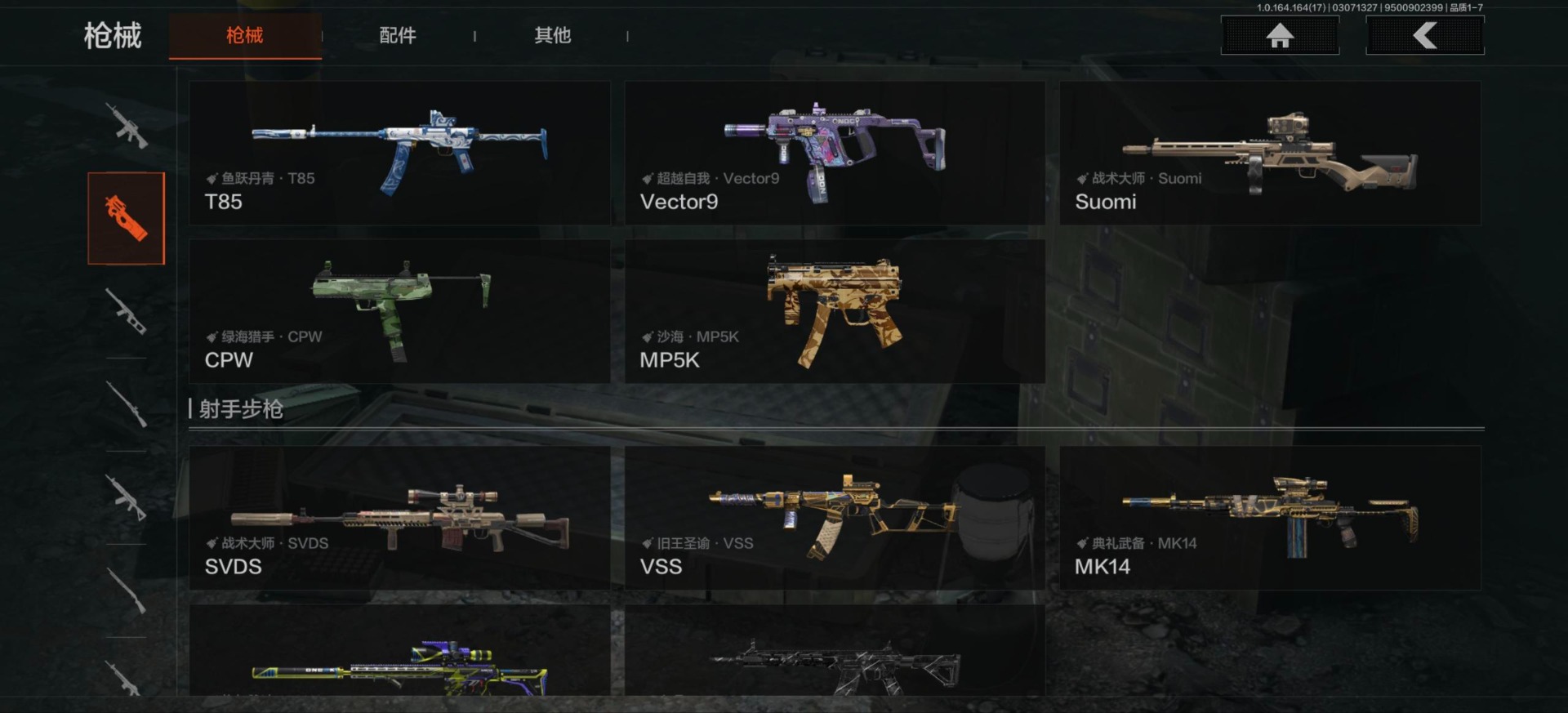 【紫色枪皮】鱼跃丹青·T85,鱼跃丹青·AK102,护命金翎·M24,粉绒臻选·AR30,典礼武备·GROZA,典礼武备·MK14,典礼武备·S12K,鱼跃丹青·MCX,高