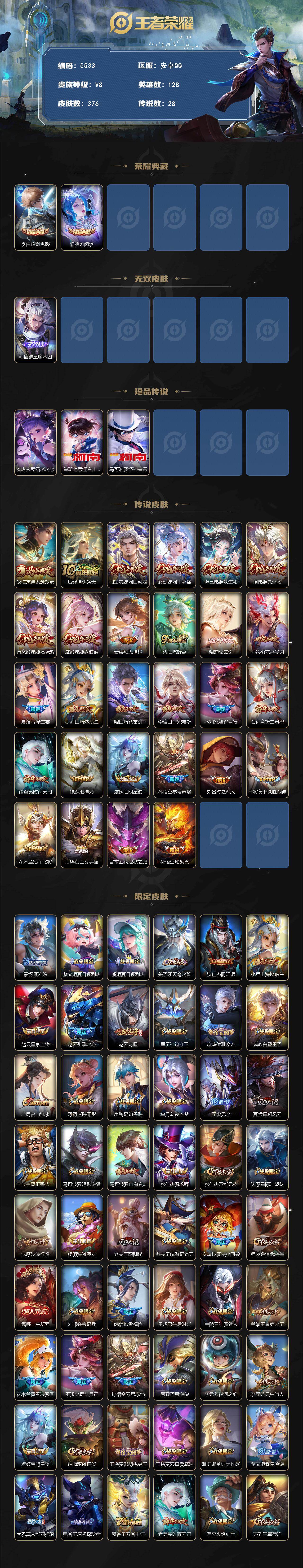 828-[17468438]贵族8-时间天幕-376皮-2典藏-1无双-3珍品传说-28传说-8全皮英雄-3改名卡-1灵宝改名卡 安卓手Q298区 营地ID539369818荣耀王者【珍品传说皮肤】:酷洛米之心,怪盗基德,江户川柯南【无双皮肤】:群星魔术团【荣耀典藏】:幻阙歌,鸣剑·曳影【优质限定皮肤】:祈雪灵祝,山海·琳琅生,山海·炽霜斩,山海·苍雷引,神威【传说皮肤】:神骥·赴朔漠,冠军飞将,久胜战神,神树通天,时之恋人,绯月行,愿照·福禄聚,黄金射手座,愿照·山河定,愿照·千秋盛,愿照·岁
