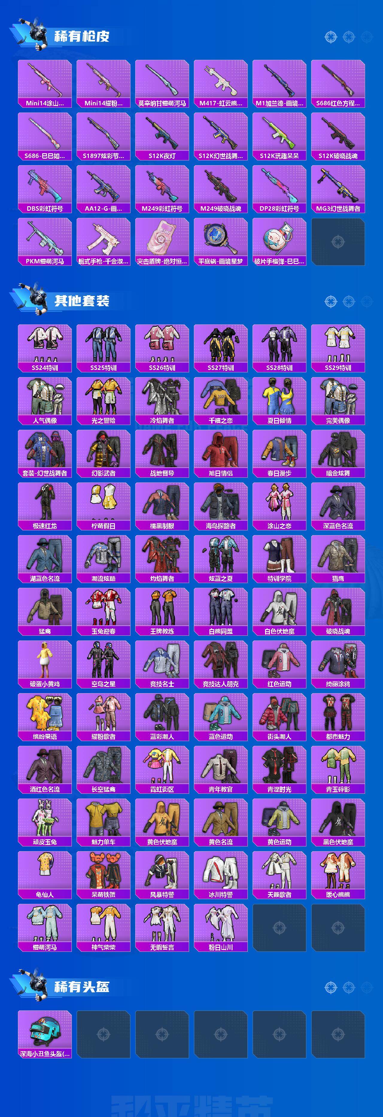 【粉色枪皮等级】:ACE32-萌骑漫游(五级),Kar98K-巳巳如意(五级),Mk14-福马献瑞(五级),M249-绝对恒星(四级),DP-28-千金淑猫(五级),DP-28-豹影疾电(五级)