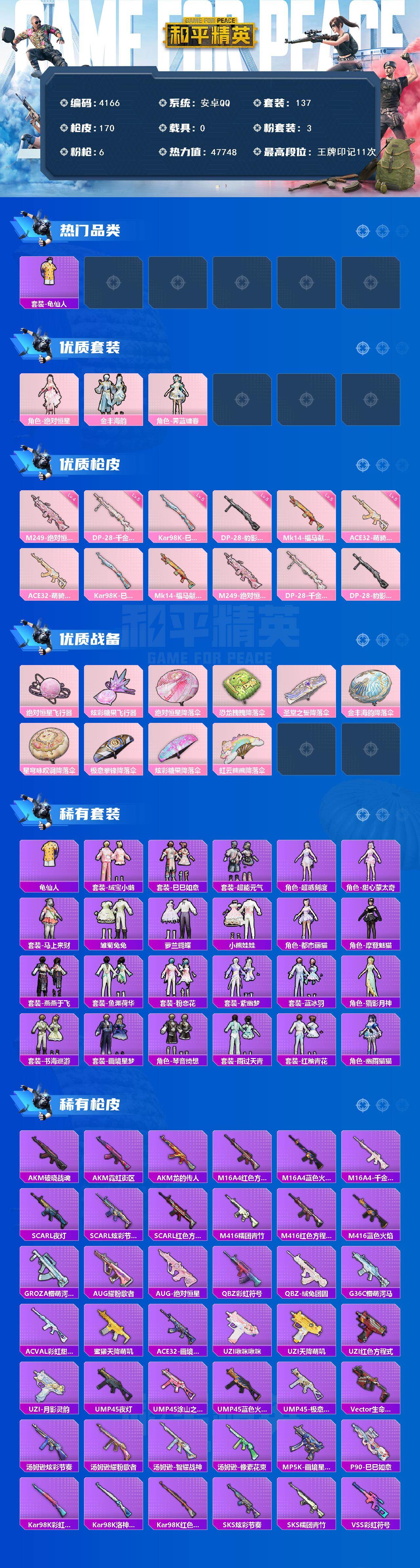 安卓 手Q-3粉装-6特效枪-0载具-2粉色飞行器-47748热力值-11王牌印记-137套装-170枪皮