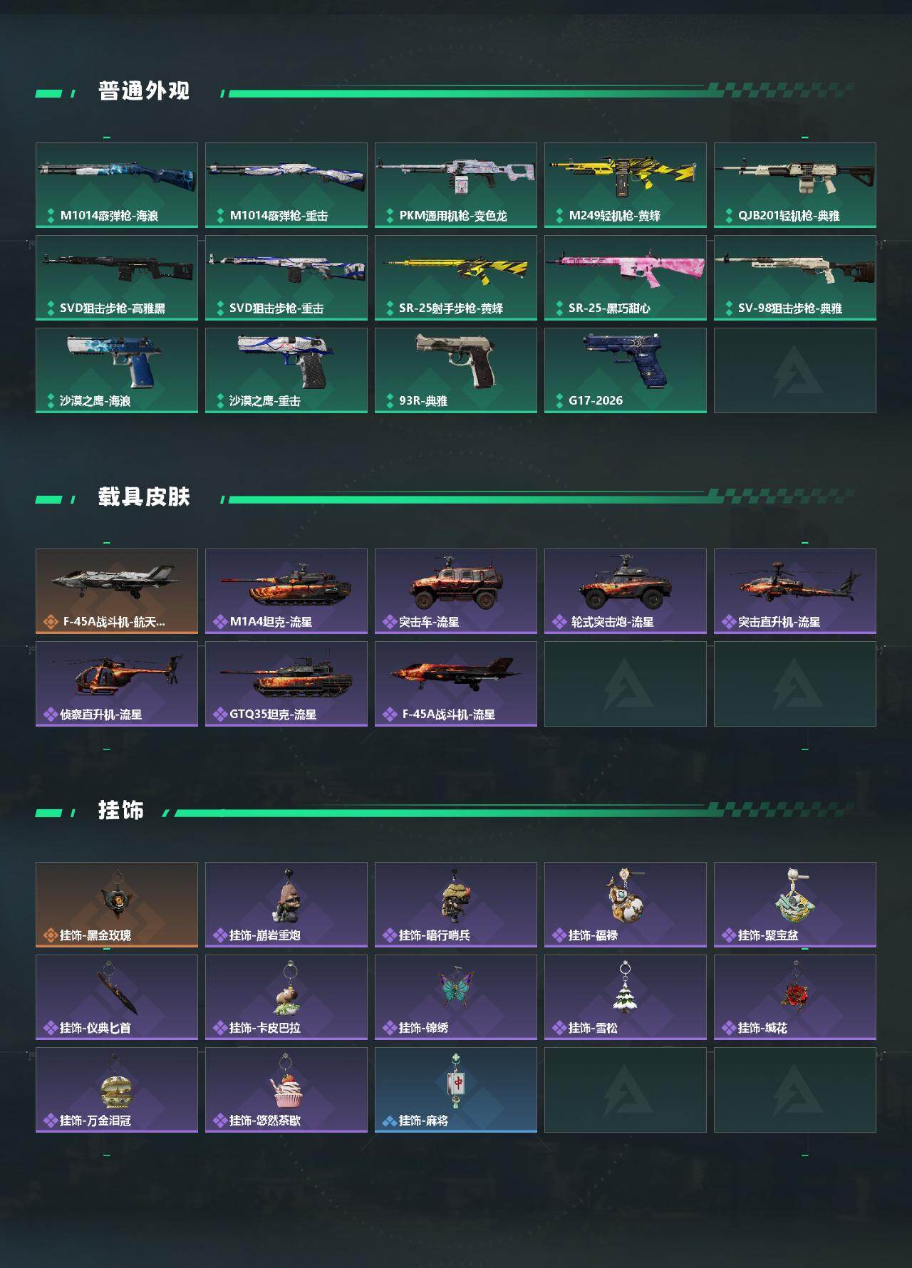 【传说外观】:M4A1突击步枪-蚀金玫瑰,AKM突击步枪-锦绣,AUG突击步枪-悠然茶歇,腾龙突击步枪-万金泪冠,K437突击步枪-锦绣,MK47突击步枪-悠然茶歇,UZI冲锋枪-悠然茶歇,SMG-45冲锋枪-锦绣,勇士冲锋枪-万金泪冠,M14射手步枪-蛮荒,M14射手步枪-缄花,SKS射手步枪-骑士,SR-25射手步枪-缄花,AWM狙击