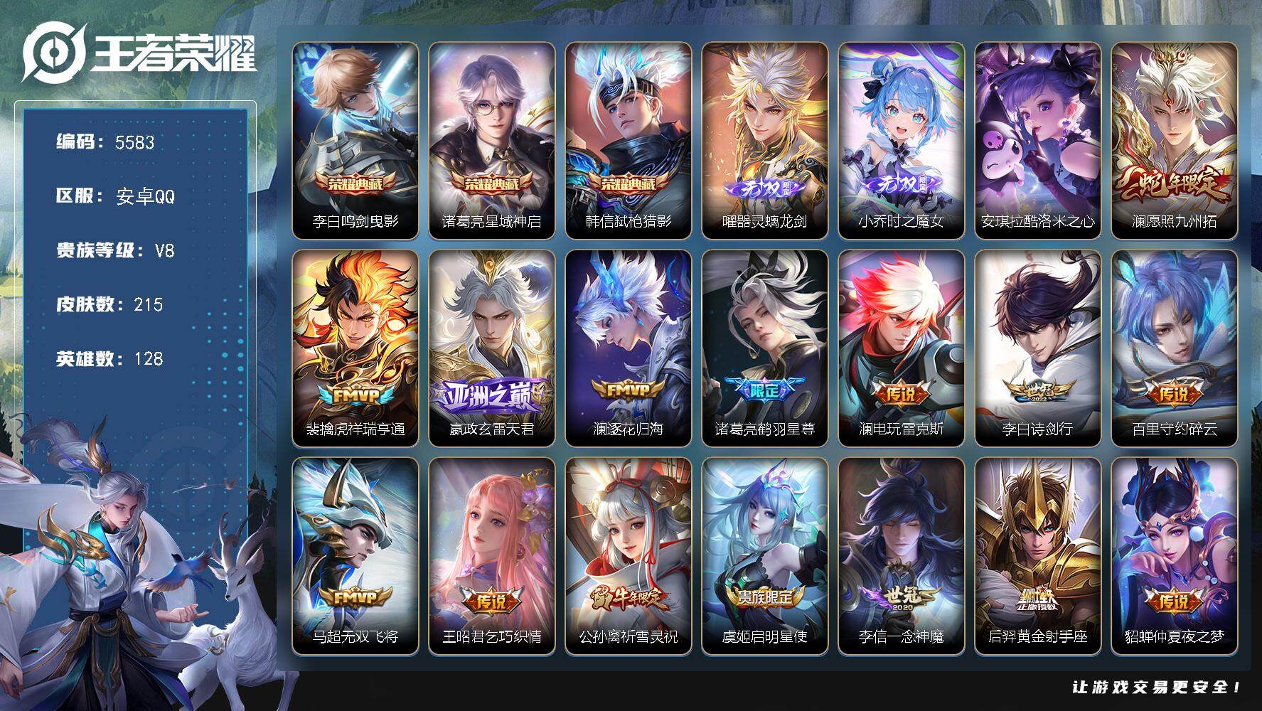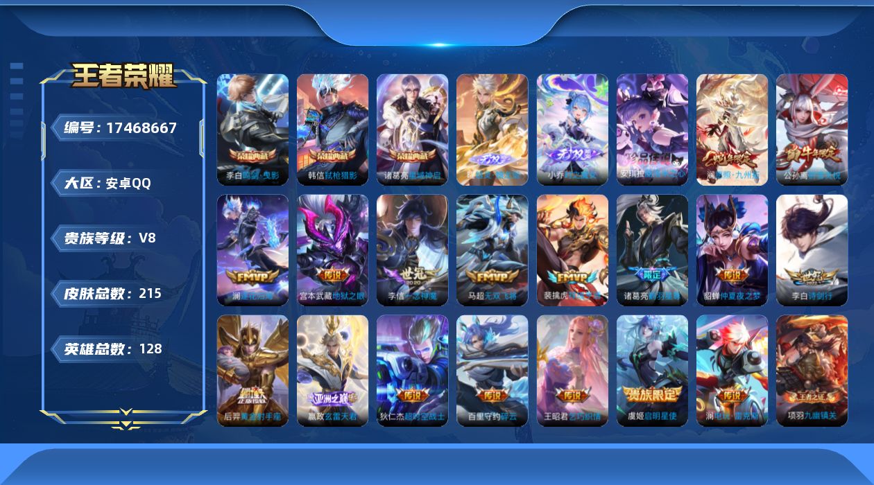 454-[17468667]可二次 贵族8-打野45段-贵族积分82407-215皮-3典藏-2无双-1珍品传说-17传说-2全皮英雄-2改名卡-1灵宝改名卡 安卓手Q436区 营地ID1602473052至尊星耀V【珍品传说皮肤】:酷洛米之心【无双皮肤】:时之魔女,器灵·螭龙剑【荣耀典藏】:星域神启,弑枪猎影,鸣剑·曳影【优质限定皮肤】:神威,无双飞将,祈雪灵祝【传说皮肤】:乞巧织情,超时空战士,诗剑行,逐花归海,地狱之眼,碎云,仲夏夜之梦,无双飞将,一念神魔,鹤羽星尊,玄雷天君,祈雪灵祝,黄