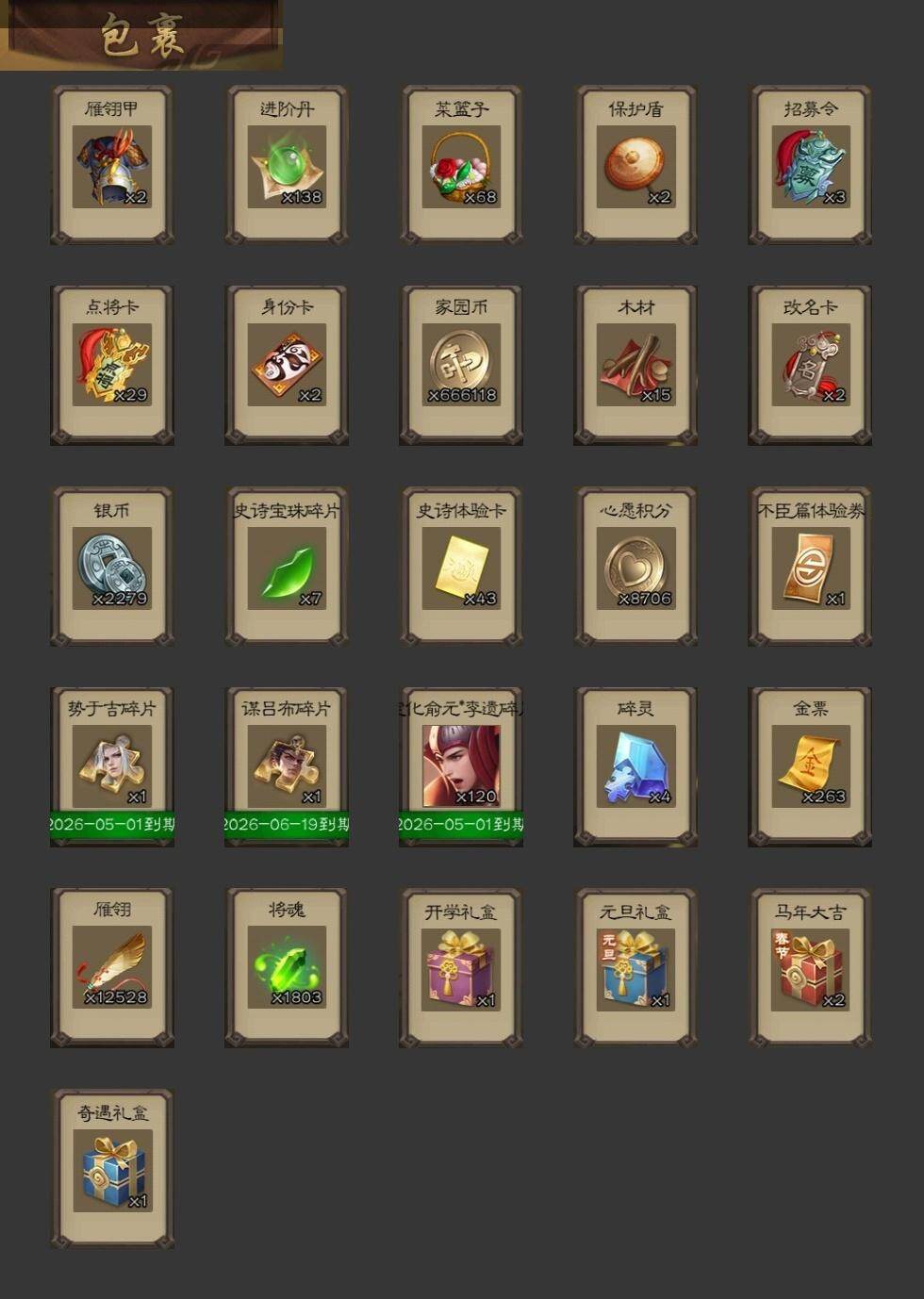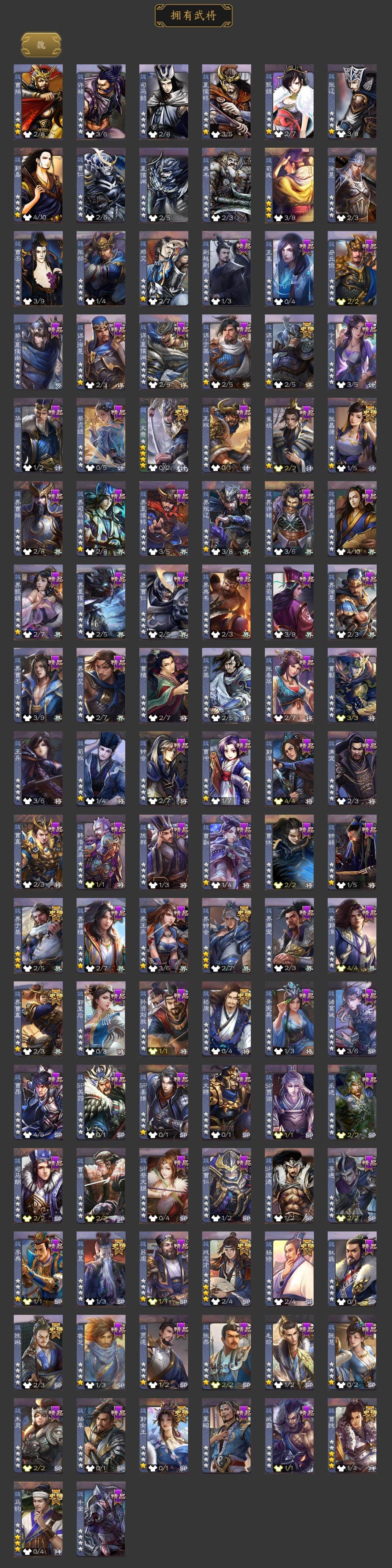【293】官阶:大将军;VIP等级:VIP12;史诗武将数量:65;动态皮肤数量:38;武将总数:425;史诗宝珠数量:0;将魂数量:1803;神将:10;魏国史诗武将:12;蜀国史诗武将:12;吴国史诗武将:11;群史诗武将:21