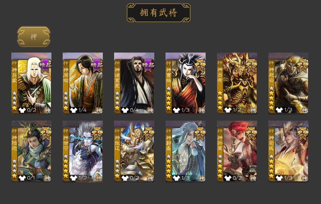 神曹操,神吕布,神赵云,神陆逊,神甘宁,神张辽,神郭嘉,神孙策,神荀彧,神诸葛亮,郭女王,谋曹仁,张昌蒲,杨修,马钧,界钟会,界于禁,界曹真,嵇康,陈琳,曹纯,戏志