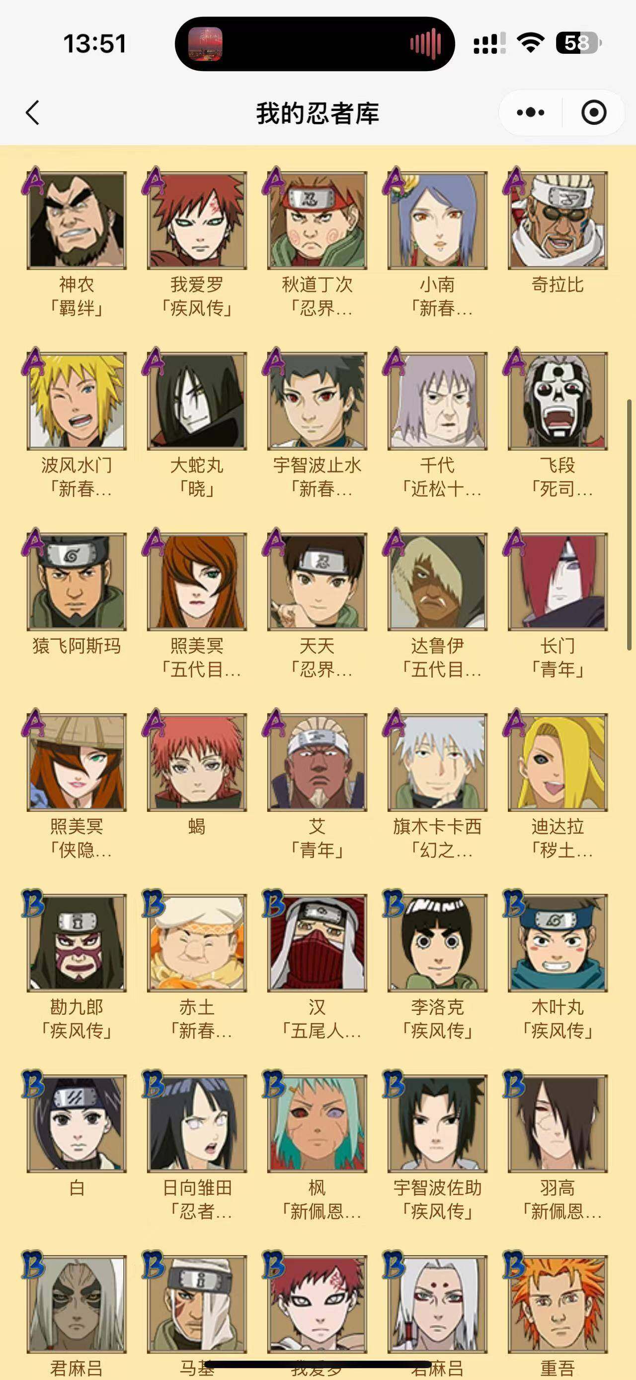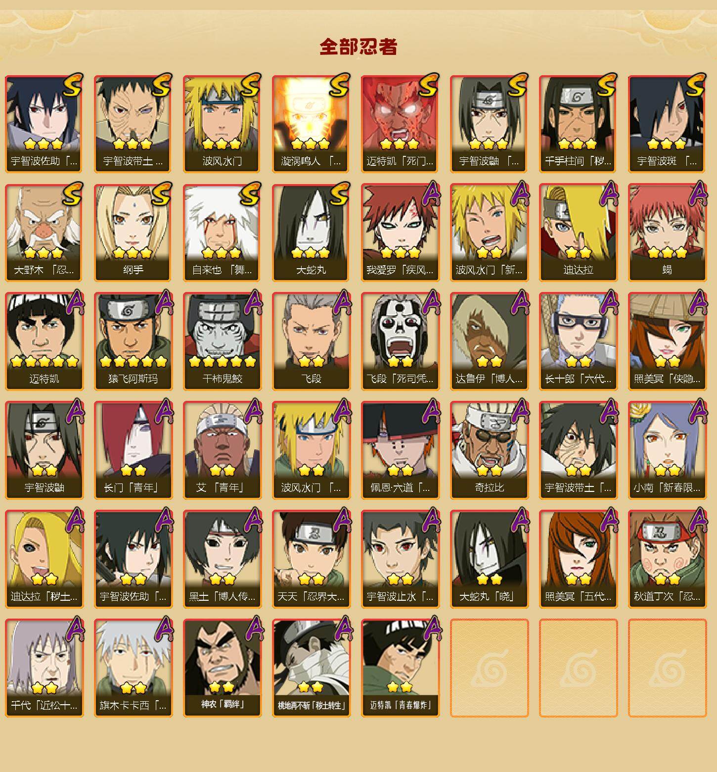 【S级忍者】:千手柱间「秽土转生」(3星),大野木「忍界大战」(3星),宇智波带土「忍界大战」(3星),宇智波鼬「须佐能乎」(3星),宇智波斑「木叶创立」(3星),自来也「舞之豪杰」(3星),大蛇丸(3星),纲手(3星),波风水门(3星),漩涡鸣人「九喇嘛连结」(3星),迈特凯「死门」(3星),宇智波佐助「永恒万花筒」(3星)