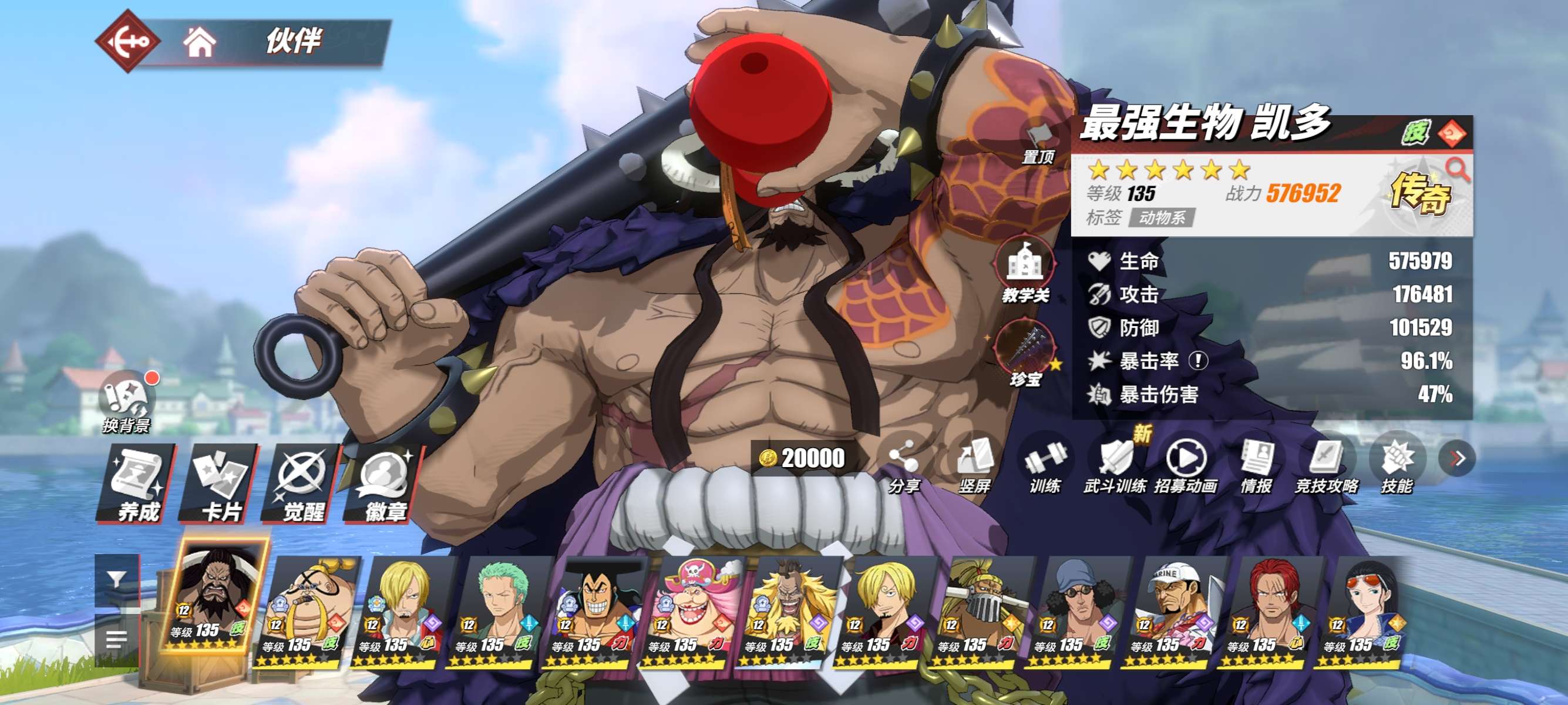 6892万战力。3个98友情技。雷神船35艘船。尼卡路飞76传奇12强者。6星珍宝凯多 红发 大