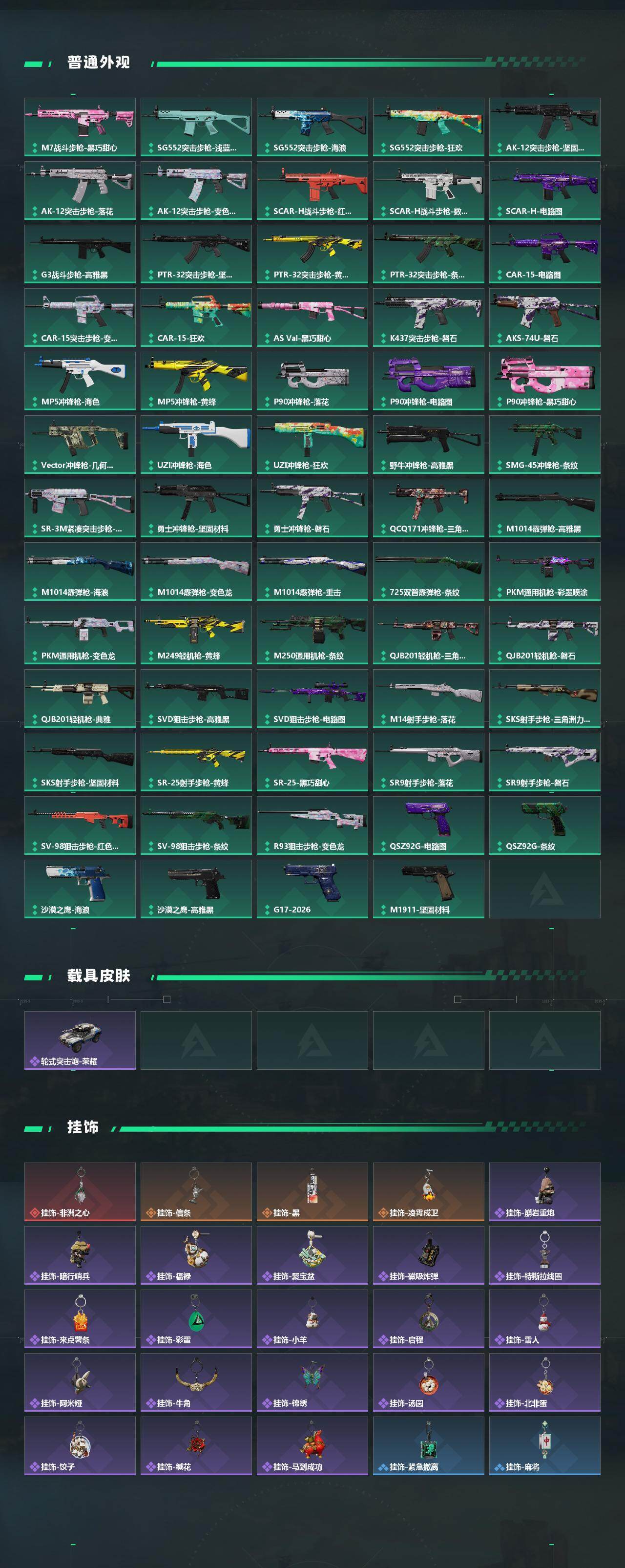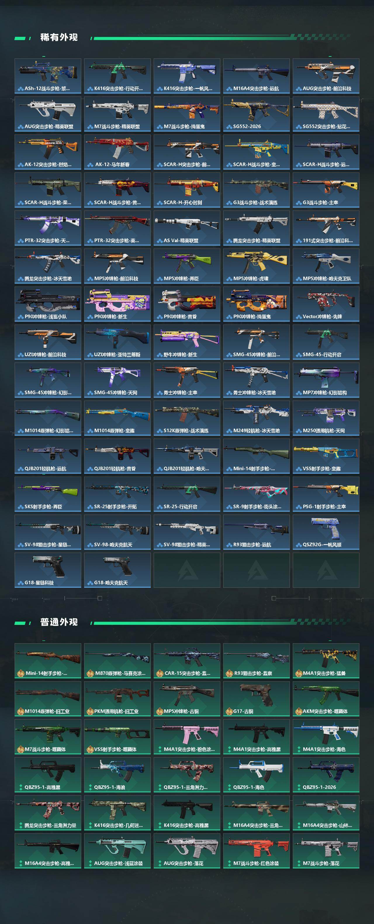 【传说外观】:M4A1突击步枪-阿米娅,AKM突击步枪-锦绣,SG552突击步枪-运动员,AK-12突击步枪-夜鹰,AK-12突击步枪-特斯拉线圈,SCAR-H战斗步枪-