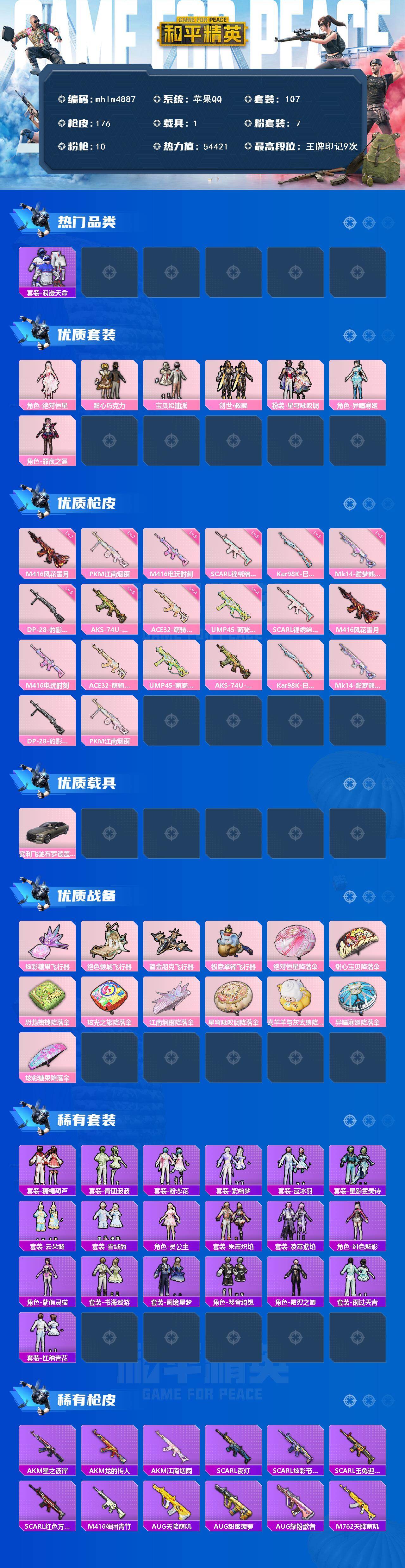 【mhlm4887】苹果 手Q-7粉装-10特效枪-1载具-4粉色飞行器-54421热力值-9王牌印记-107套装-176枪皮