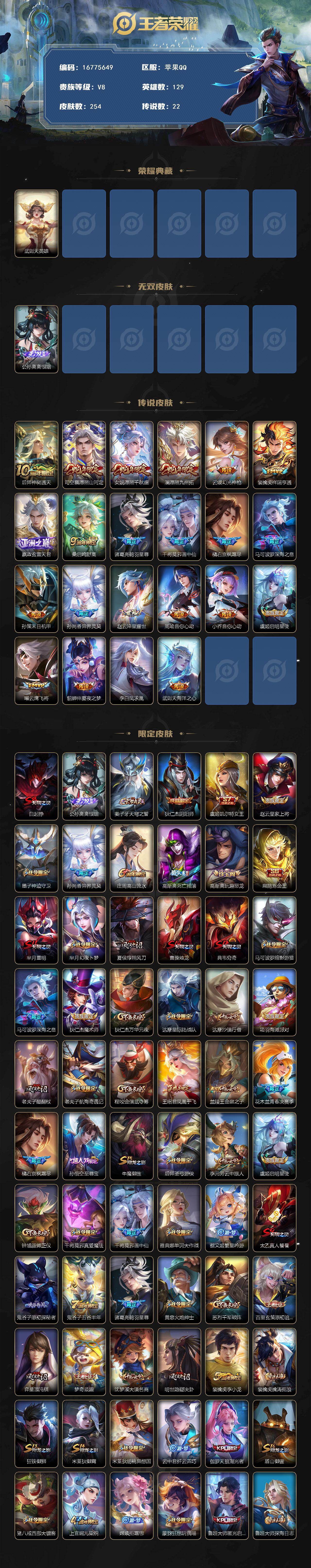【16775649】苹果Q-V8-至尊星耀II段位-129英雄-254皮肤-1典藏英雄-1无双-22传说-55史诗