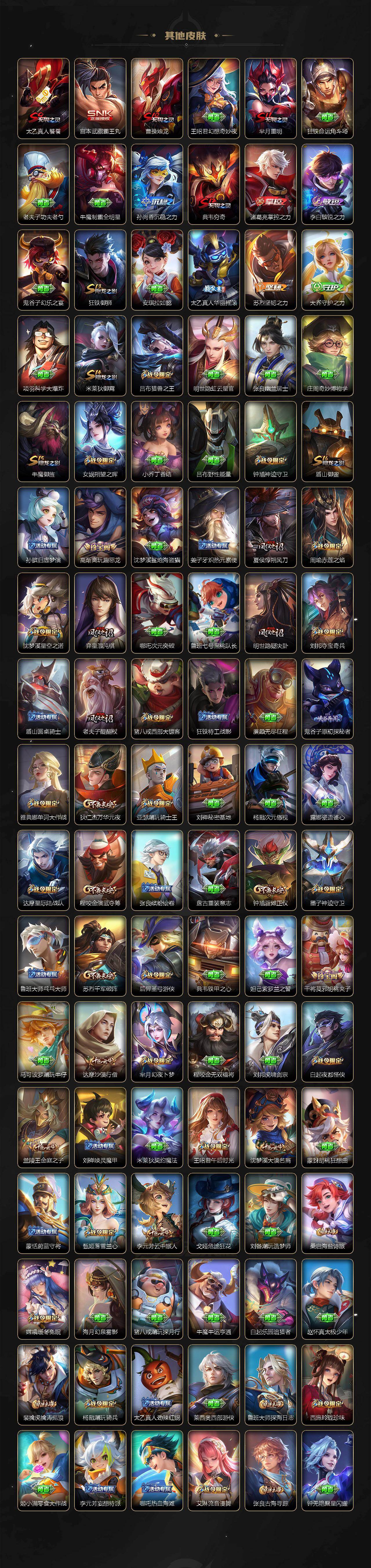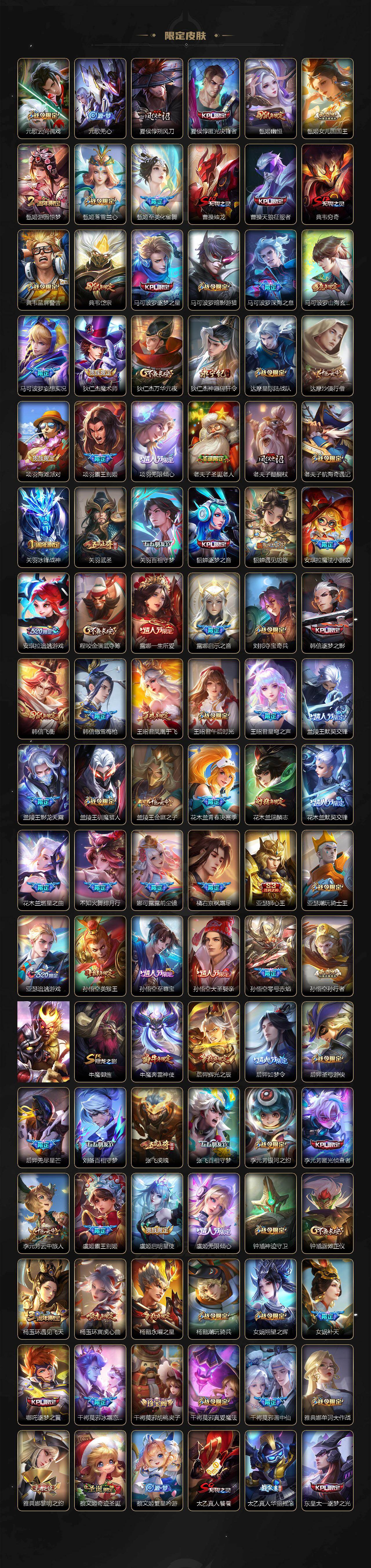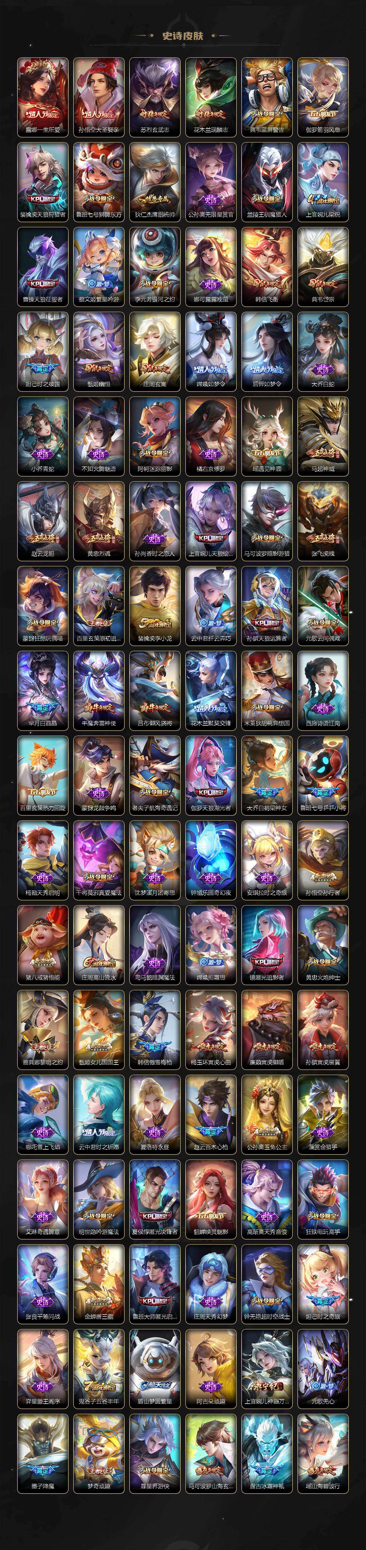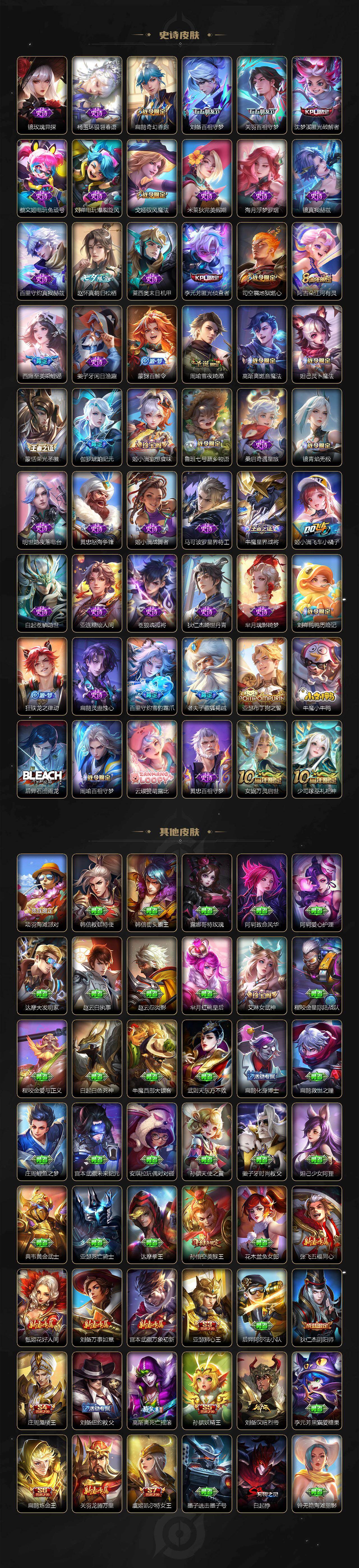 【英雄全皮】:庄周全皮,刘禅全皮,高渐离全皮,扁鹊全皮,白起全皮,典韦全皮,宫本武藏全皮,狄仁杰全皮,达摩全皮,武则天全皮,程咬金全皮,露娜全皮,姜子牙全皮,刘邦全皮,孙权全皮,花木兰全皮,张良