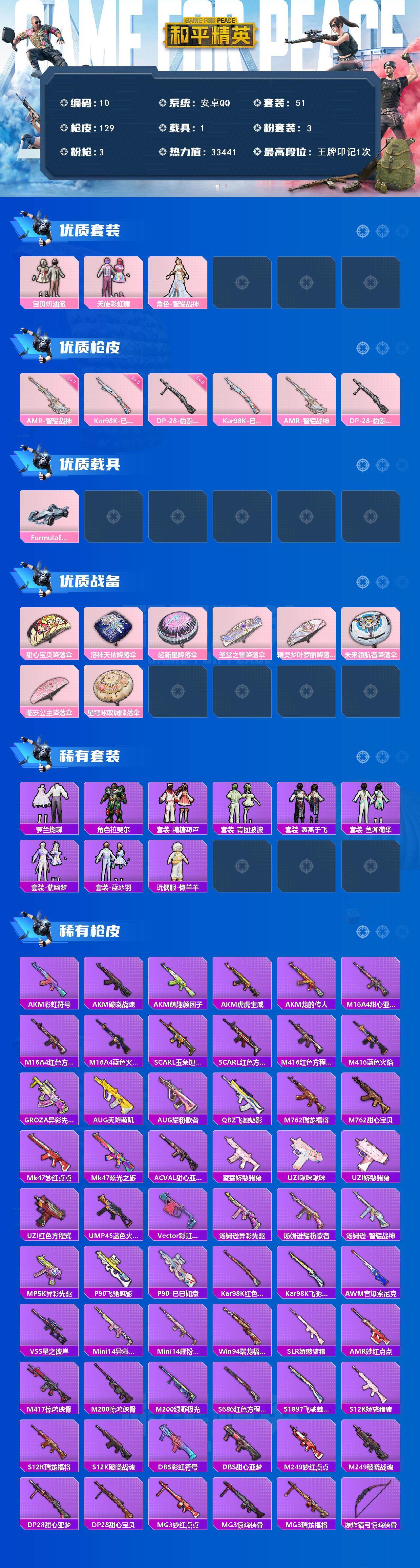 安卓 手Q-3粉装-3特效枪-1载具-0粉色飞行器-33441热力值-1王牌印记-51套装-129枪皮