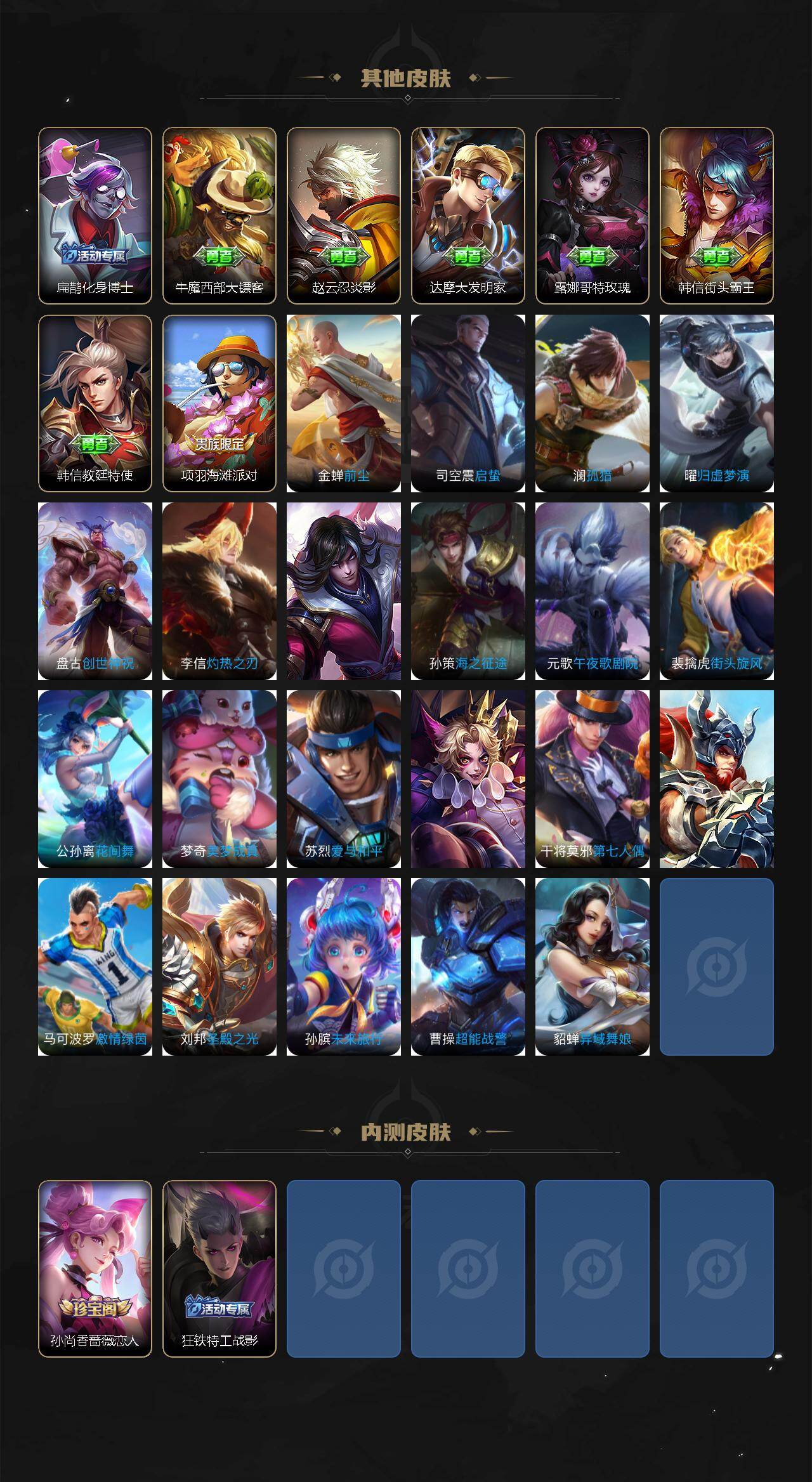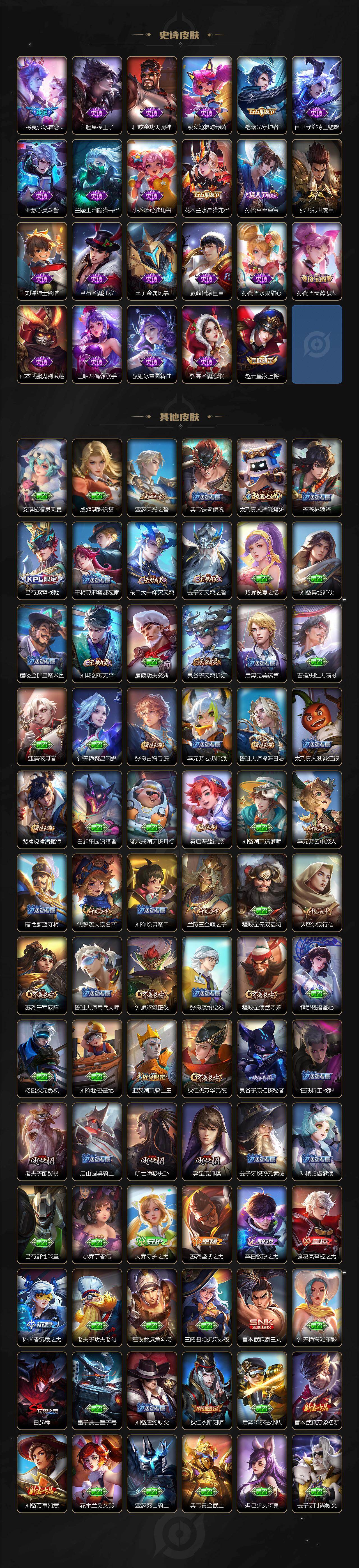【限定皮肤】:白起狰,姜子牙天穹之誓,狄仁杰阴阳师,赵云皇家上将,孙尚香蔷薇恋人,元歌云间偶戏,元歌无心,狄仁杰万华元夜,达摩沙漠行僧,项羽海滩派对,老夫子醍醐杖,程咬金演武夺筹,兰陵王金庭之子,亚瑟潮玩骑士王,孙悟空至尊宝,李元芳云中旅人,钟馗驱傩正仪,干将莫邪冰霜恋舞曲,蔡文姬繁星吟游,鬼谷子原初探秘者,鬼