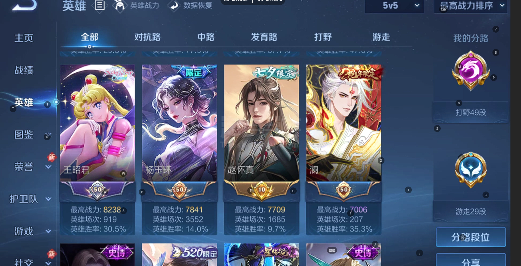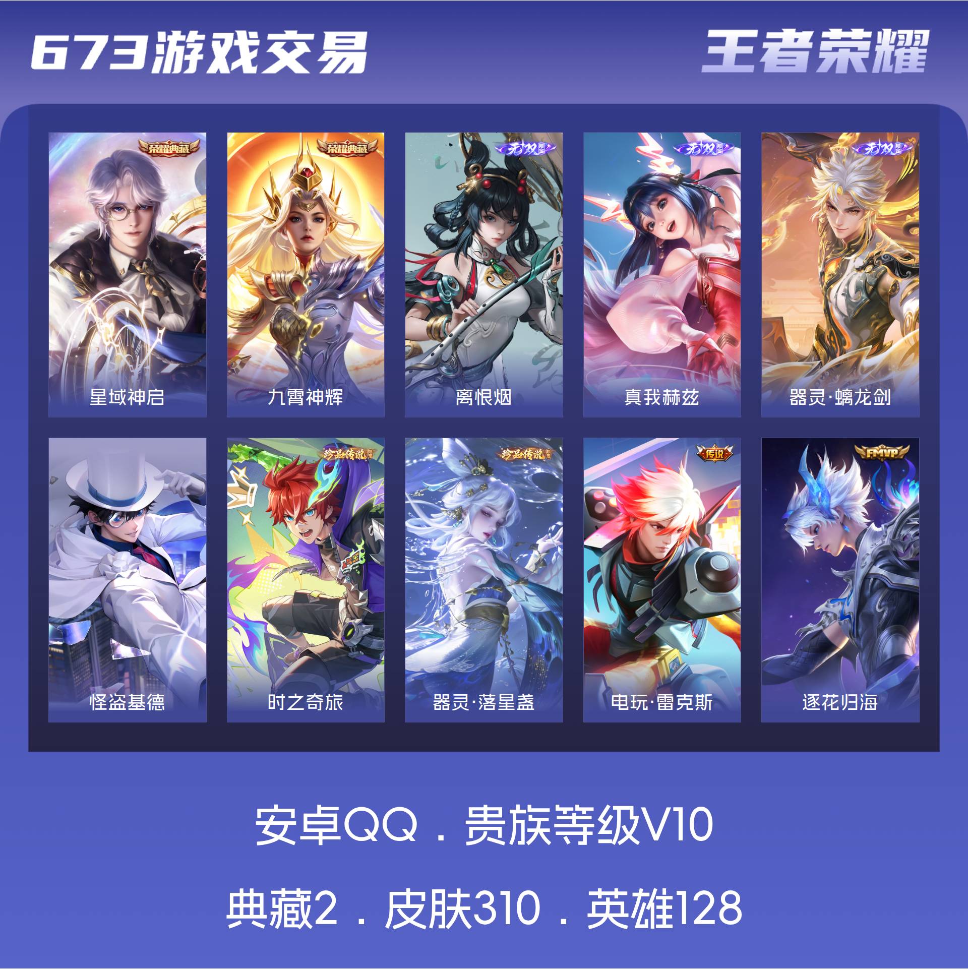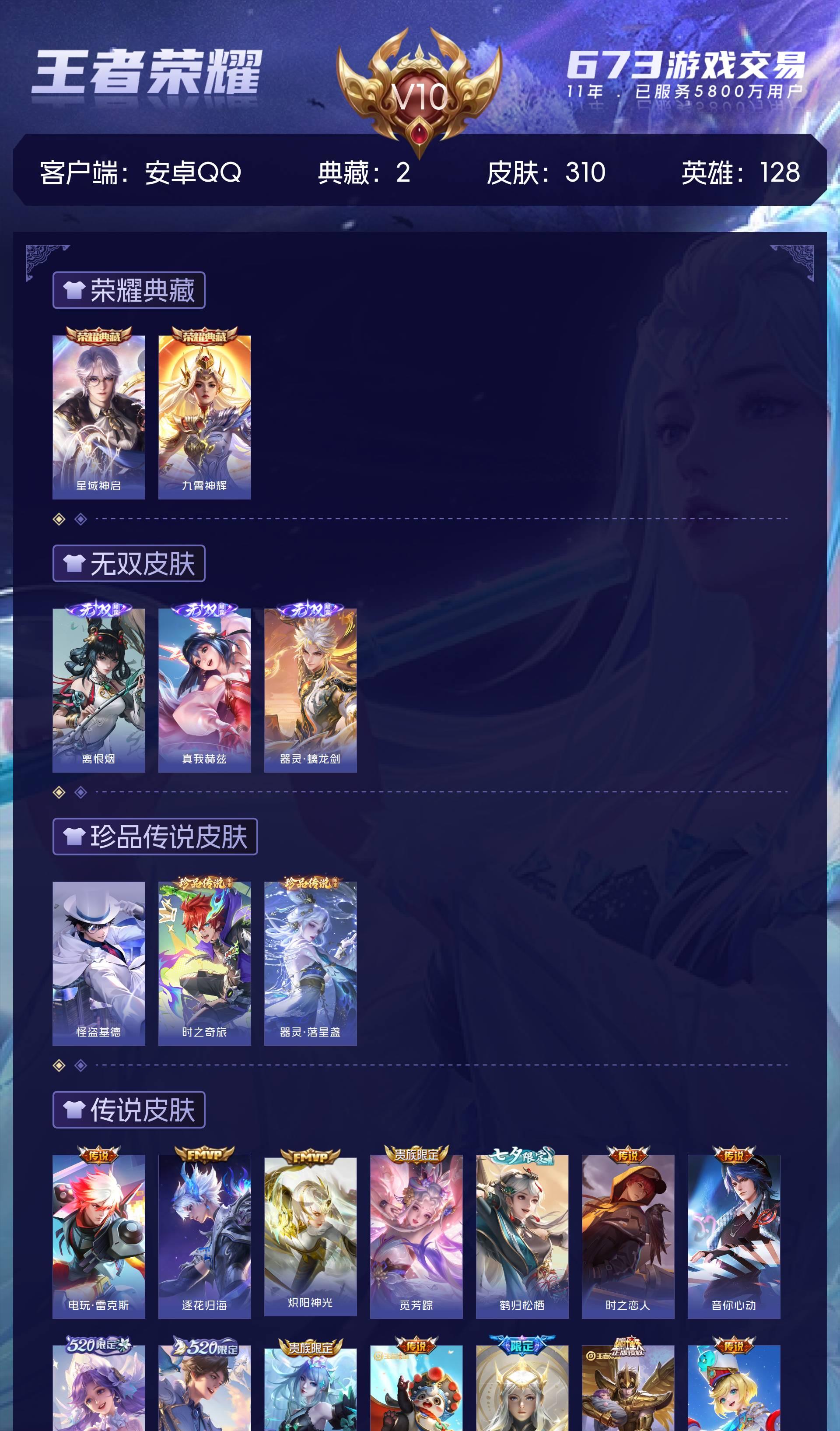 安Q 可二次 v10 皮肤310 英雄128 最强王者 荣耀典藏2 无双皮肤3 珍品传说3 传说413天幕 2星元 夺宝积分268 小国云樱 万战阿古朵 打野49段 游走29段 其他皮肤268-