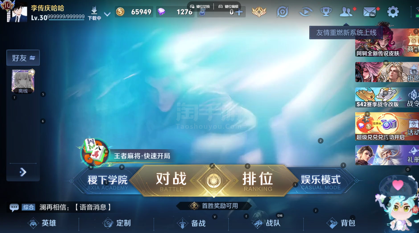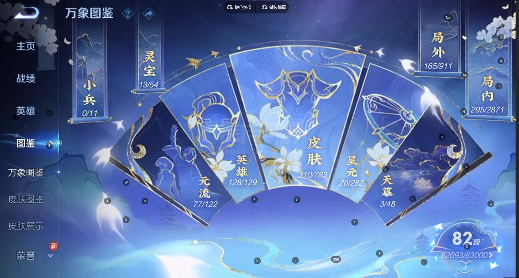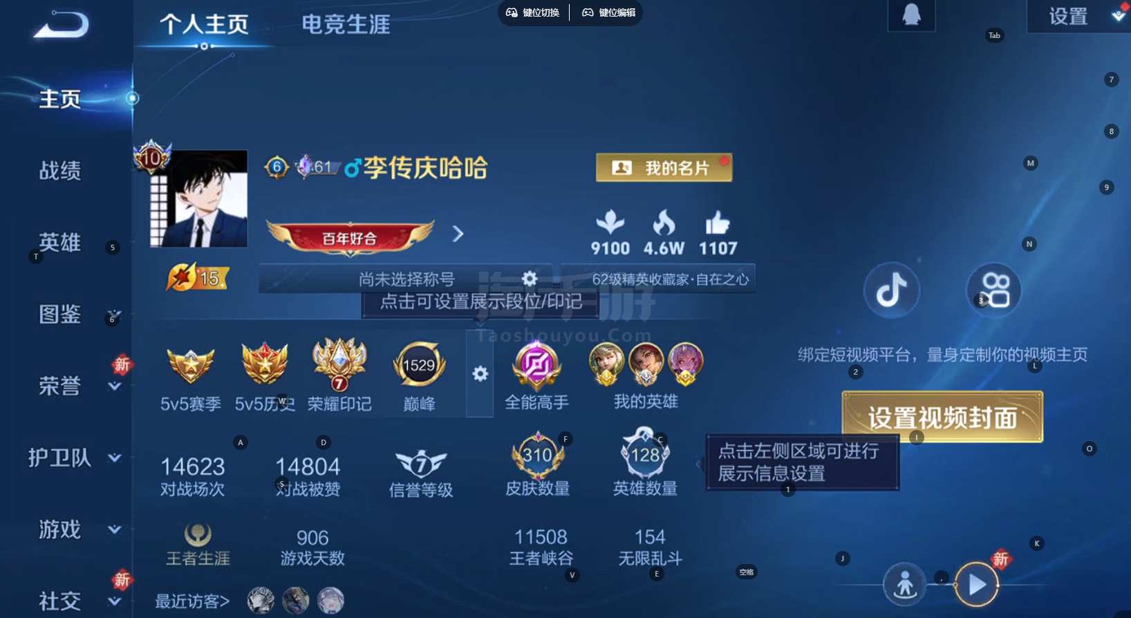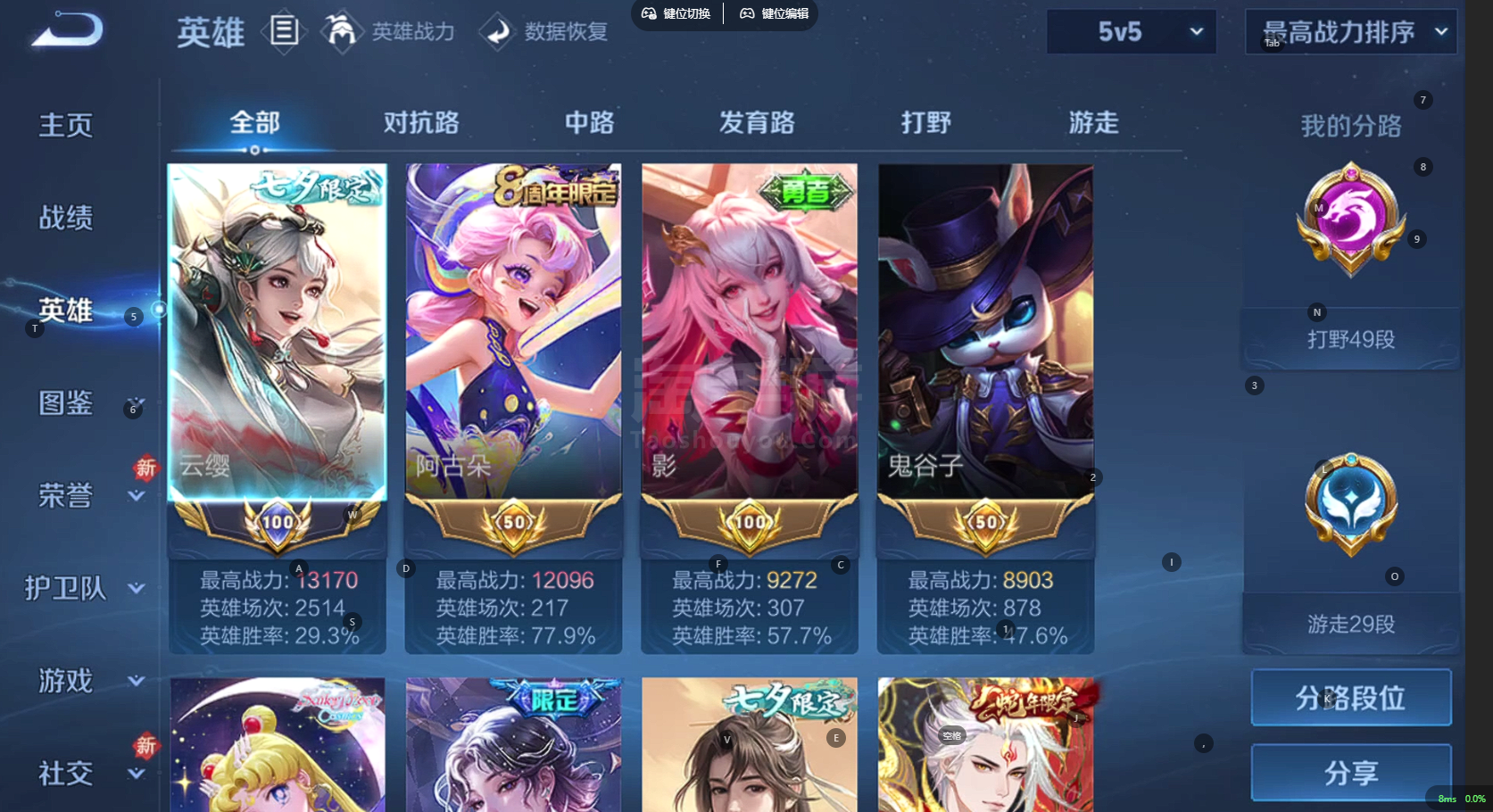 安Q 可二次 v10 皮肤310 英雄128 最强王者 荣耀典藏2 无双皮肤3 珍品传说3 传说413天幕 2星元 夺宝积分268 小国云樱 万战阿古朵 打野49段 游走29段 其他皮肤268-