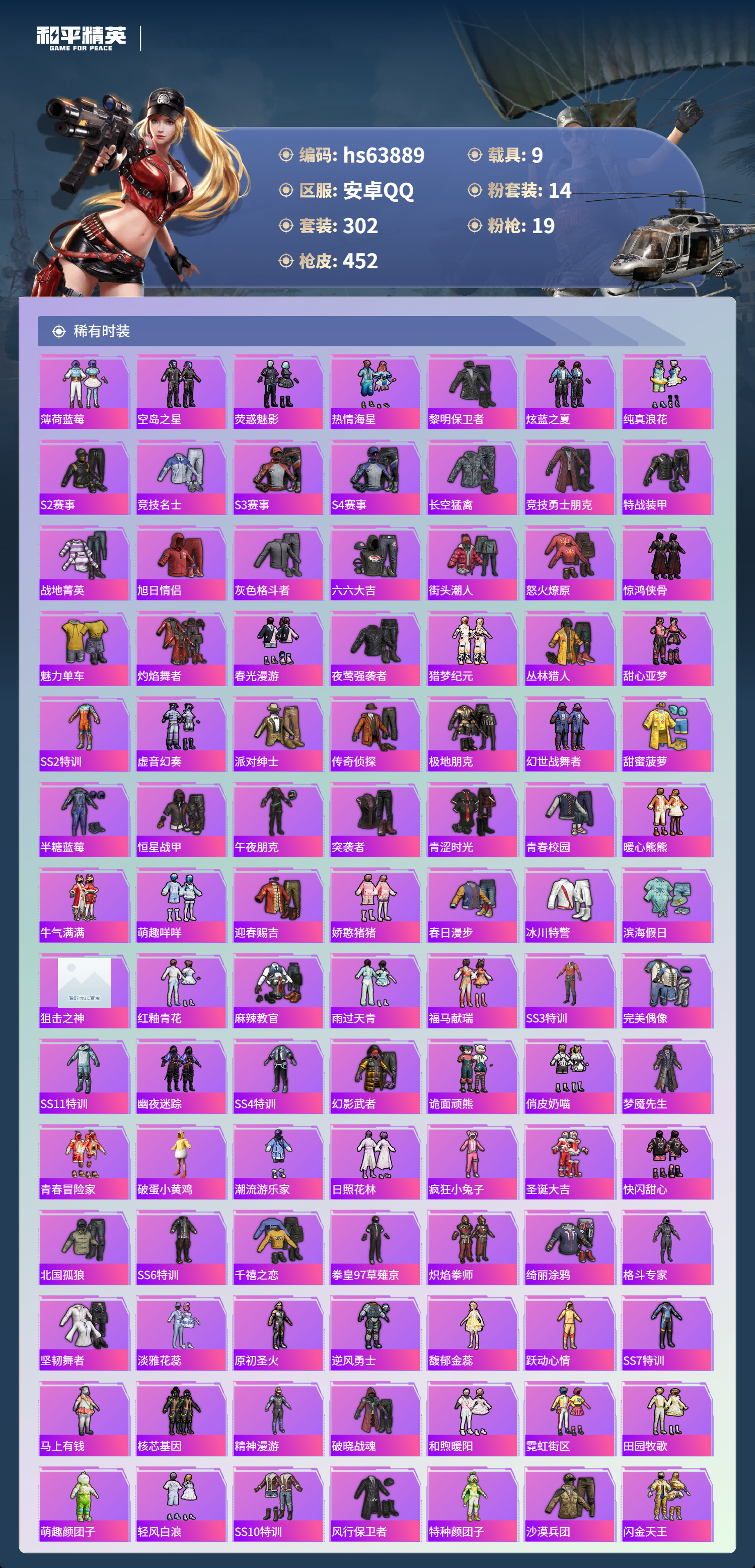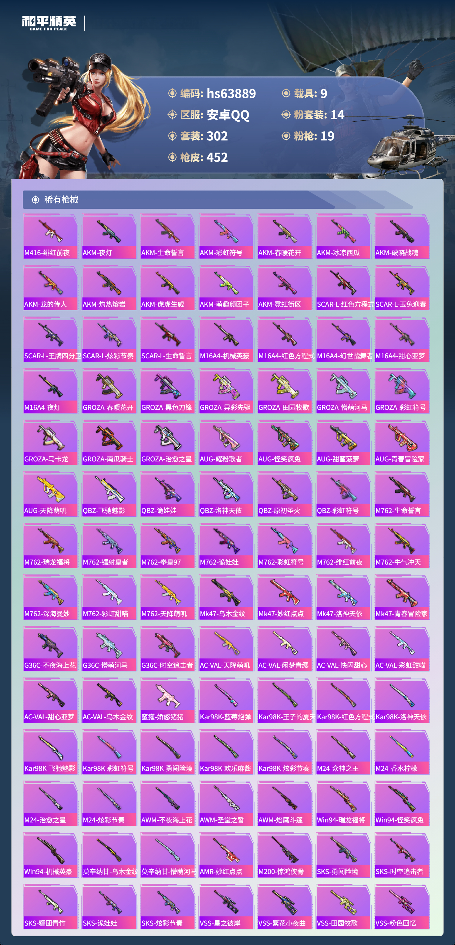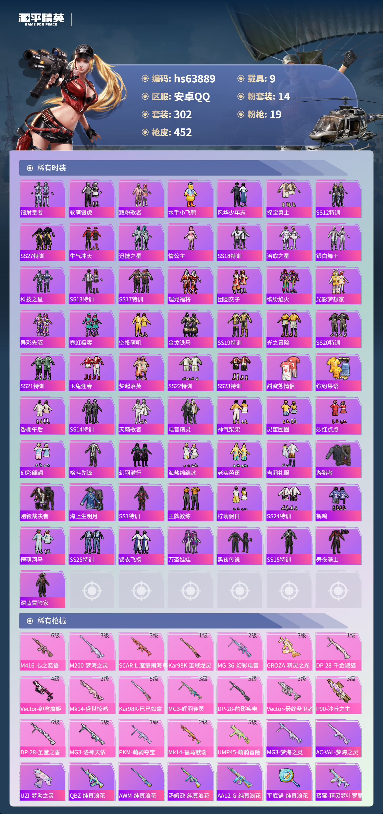 hs63889 安卓手Q-40王牌印记-5红装-14粉装-19特效枪-9载具-热力值-302套装-452枪皮-10卓越印记-9传奇印记