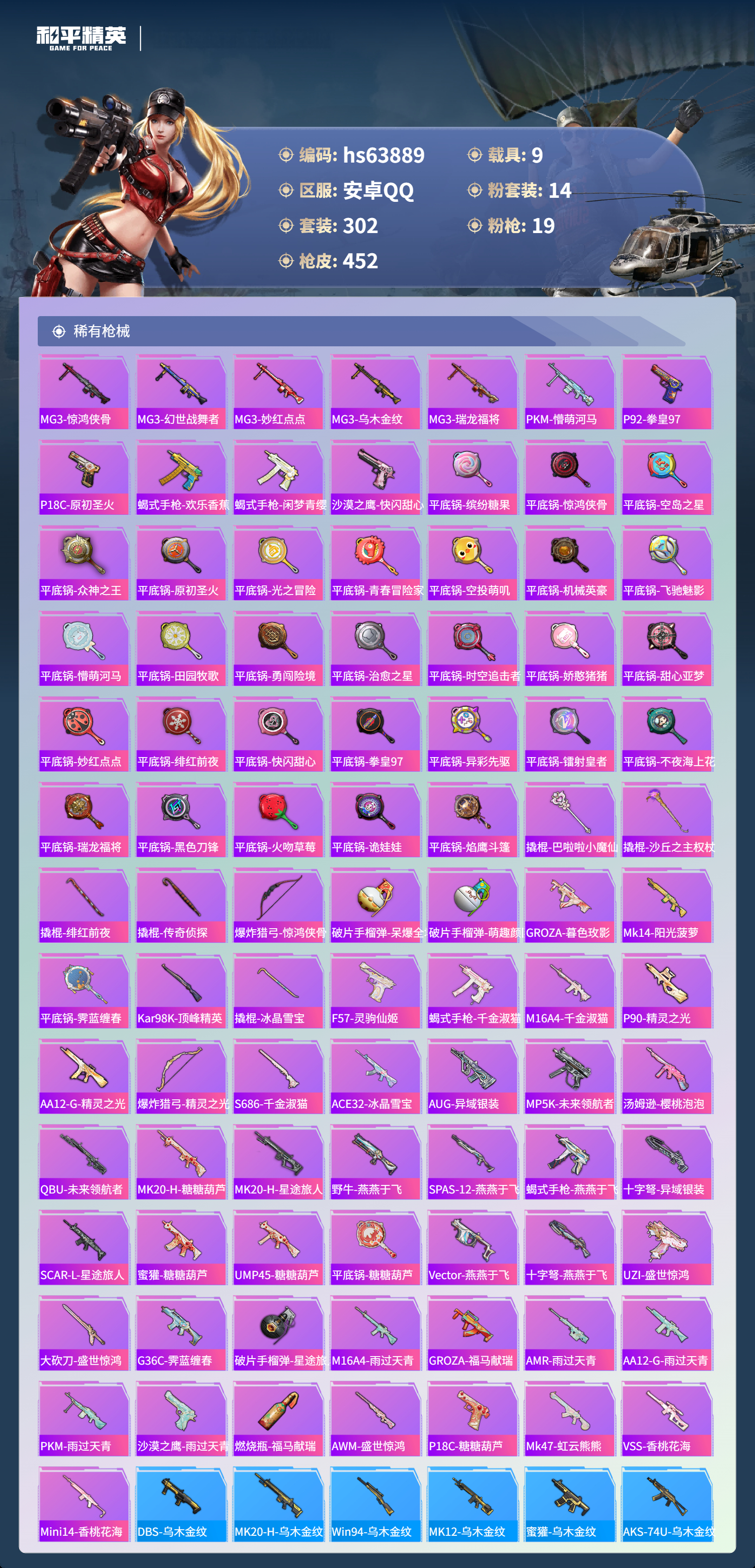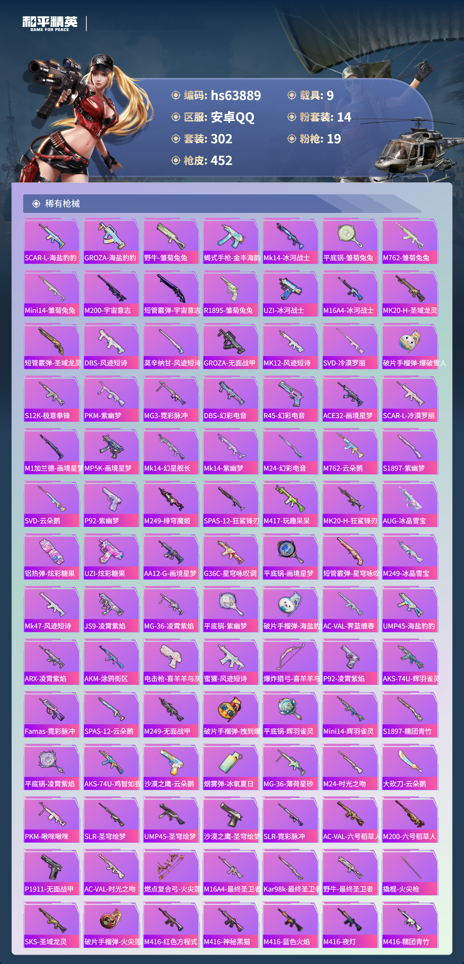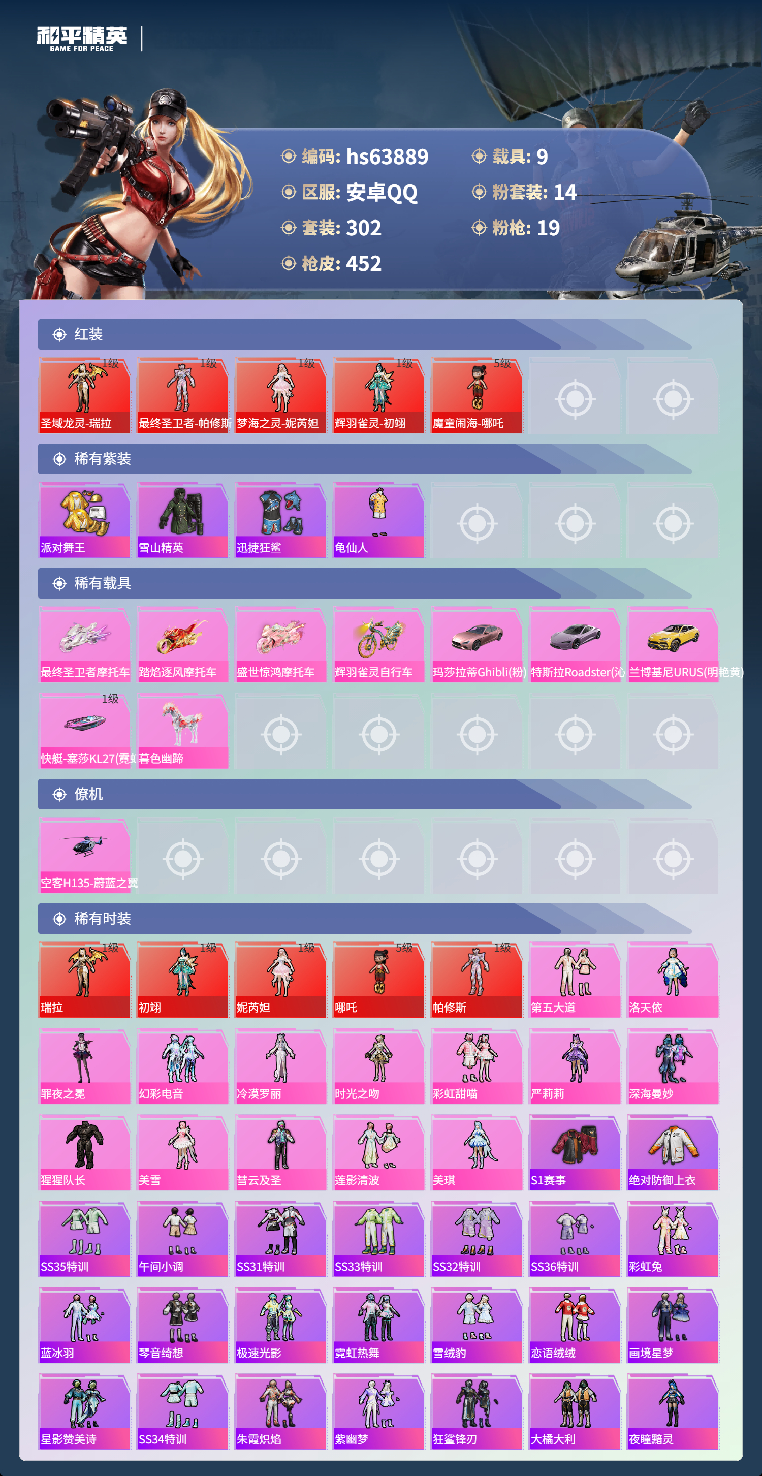 hs63889 安卓手Q-40王牌印记-5红装-14粉装-19特效枪-9载具-热力值-302套装-452枪皮-10卓越印记-9传奇印记