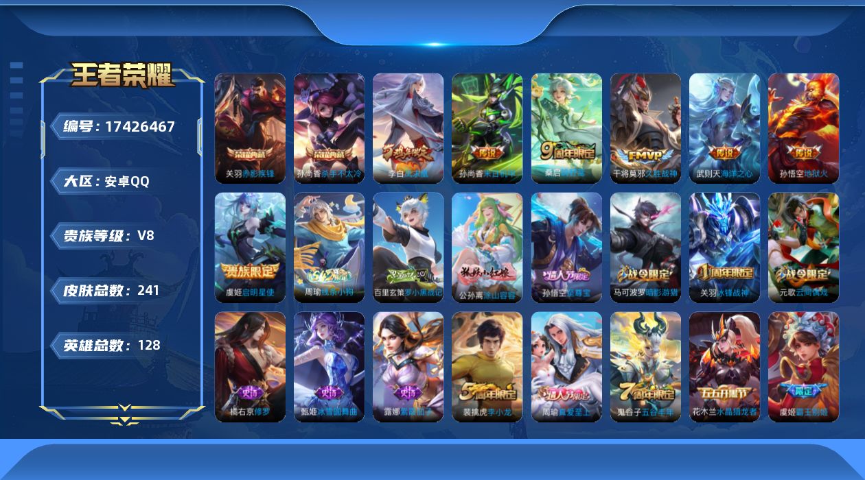 【精品号手慢无】3月11日可换绑,消耗任意点券恢复v8,王者印记17,星币4408,荣耀典藏武则天,杀手不太冷,赤影疾锋,传说皮久胜战神,末日机甲-孙尚香,地狱火,海洋之心,启明星使,限定皮冰锋战神,遇见飞天,李小龙,游园惊梦,梁祝,逐梦之影,凤求凰,至尊宝,真爱至上,霸王别姬-项羽,霸王别姬-虞姬,高山流水,五谷丰年,鸣野蒿