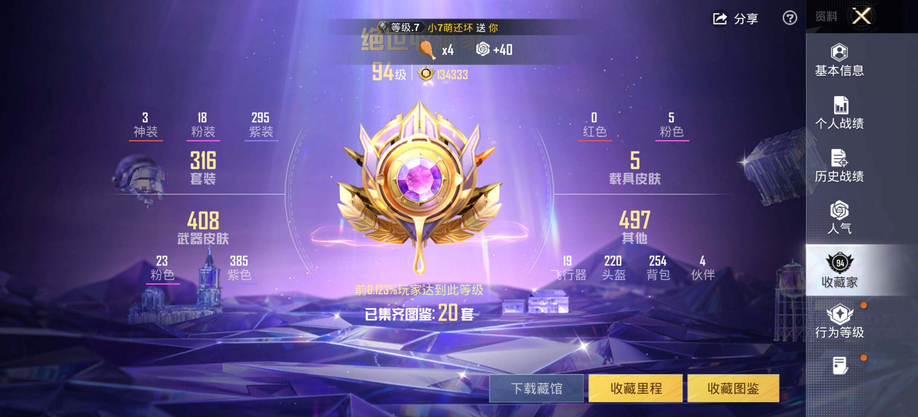 无敌战神框-3神装-18粉装-23特效枪-5载具-12粉色飞行器-162613热力值-20王牌印记-316套装-448枪皮