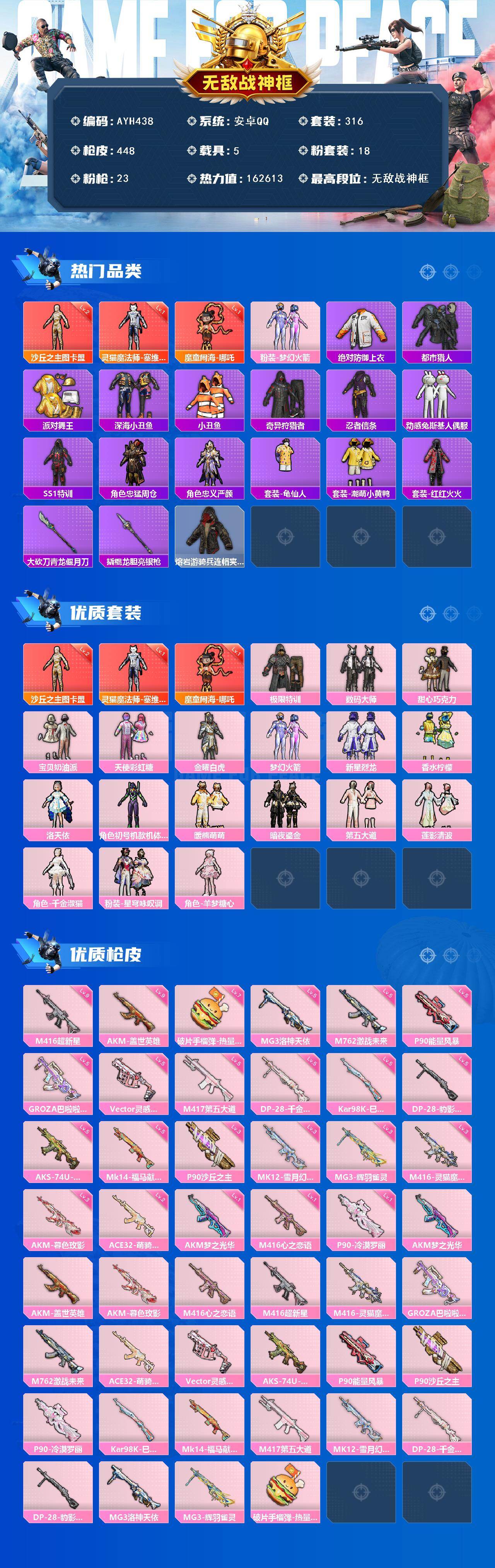 【店主推荐捡漏号】安卓 手Q-无敌战神框-3神装-18粉装-23特效枪-5载具-12粉色飞行器-162613热力值-20王牌印记-316套装-448枪皮【红色神装等级】:魔童闹海-哪吒(一级),灵猫魔法师-塞维尔(一级),沙丘之主-图卡盟(二级)【红色角色神装】:魔童闹海-哪吒,灵猫魔法师-塞维尔,沙丘之主-图卡盟【热门品类】:粉装-梦幻火箭,绝对防御上衣,套装-都市猎人,套装-派对舞王,套装-深海小丑鱼,套装-小丑鱼,套装-奇异狩猎者,套装-忍者信条,套装-动感兔斯基人偶服,套装-SS1特训,