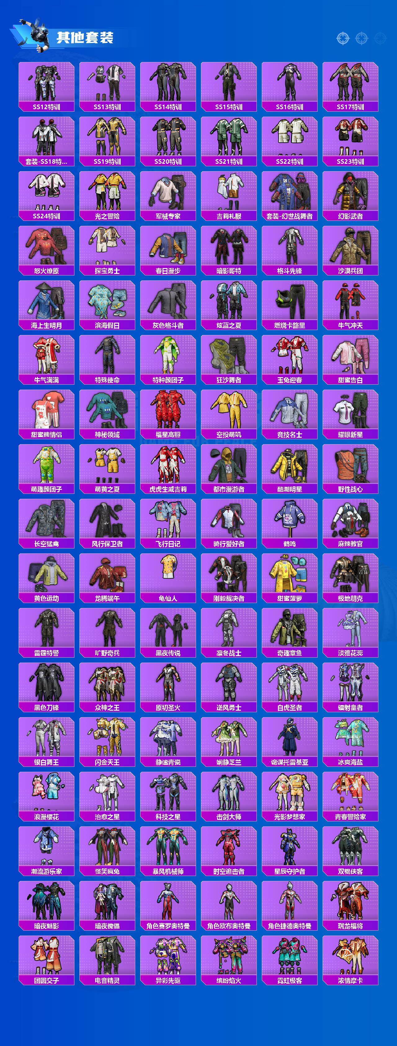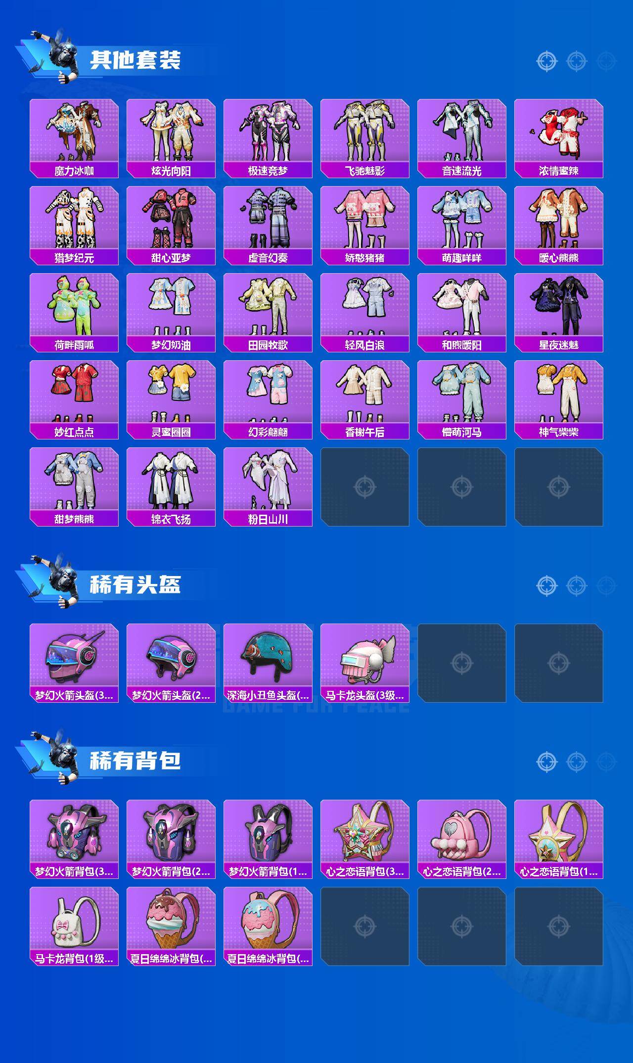 【粉色套装】:粉装-梦幻火箭,粉装-银刃赛罗,粉装-炙焰红王,粉装-显圣真君,粉装-焰龙焚天,粉装-银龙傲海,粉装-暗夜玫瑰,粉装-彩虹鹿灵,粉装-吟月归客,粉装-赤焰黑爵,粉装-紫电风暴,粉装-