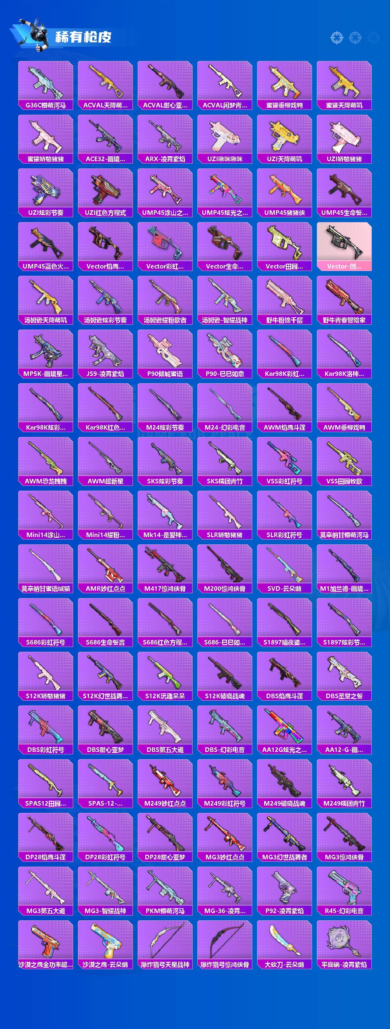 【粉色枪皮等级】:AKM-绿萝繁花(五级),GROZA-镜光银凌(五级),AUG-暖羊咩咩(五级),AKS-74U-森灵之息(五级),