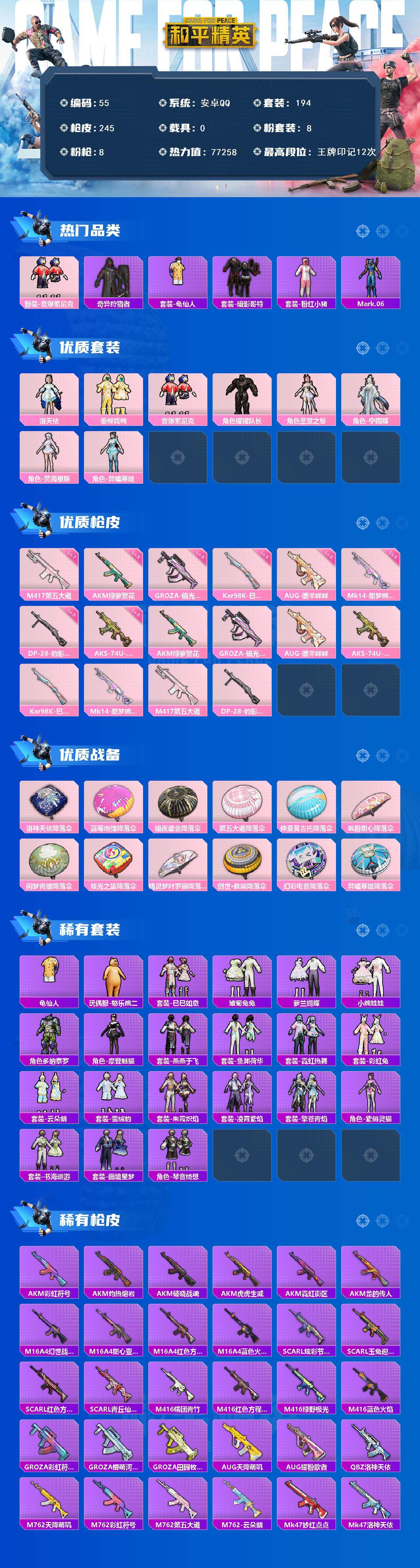 安卓 手Q-8粉装-8特效枪-0载具-1粉色飞行器-77258热力值-12王牌印记-194套装-245枪皮