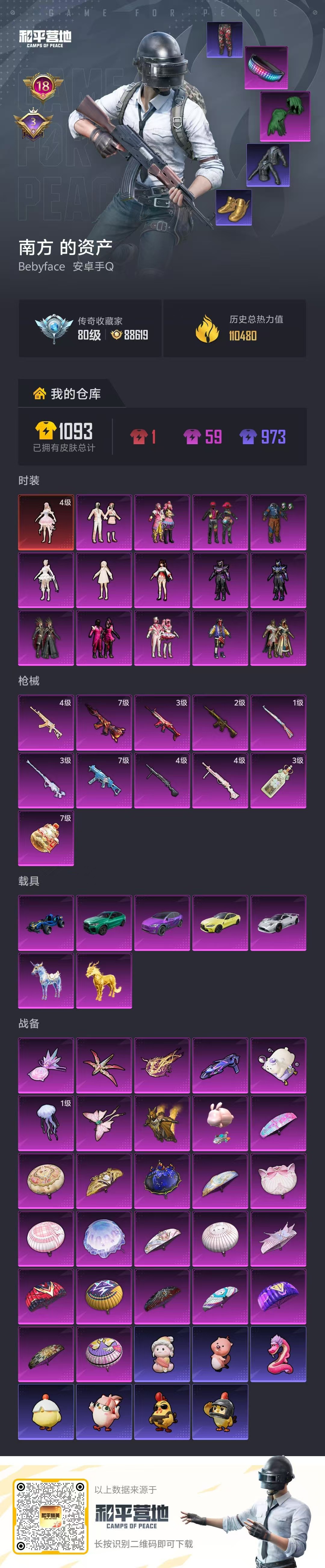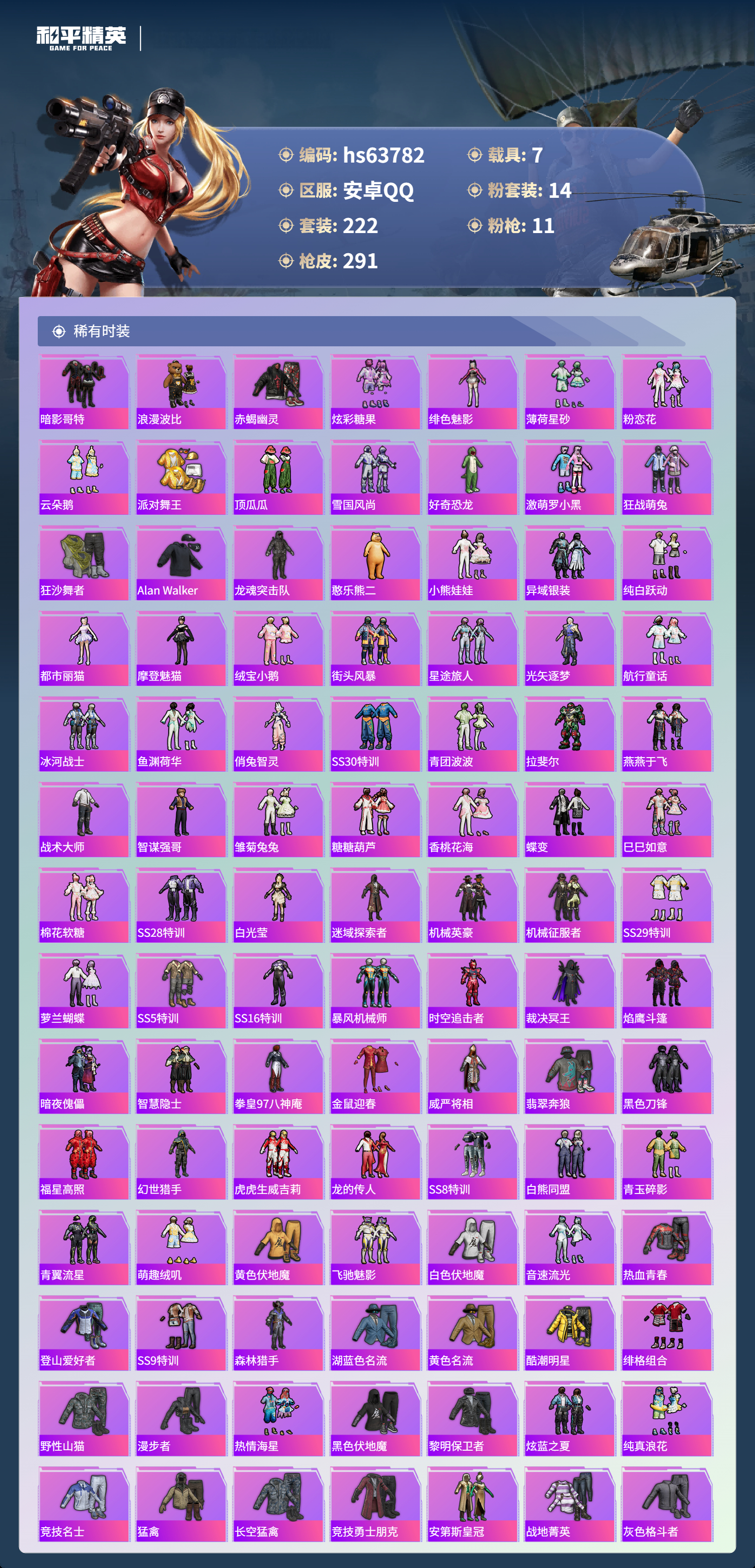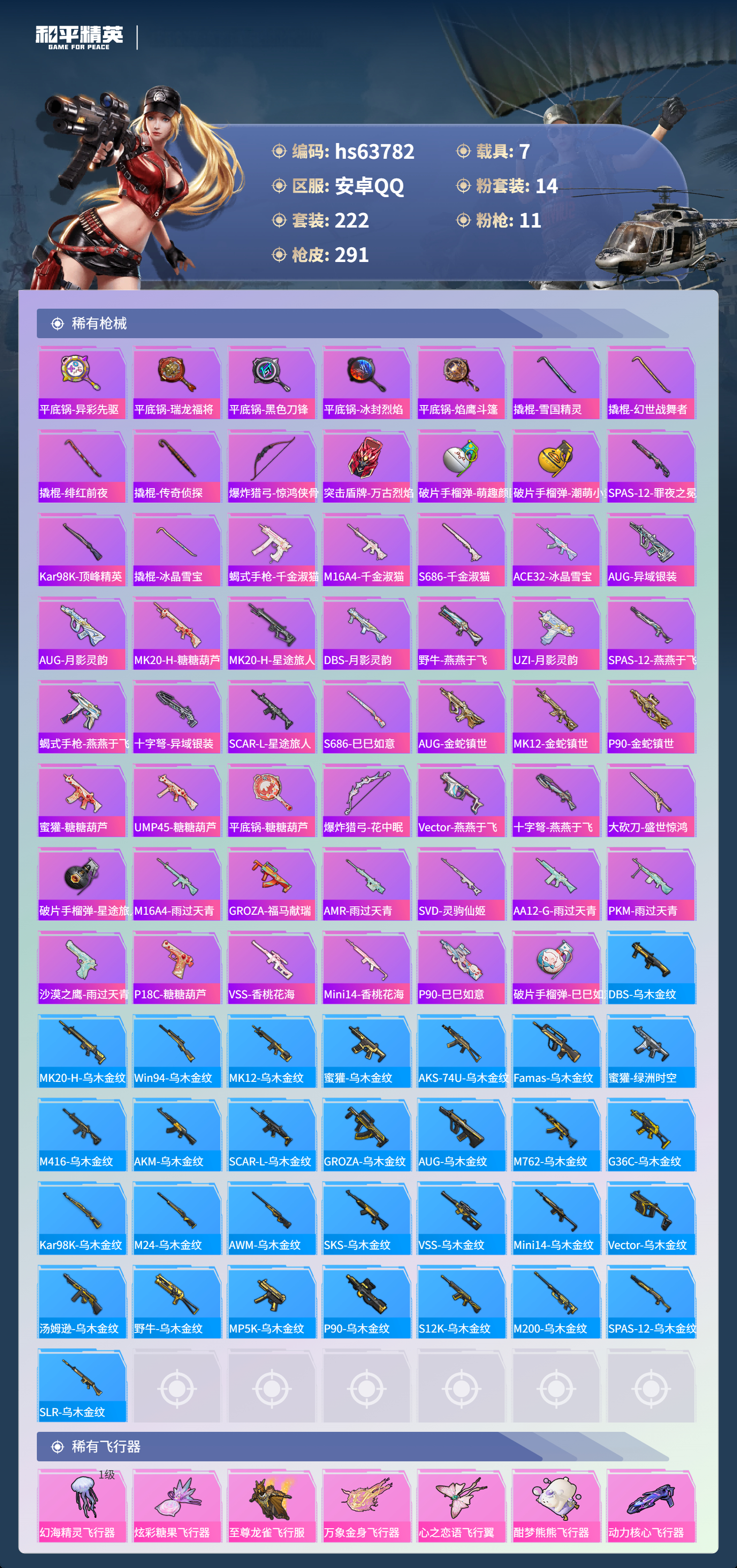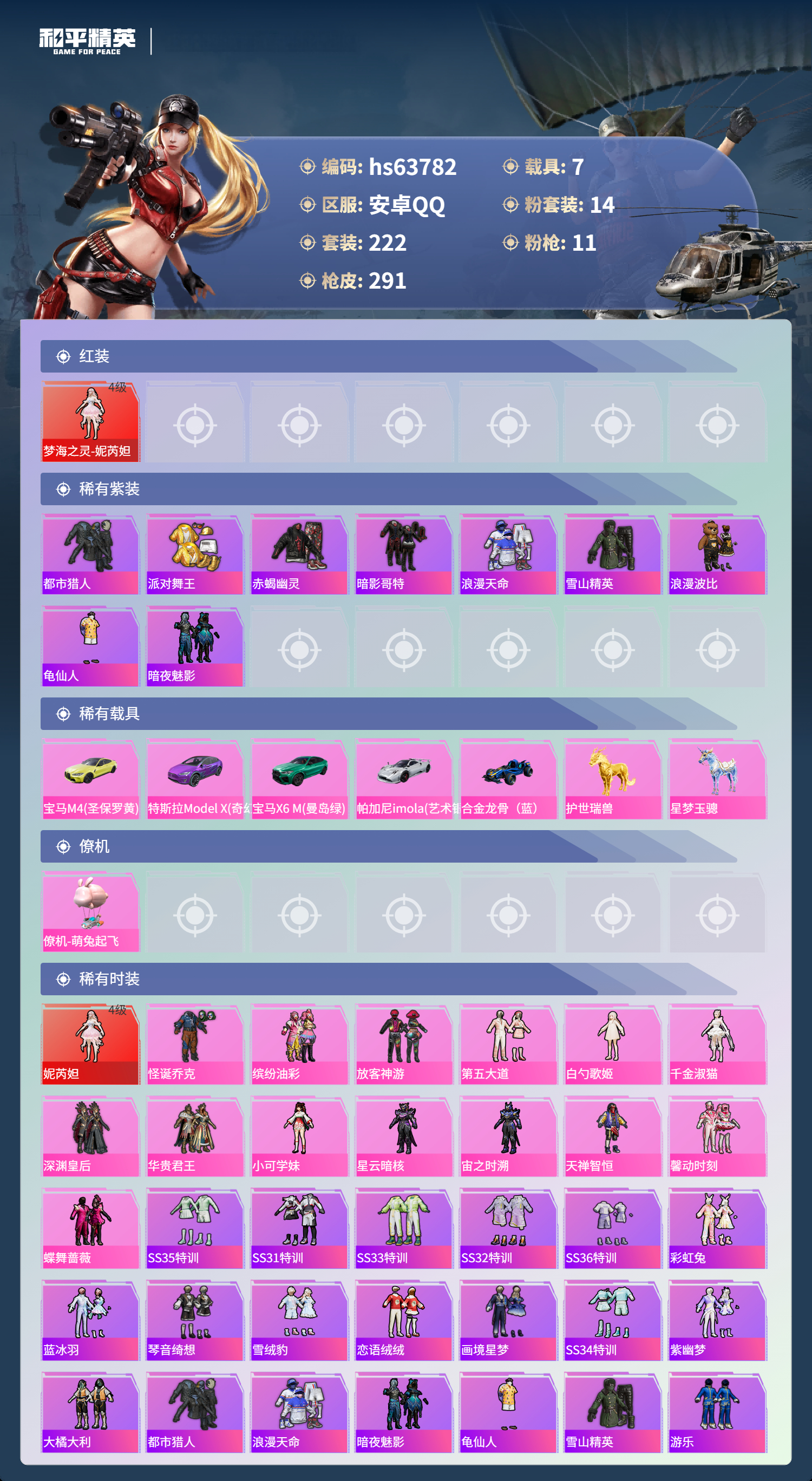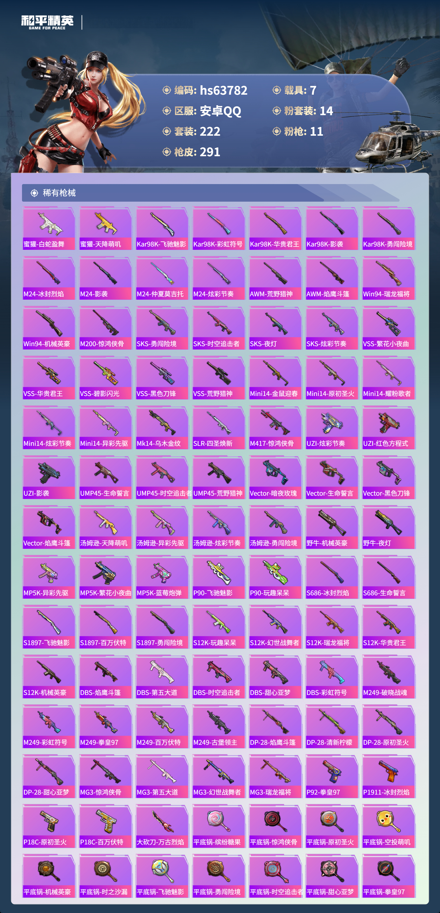hs63782 安卓手Q-18王牌印记-1红装-14粉装-11特效枪-7载具-热力值-222套装-291枪皮-3卓越印记