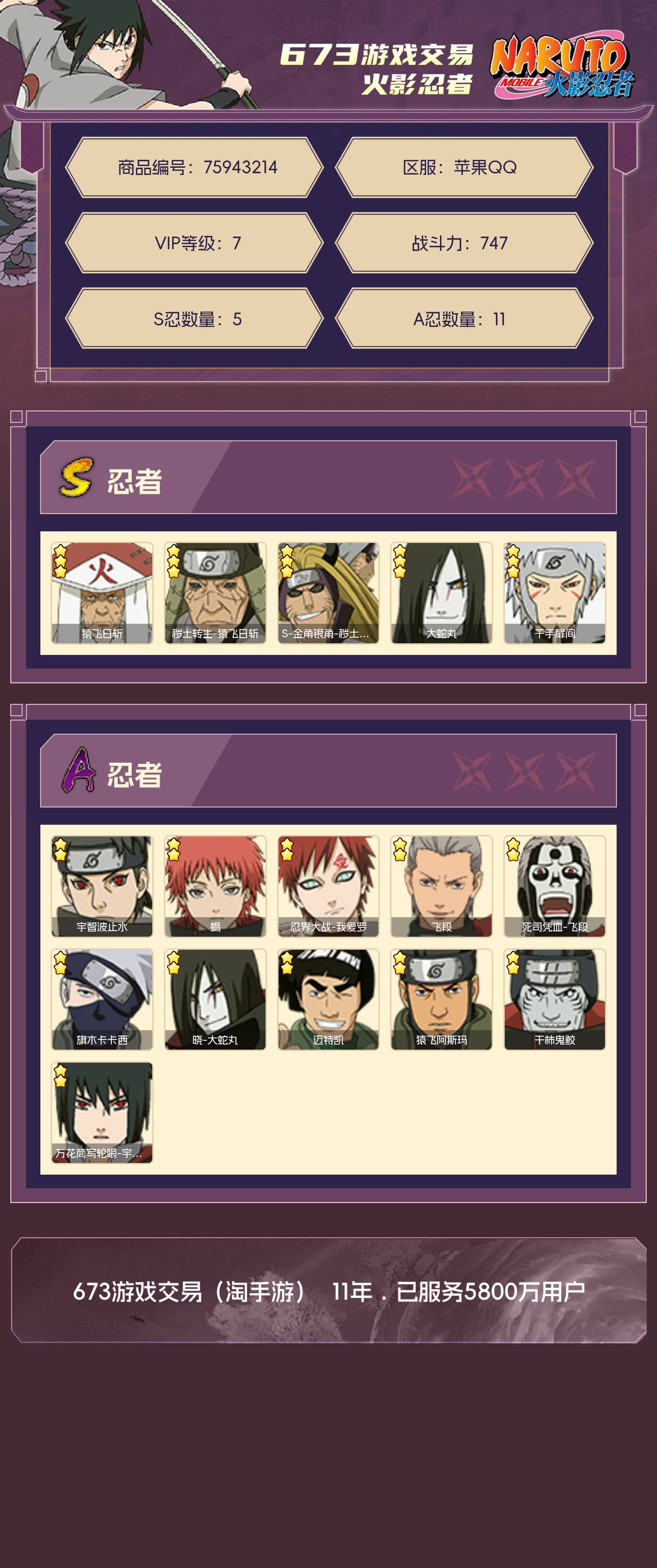 角色等级128 战斗力747 S忍5 A忍11 7 段位见习