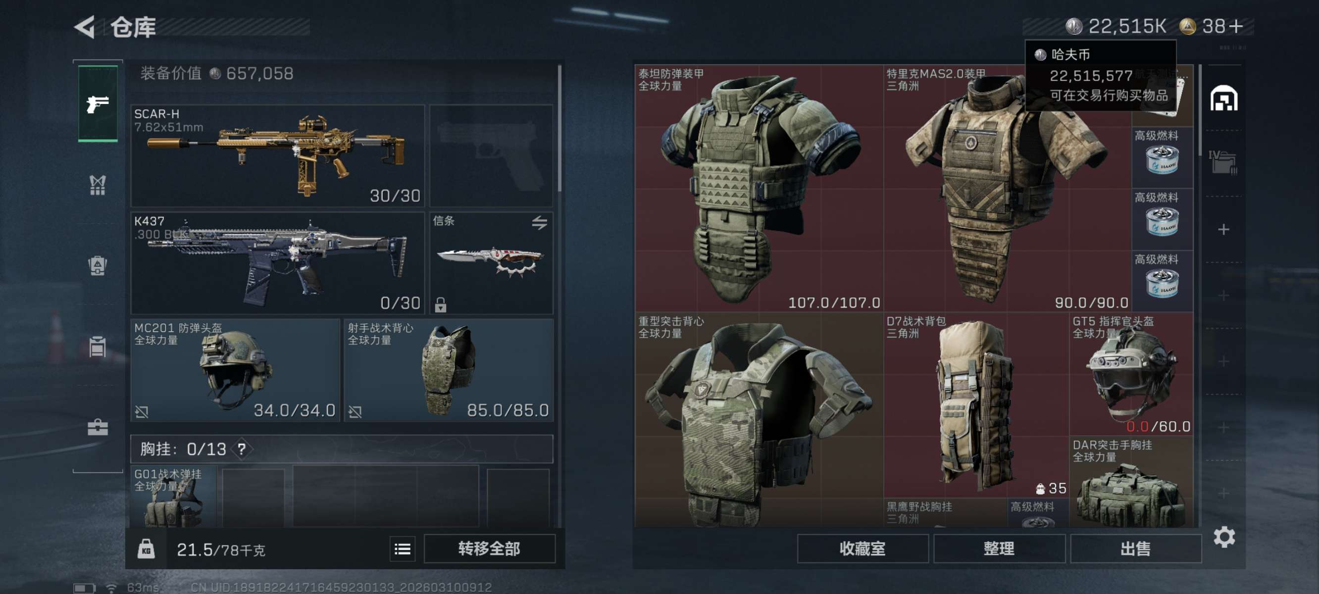 MSJ3686【资产80m 红皮维什戴尔 刀-信条】三端互通-总价值79.6M-哈夫币22,515.58-烽火地带等级60-烽火地带段位黑鹰【干员皮肤】深蓝-不破誓约 骇爪-维什戴尔 红狼-电锯惊魂 露娜-金牌射手【近战武器】黑鹰 信条【枪皮】M4A1突击步枪-红色涂装 M4A1突击步枪-粉色涂装 M4A1突击步枪-海色 M4A1突击步枪-繁盛 M4A1突击步枪-阿米娅 AKM突击步枪-战术演练 AKM突击步枪-肃杀 QBZ95-1突击步枪-高雅黑 QBZ95-1突击步枪-海浪 QBZ95-1突