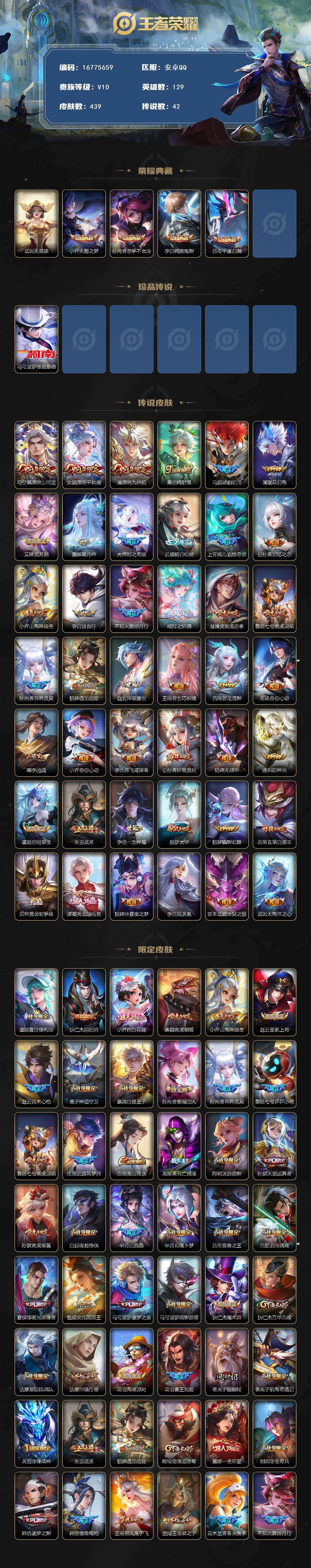 【16775659】安卓Q-V10-最强王者段位-129英雄-439皮肤-4典藏皮肤-1典藏英雄-1珍品传说-42传说-147史诗