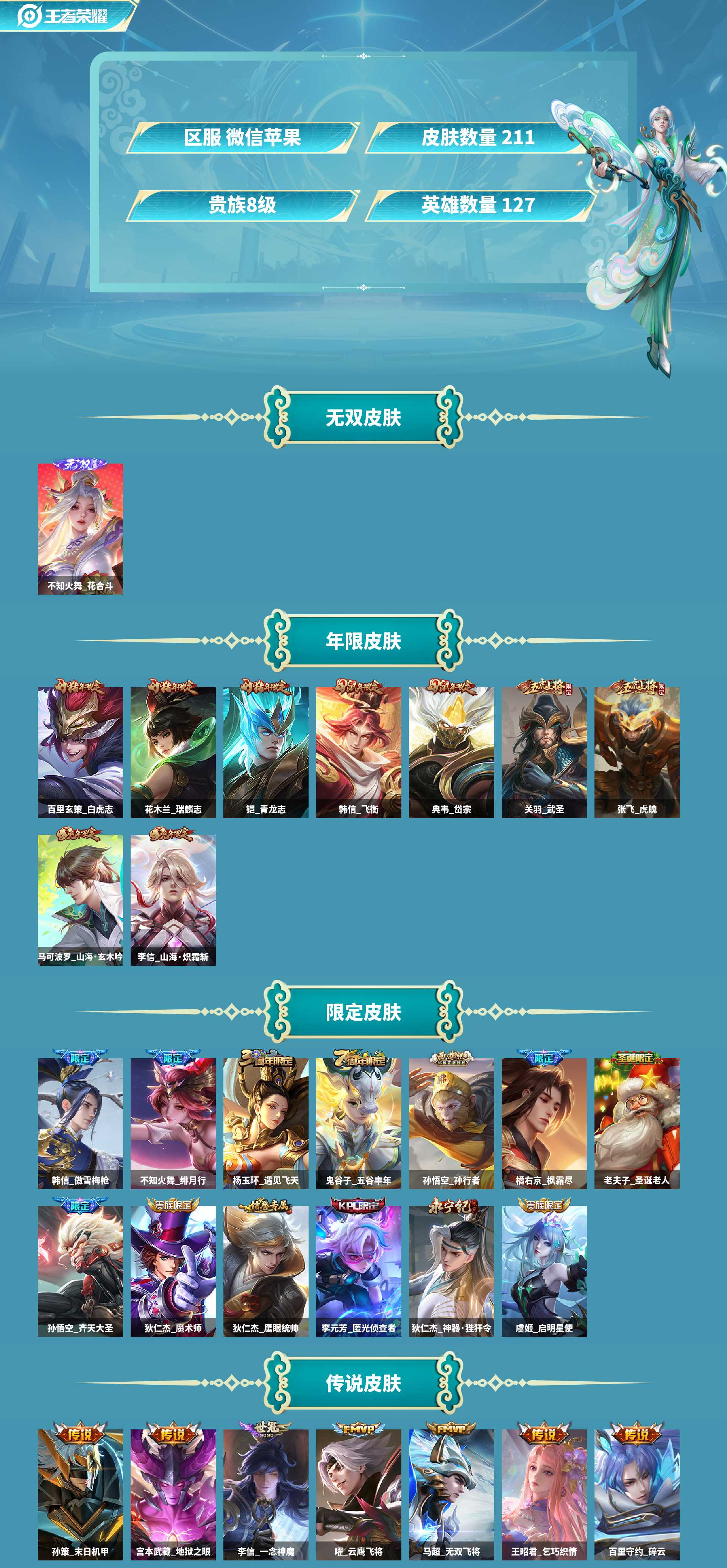 v8贵族对抗路博弈性价比号-边路48段-1无双不知火舞花合斗-2历史金标-上单数据好高质量传说20个-后裔神树通天,桑启鸣野蒿,虞姬启明星使,百里玄策白虎志,澜逐花归海,关羽武圣,孙悟空齐天大圣,李信山海炽霜斩,王昭君乞巧织情,孙策末日机甲,吕布怒海麟威,李白诗剑行,宫本武藏地狱之眼,不知火舞绯月行,百里守约碎云,曜云鹰飞将,狄仁杰神器狴犴令,李信一念神魔,马超无双飞将,橘右京枫霜尽