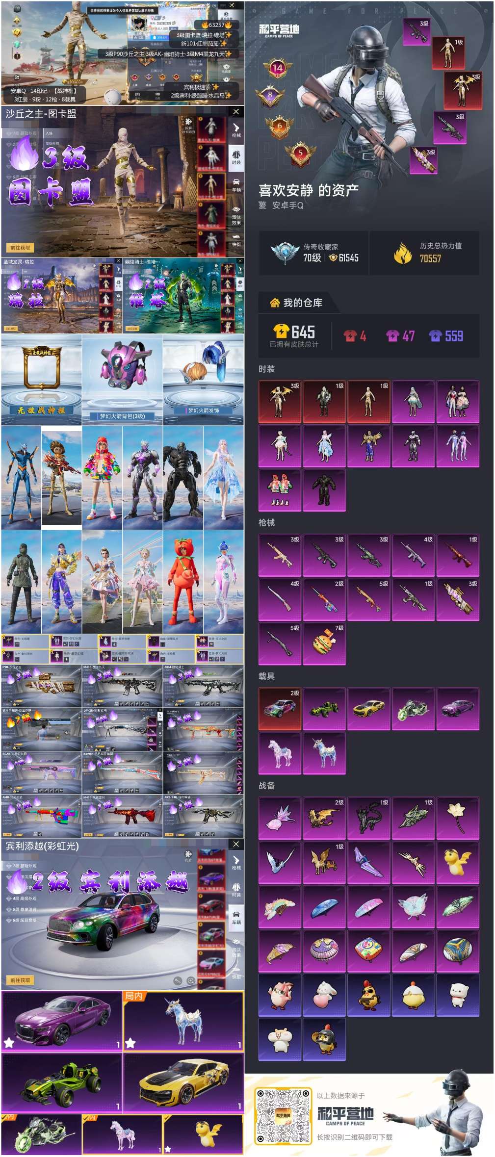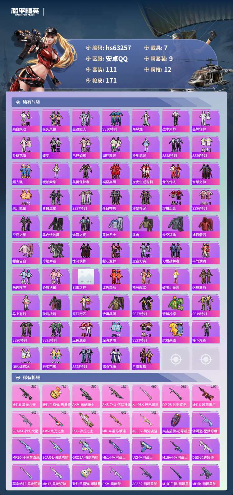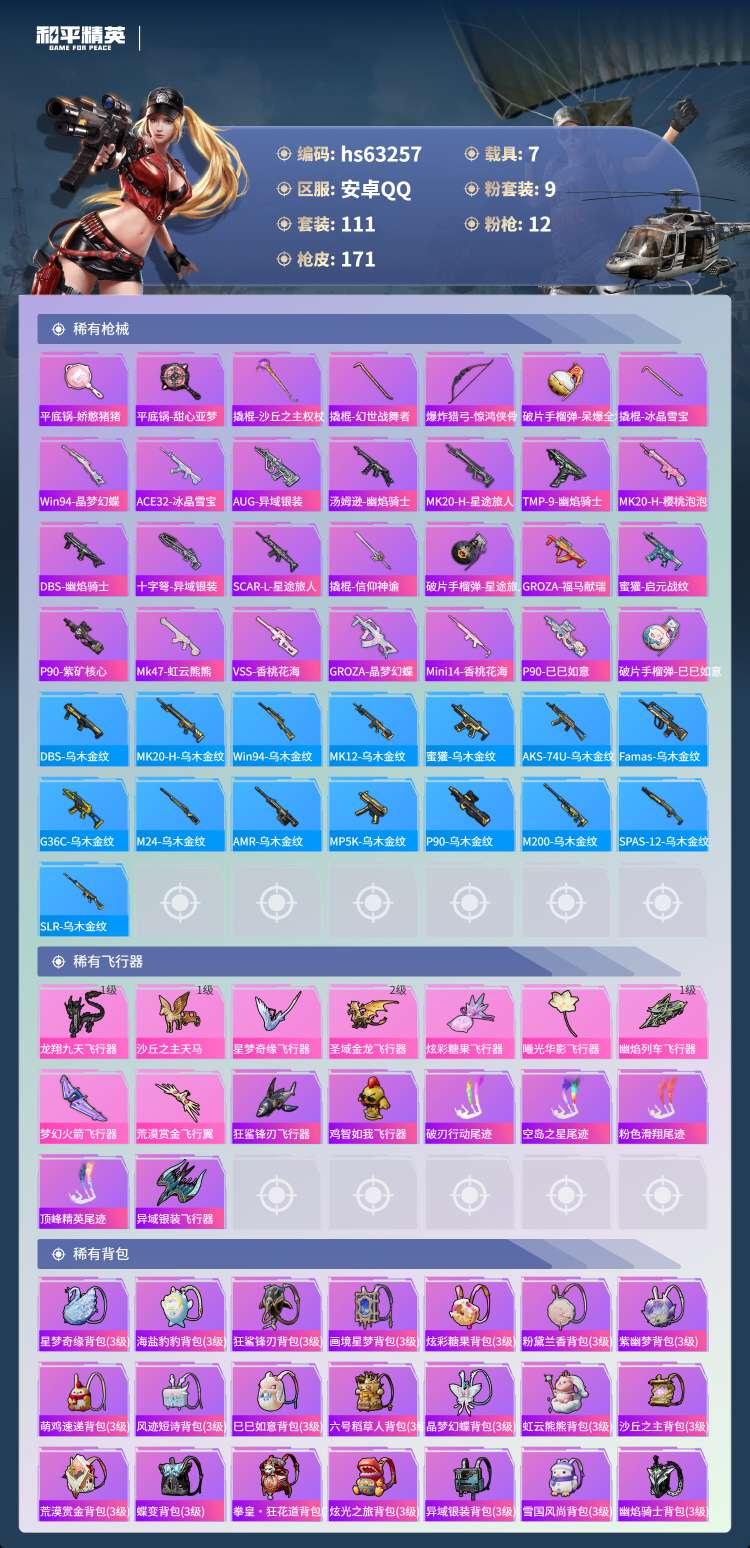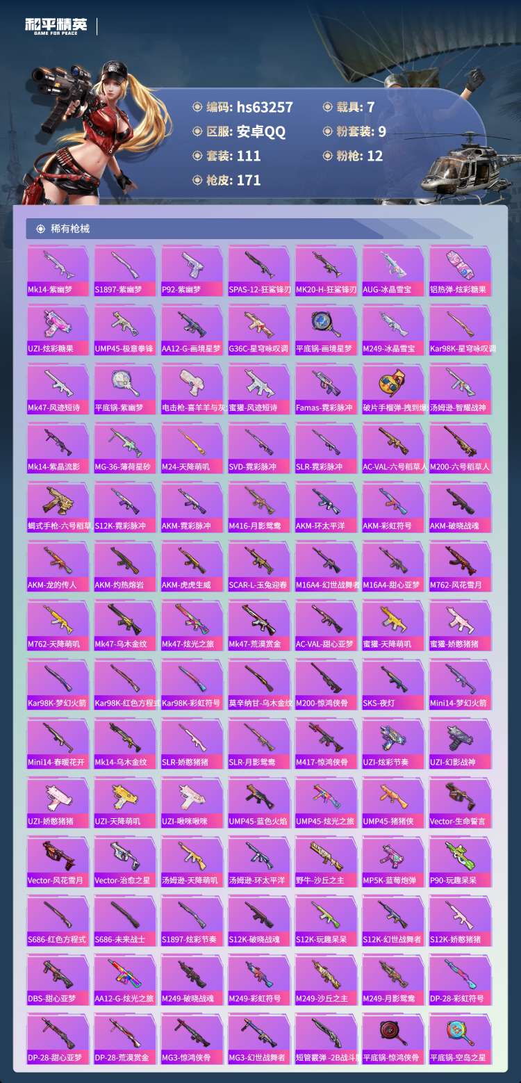 hs63257 安卓手Q-14王牌印记-有战神框-3红装-9粉装-12特效枪-7载具-70557热力