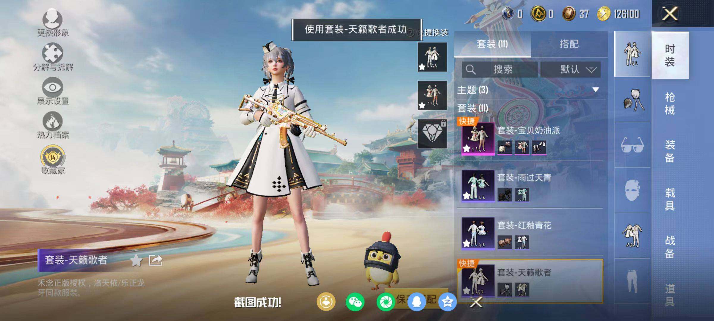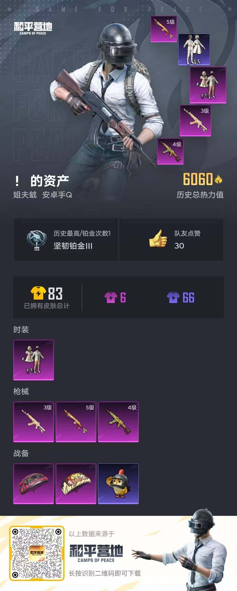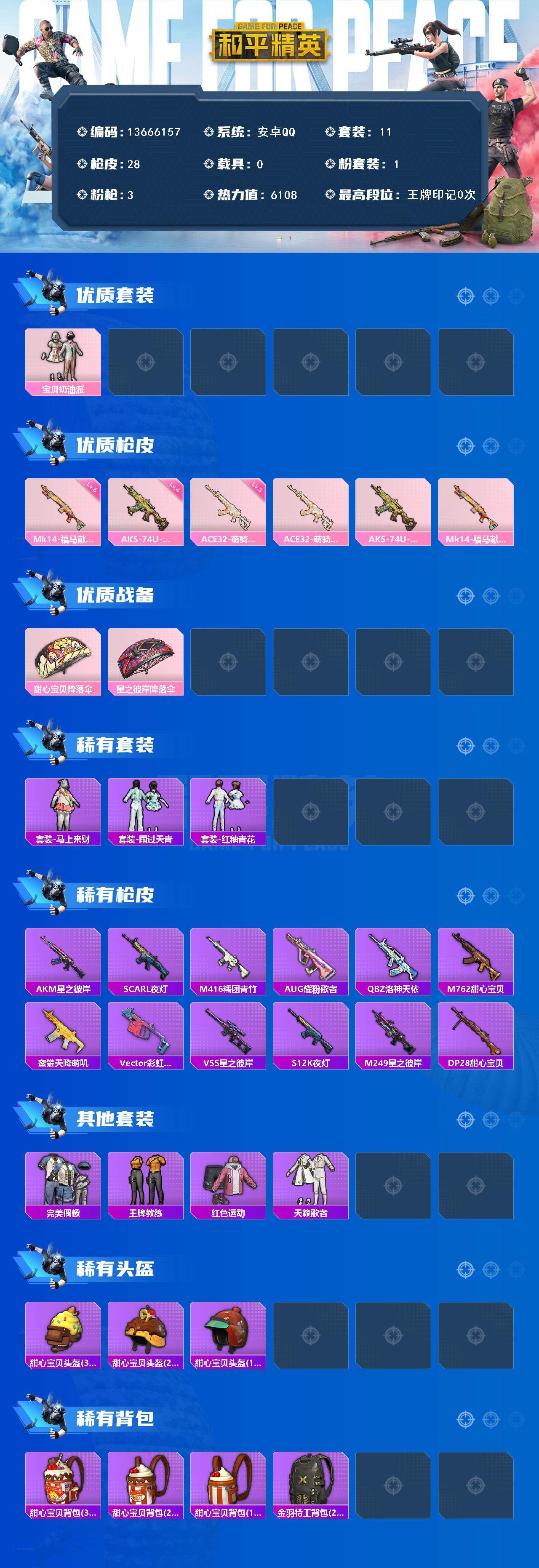 11套装/枪械3/装备24/战备22/热力值6108/三级ACE32-萌骑漫游/四级AKS-74U-森灵之息/五级Mk14-福马献瑞/宝贝奶油派/ACE32-萌骑漫游/AKS-74U-森灵之息/Mk14-福马献瑞/甜心宝贝降落伞/星之彼岸降落伞/套装-马上来财/套装-雨过天青/套装-红釉青花/AKM-星之彼岸/SCAR-L-夜灯/M416-糯团青竹/AUG-耀粉歌者/QBZ-洛神天依/M762-