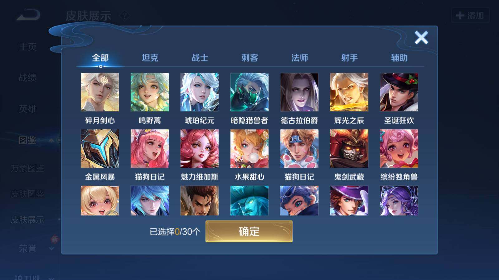 【限定皮肤】:姜子牙天穹之誓,杨戬破阵退雄兵,狄仁杰阴阳师,赵云皇家上将,孙膑妖精王,夏侯惇朔风刀,狄仁杰魔术师,项羽海滩派对,后羿辉光之辰,鬼谷子五谷丰年,裴擒虎擒涛扼浪,狂铁御狮,鲁班