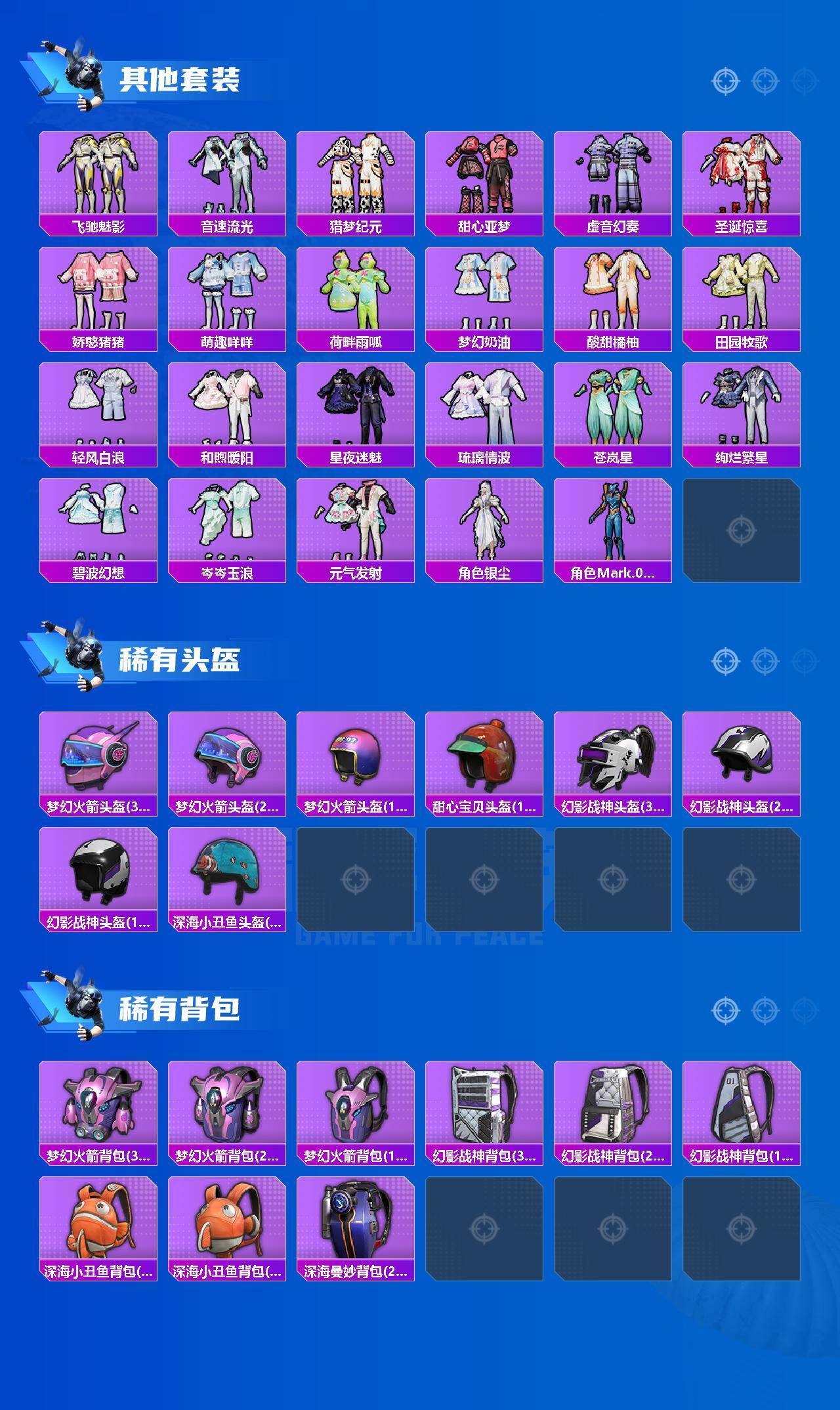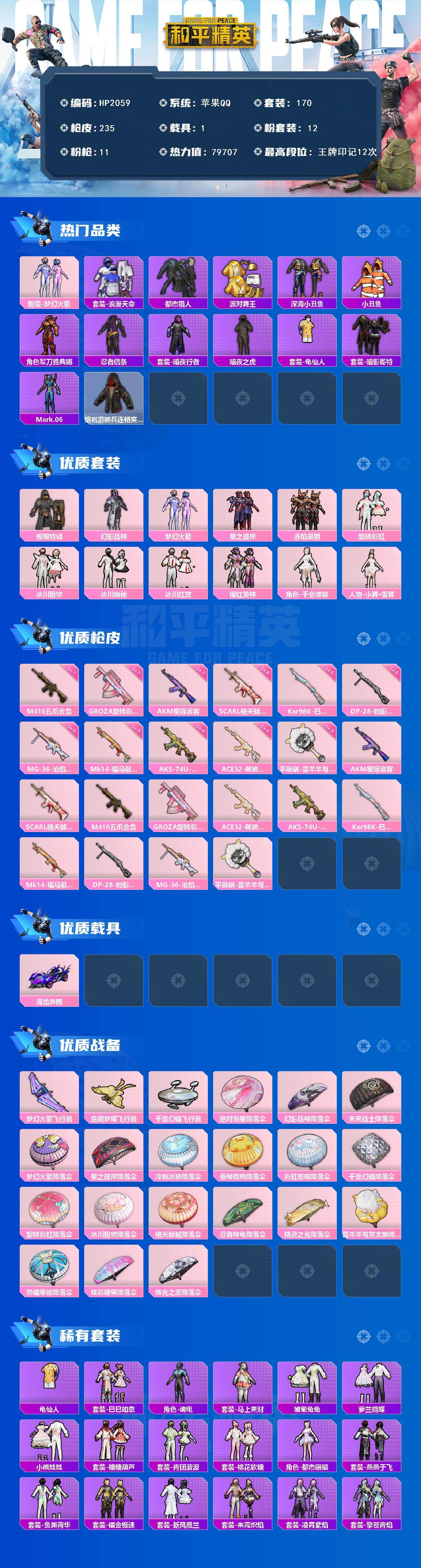 【HP2059】170套装/枪械11/装备343/载具1/战备162/王牌印记12/热力值79707/七级AKM-星际浪客/六级SCAR-L-桃夭倾城/七级M416-五爪金龙/七级GROZA-旋转彩虹/四级ACE32-萌骑漫游/四级AKS-74U-森灵之息/五级Kar98K-巳巳如意/五级Mk14-福马献瑞/五级DP-28-豹影疾电/五级MG-36-沧焰双生/三级平底锅-喜羊羊与灰太狼/粉装-梦幻火箭/套装-浪漫天命/套装-都市猎人/套装-派对舞王/套装-深海小丑鱼/套装-小丑鱼/角色-军刀雅典
