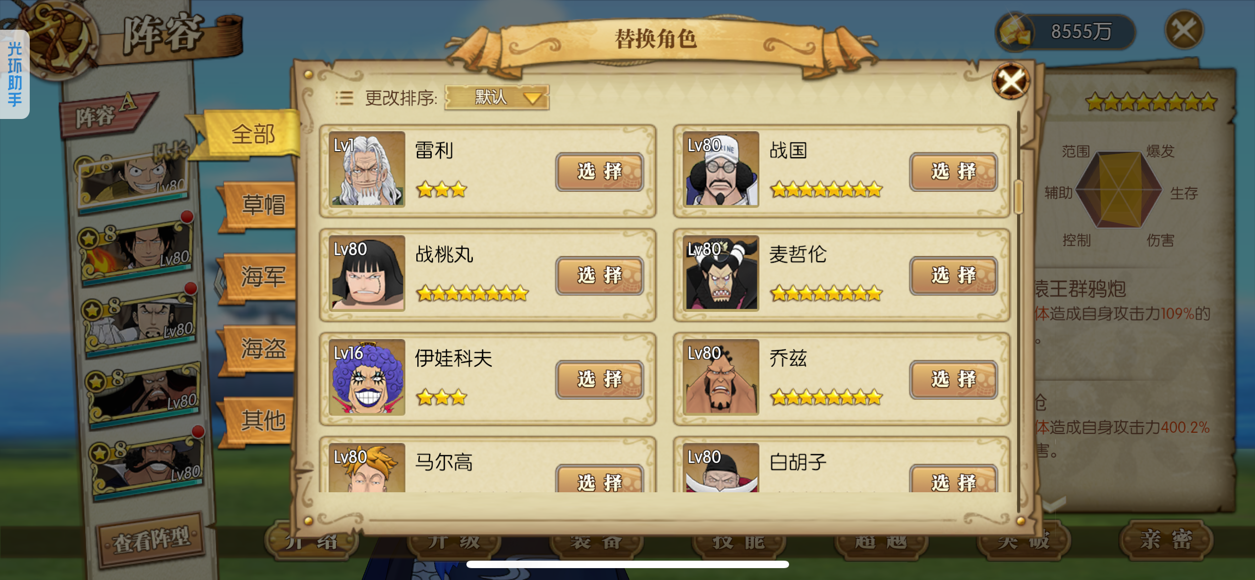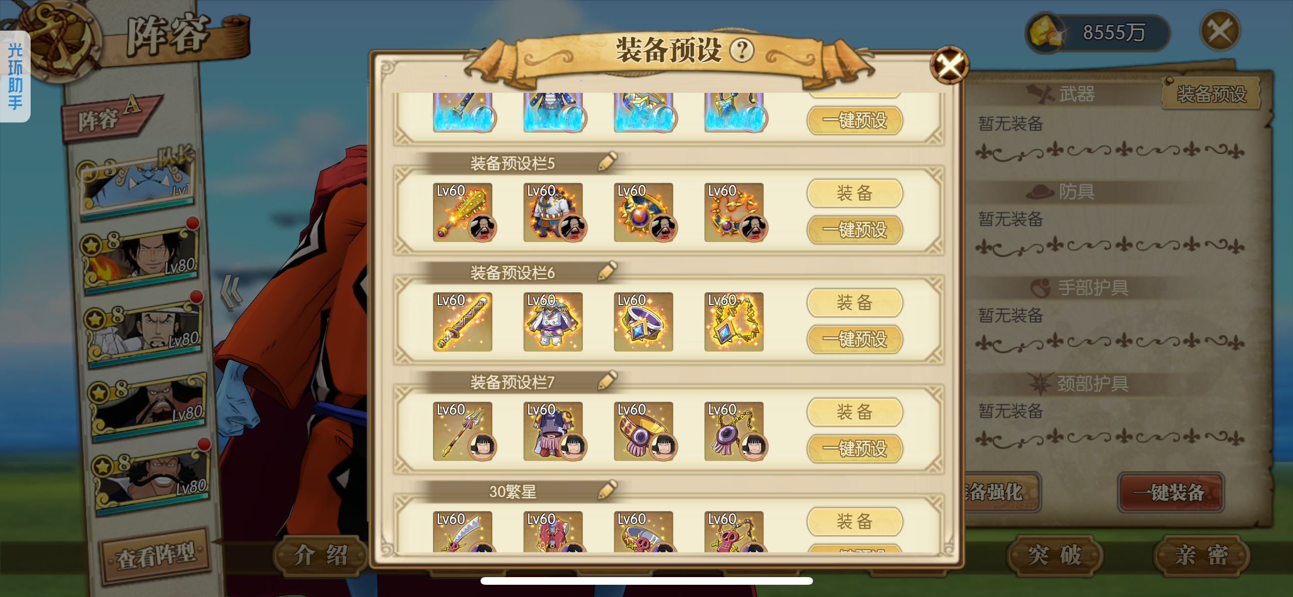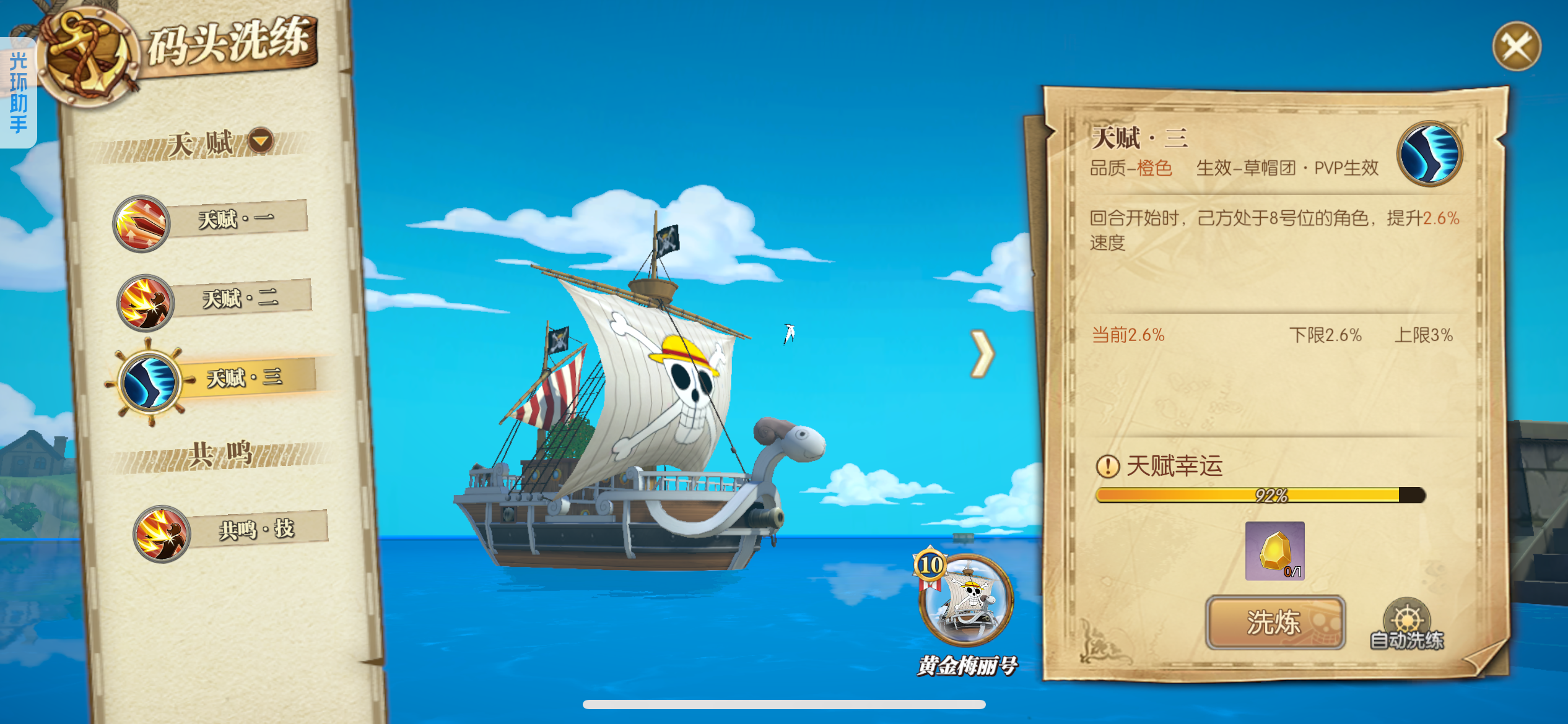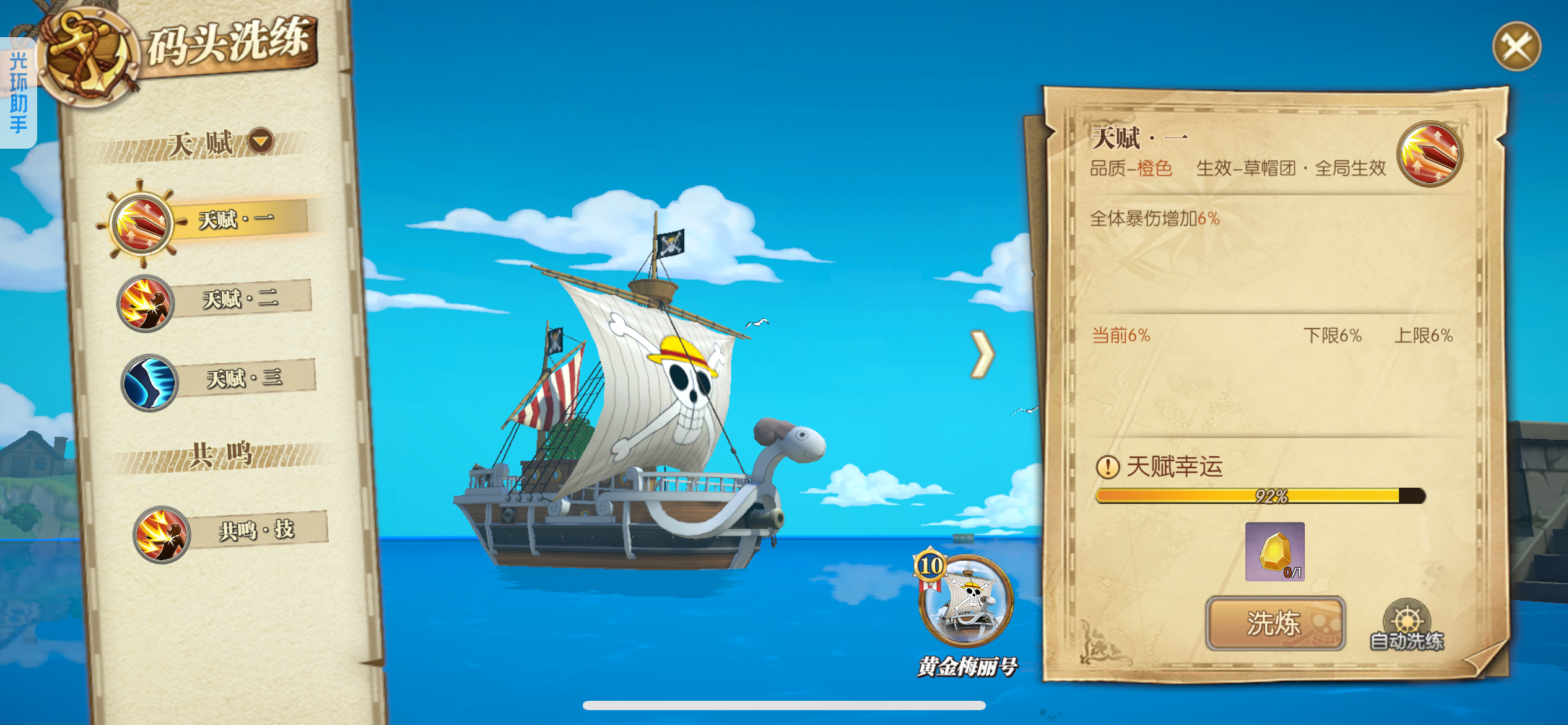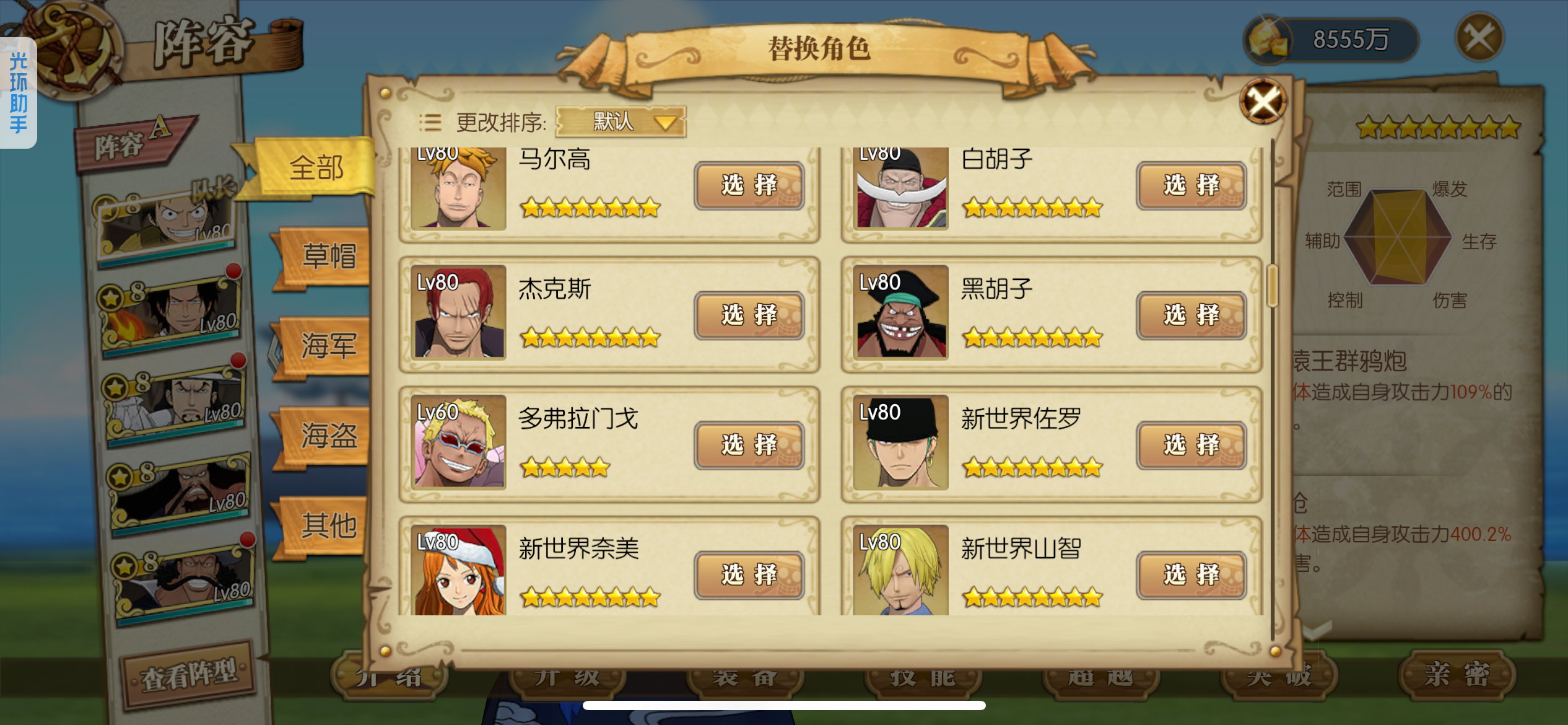 可玩各种散搭队、肉队、草帽团、四皇团、白团、七武海、超新星,4级阵多多,主要走的草帽团,草帽团成员全部满药,草帽团皮肤基本都有,就差个别两个没有,草帽团pvp船也洗好了,pve船刚洗一半,装备都是双速