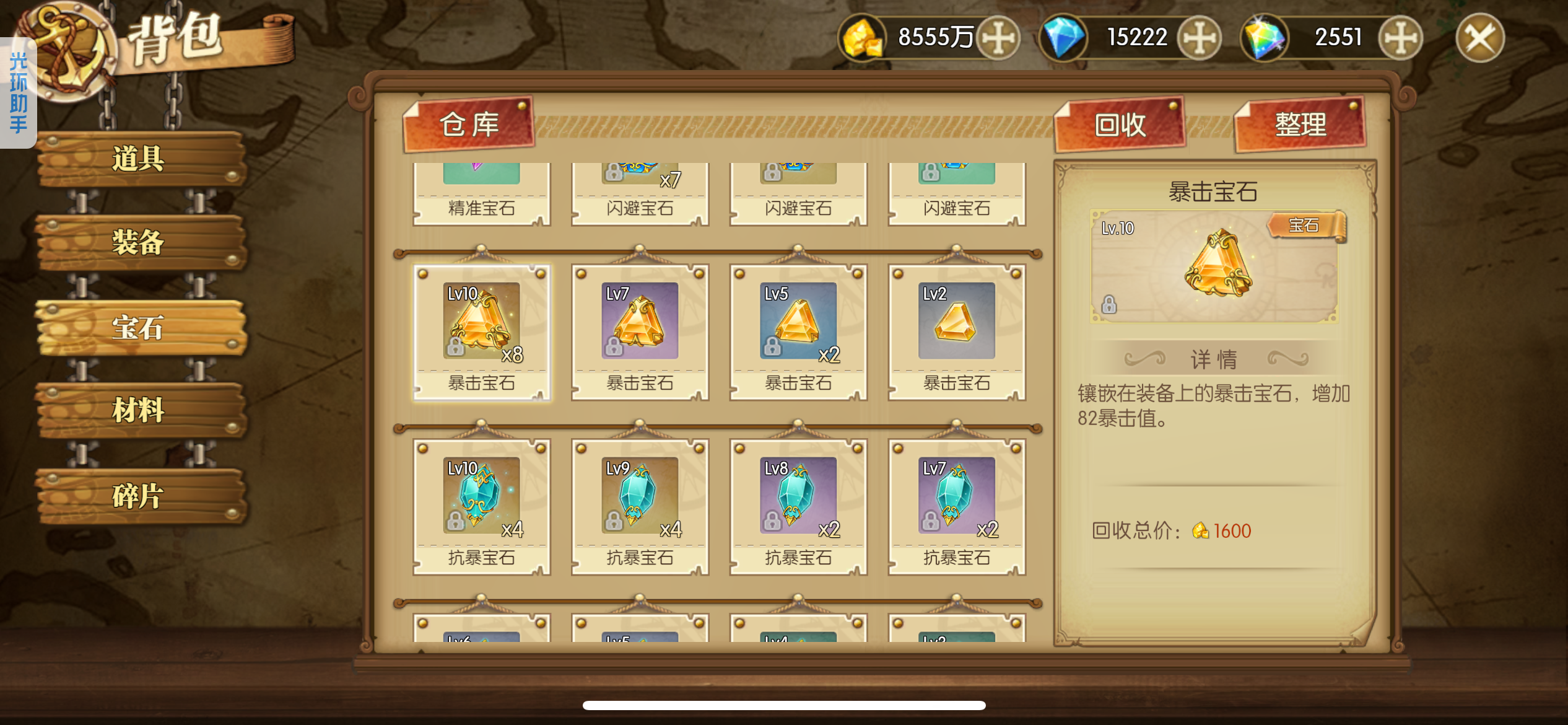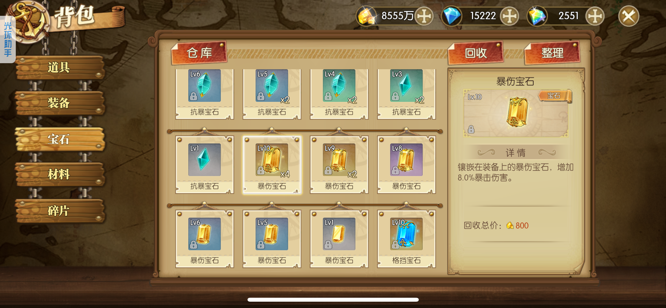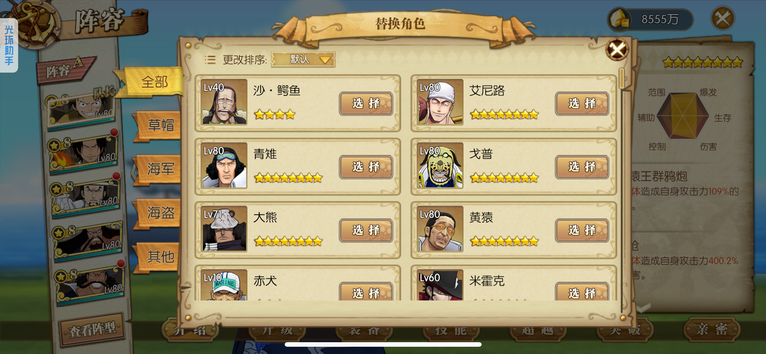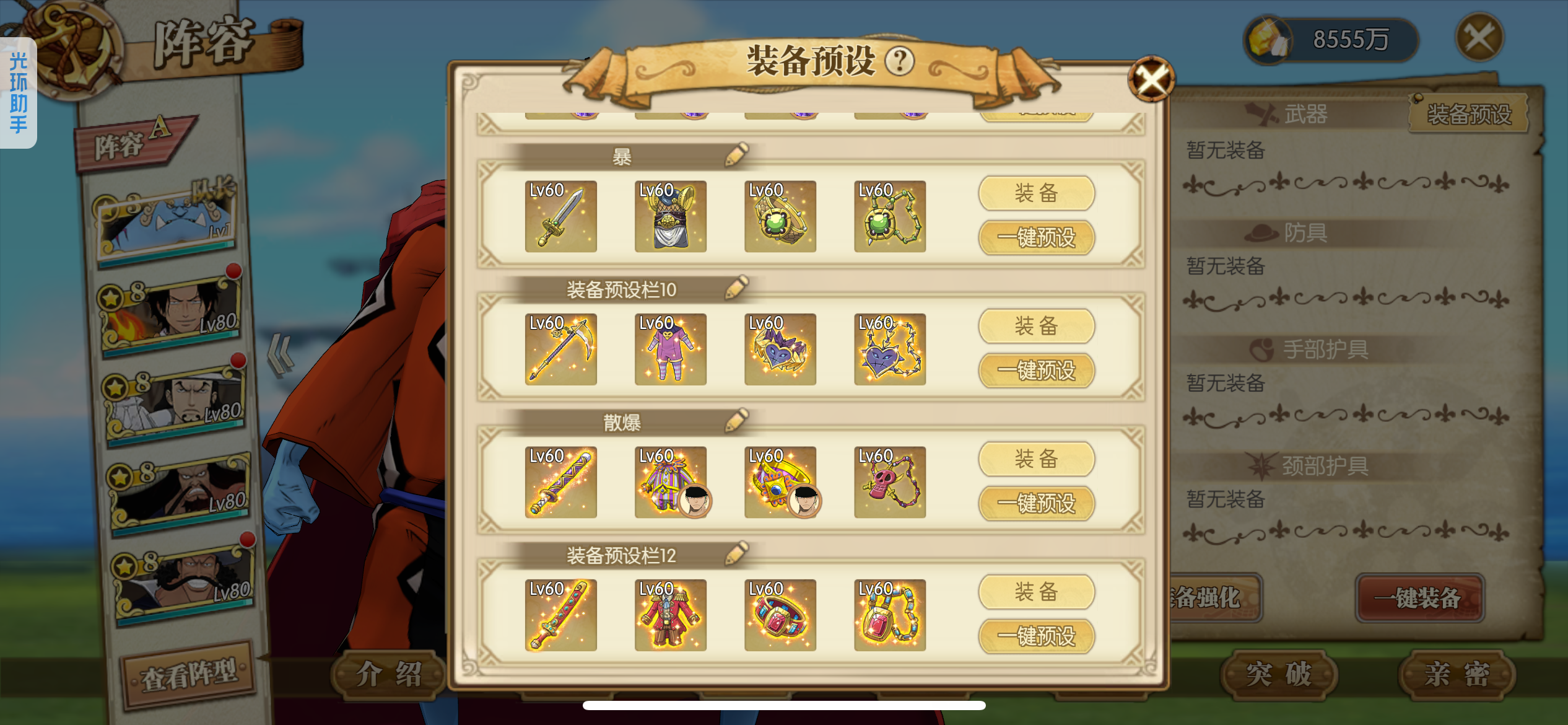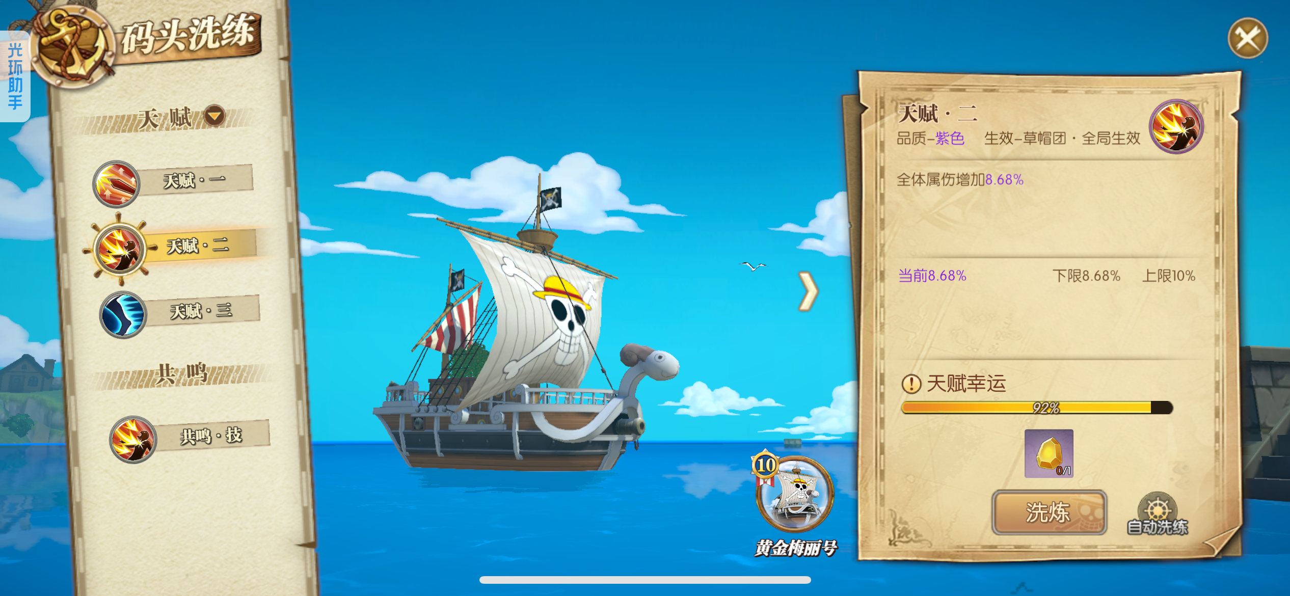 可玩各种散搭队、肉队、草帽团、四皇团、白团、七武海、超新星,4级阵多多,主要走的草帽团,草帽团成员全部满药,草帽团皮肤基本都有,就差个别两个没有,草帽团pvp船也洗好了,pve船刚洗一半,装备都是双速