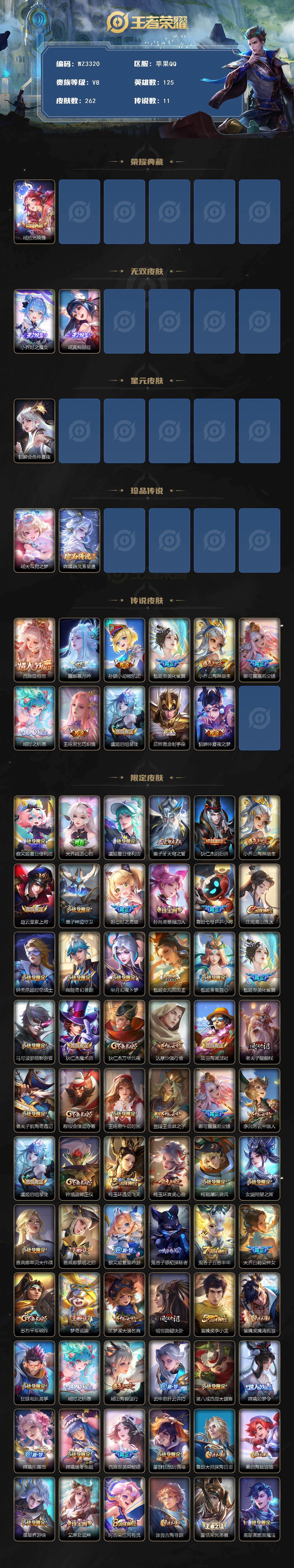 【秒换绑】苹果Q-V8-至尊星耀II段位-125英雄-262皮肤-1典藏皮肤-2无双-2珍品传说-11传说-88史诗