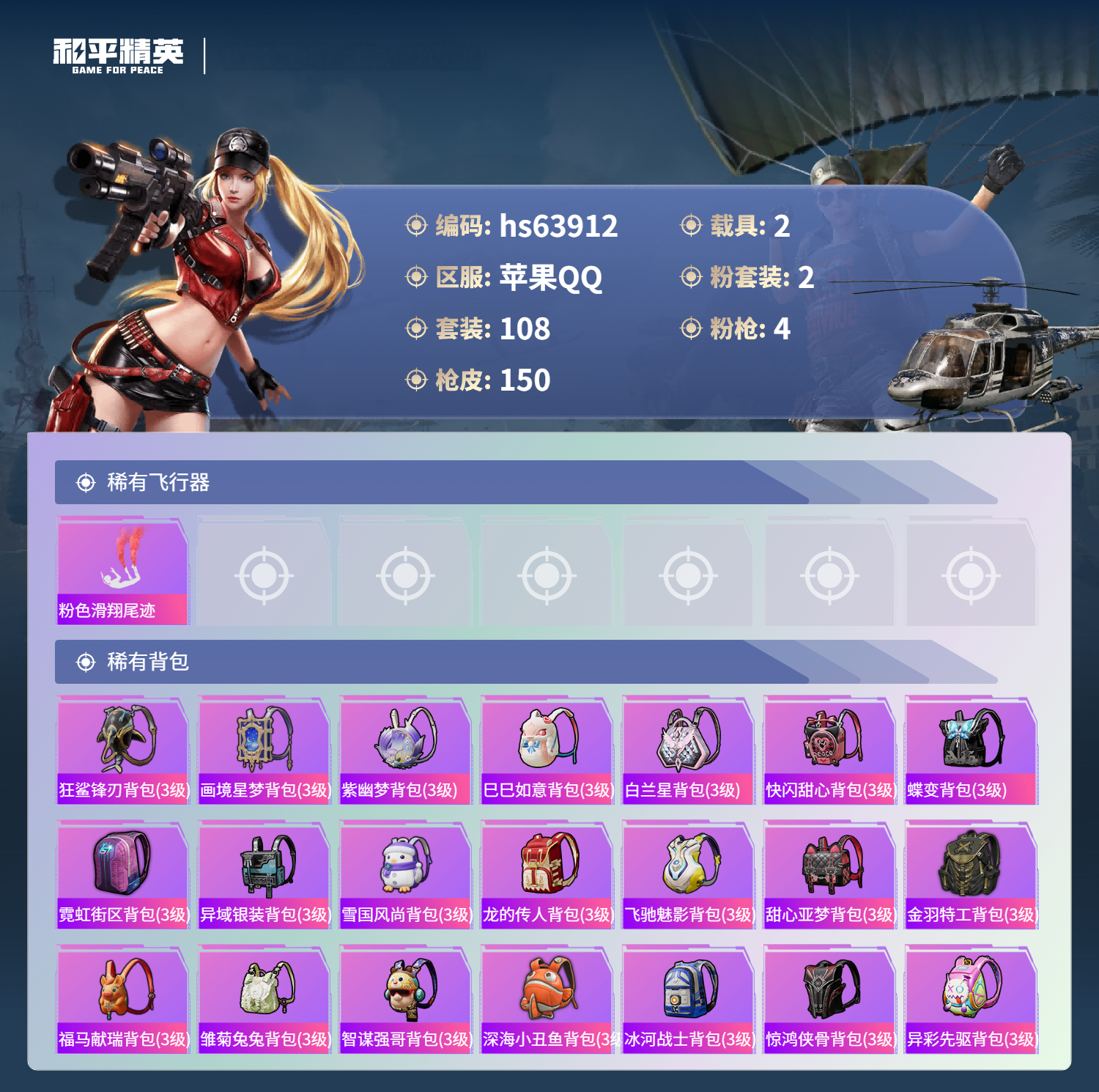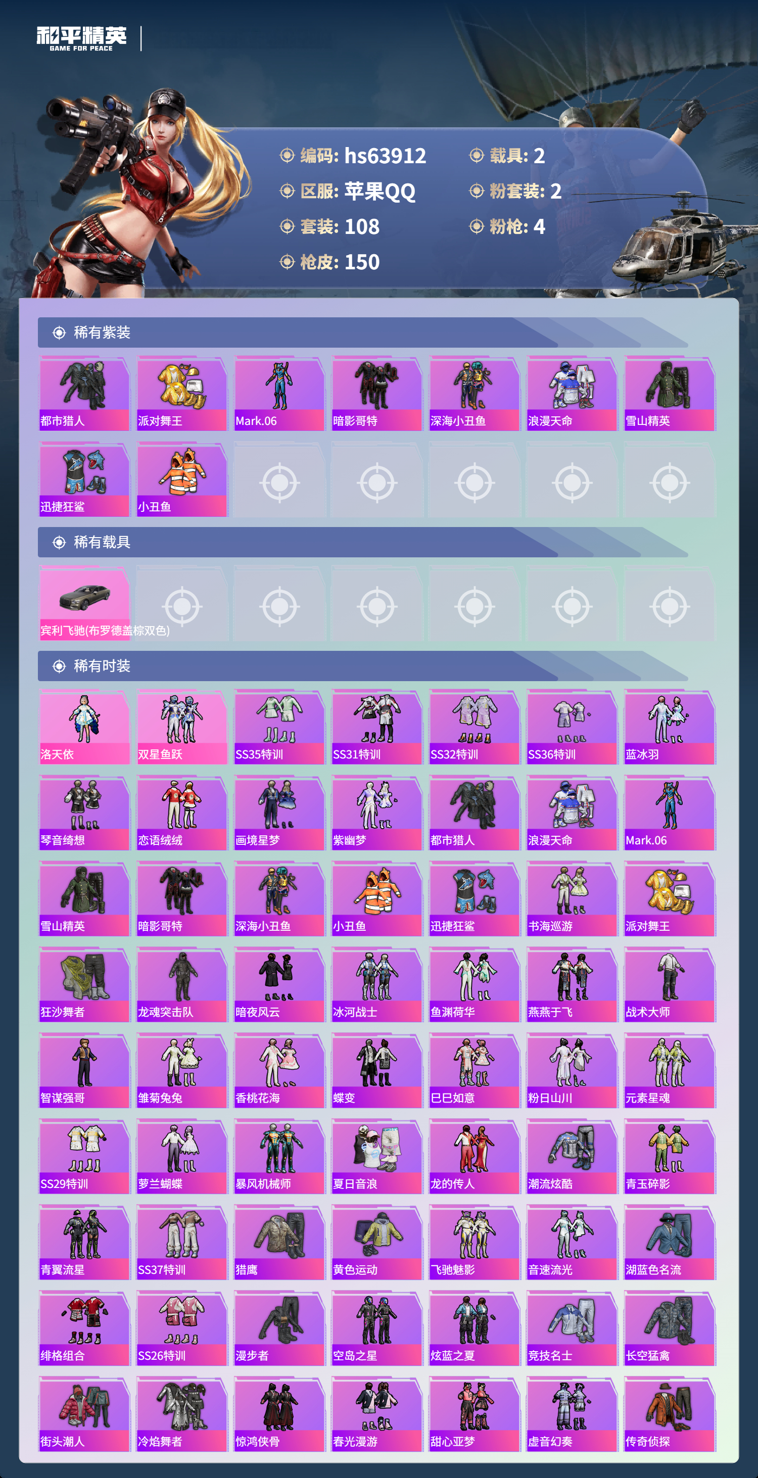 hs63912 苹果手Q-10王牌印记-2粉装-4特效枪-2载具-41385热力值-108套装-150枪皮-3卓越印记-2传奇印记