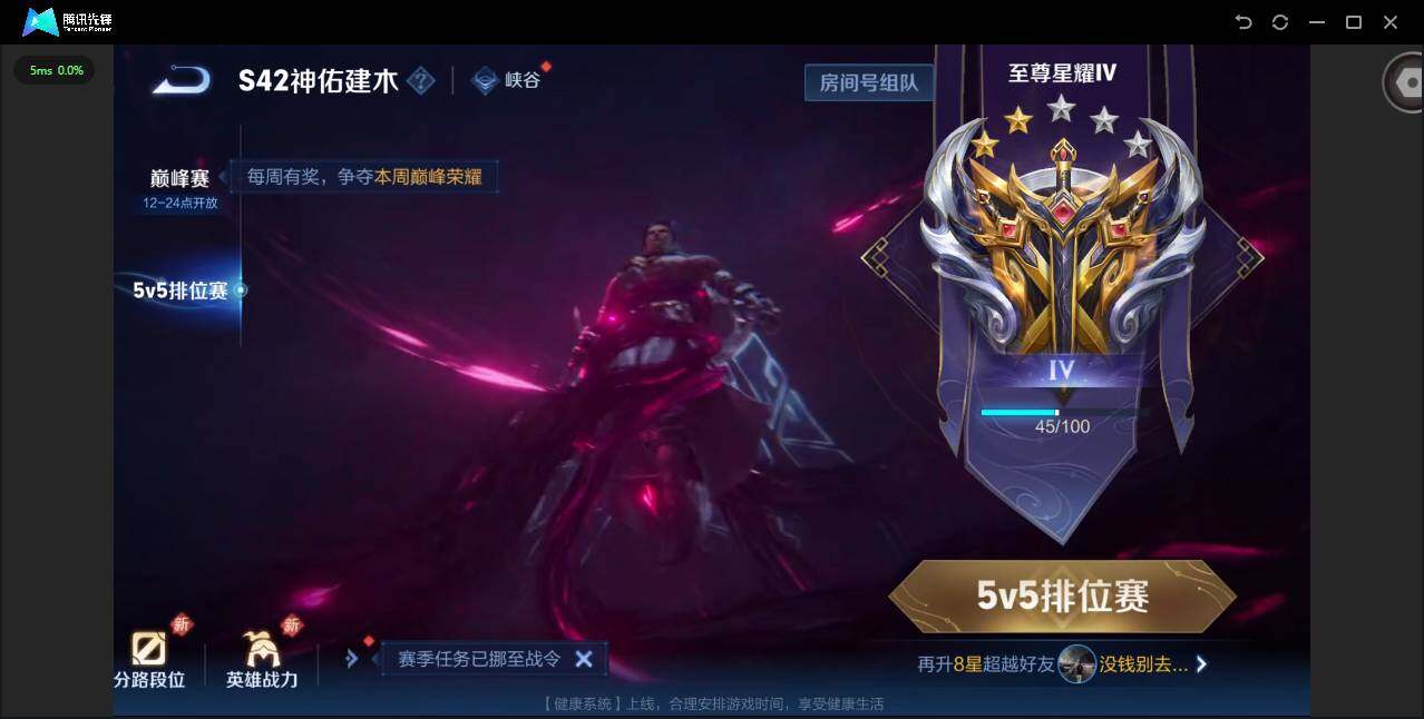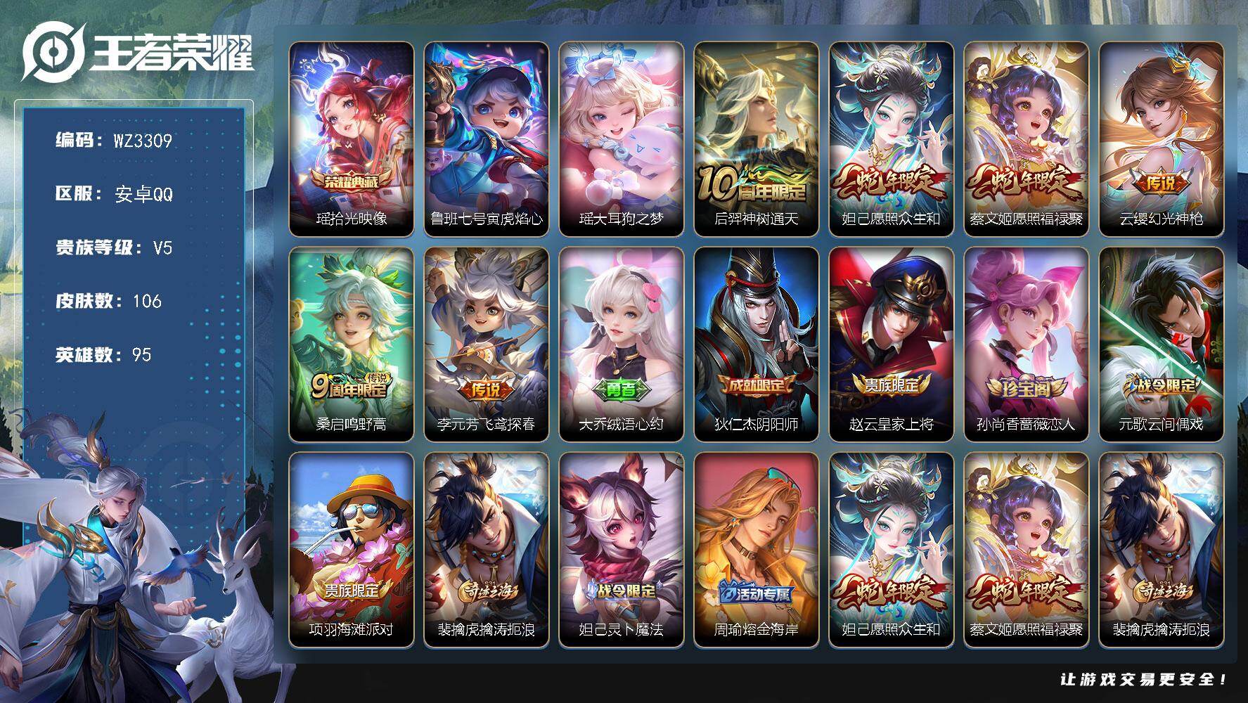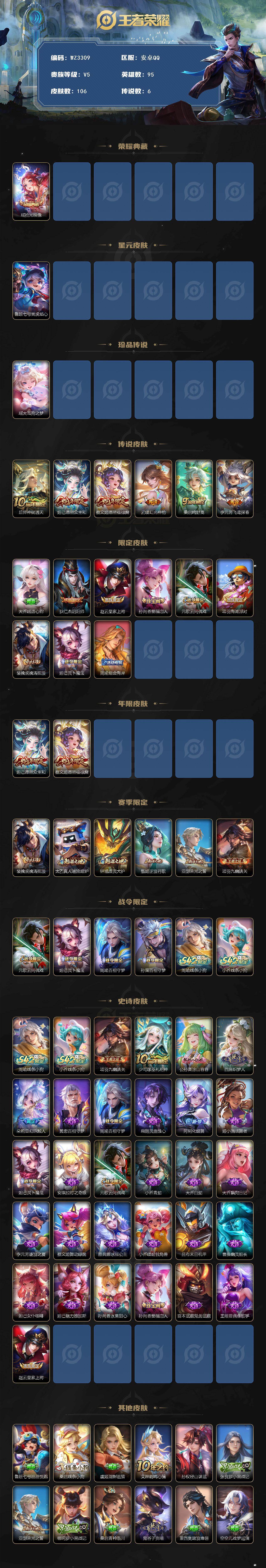 【秒换绑】安卓Q-V5-至尊星耀IV段位-95英雄-106皮肤-1典藏皮肤-1珍品传说-6传说-29史诗