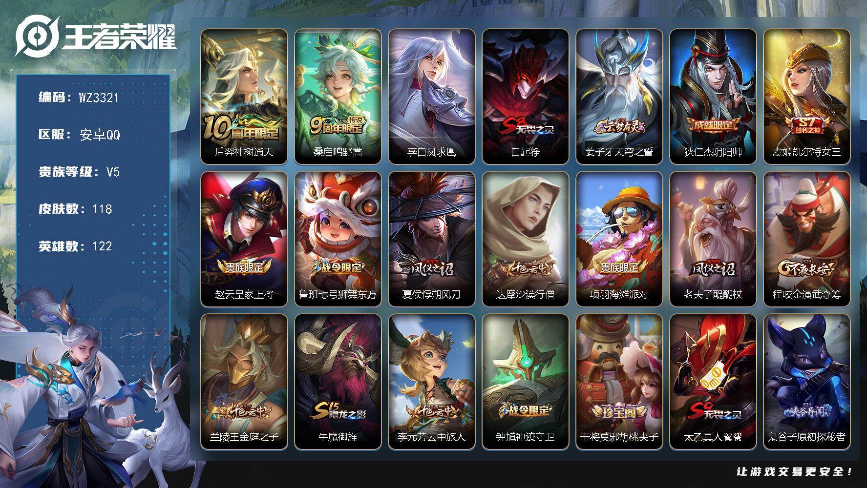 【秒换绑】安卓Q-V5-尊贵铂金III段位-122英雄-118皮肤-3传说-22史诗