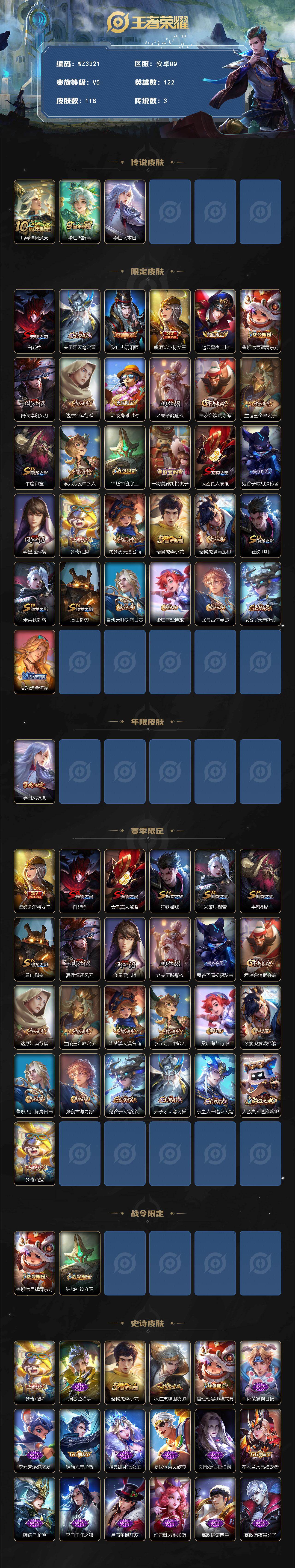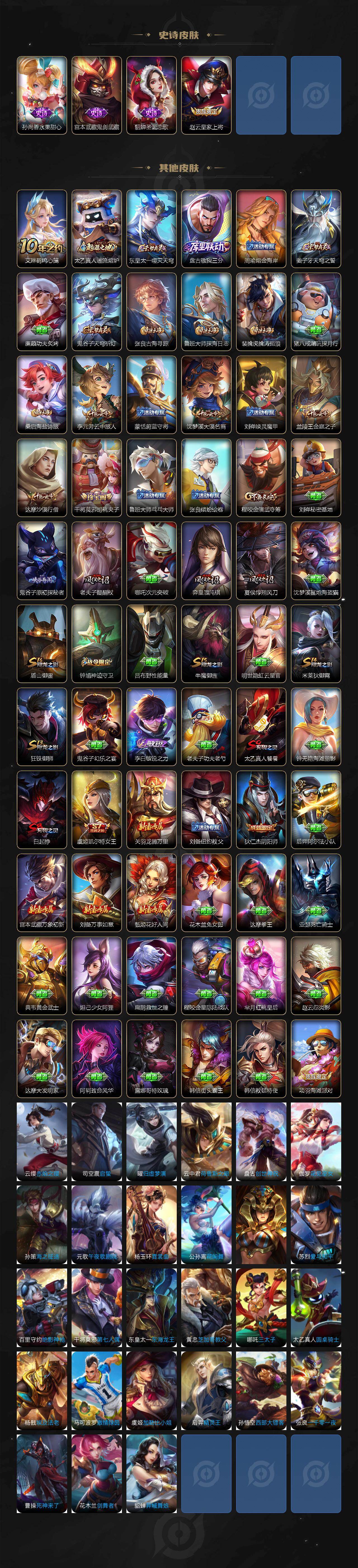 【限定皮肤】:白起狰,姜子牙天穹之誓,狄仁杰阴阳师,虞姬凯尔特女王,赵云皇家上将,鲁班七号狮舞东方,夏侯惇朔风刀,达摩沙漠行僧,项羽海滩派对,老夫子醍醐杖,程咬金演武夺筹,兰陵王金庭之子,牛魔御旌,李元芳云中旅人,钟馗神迹守卫,干