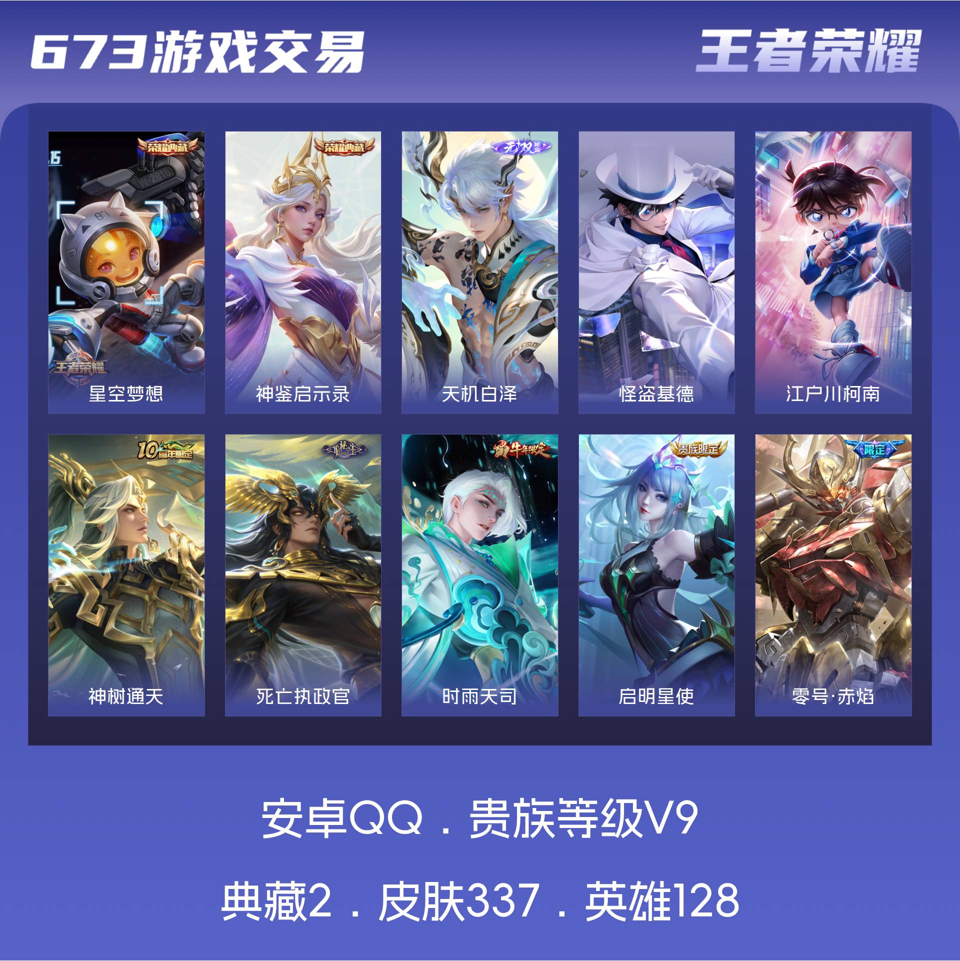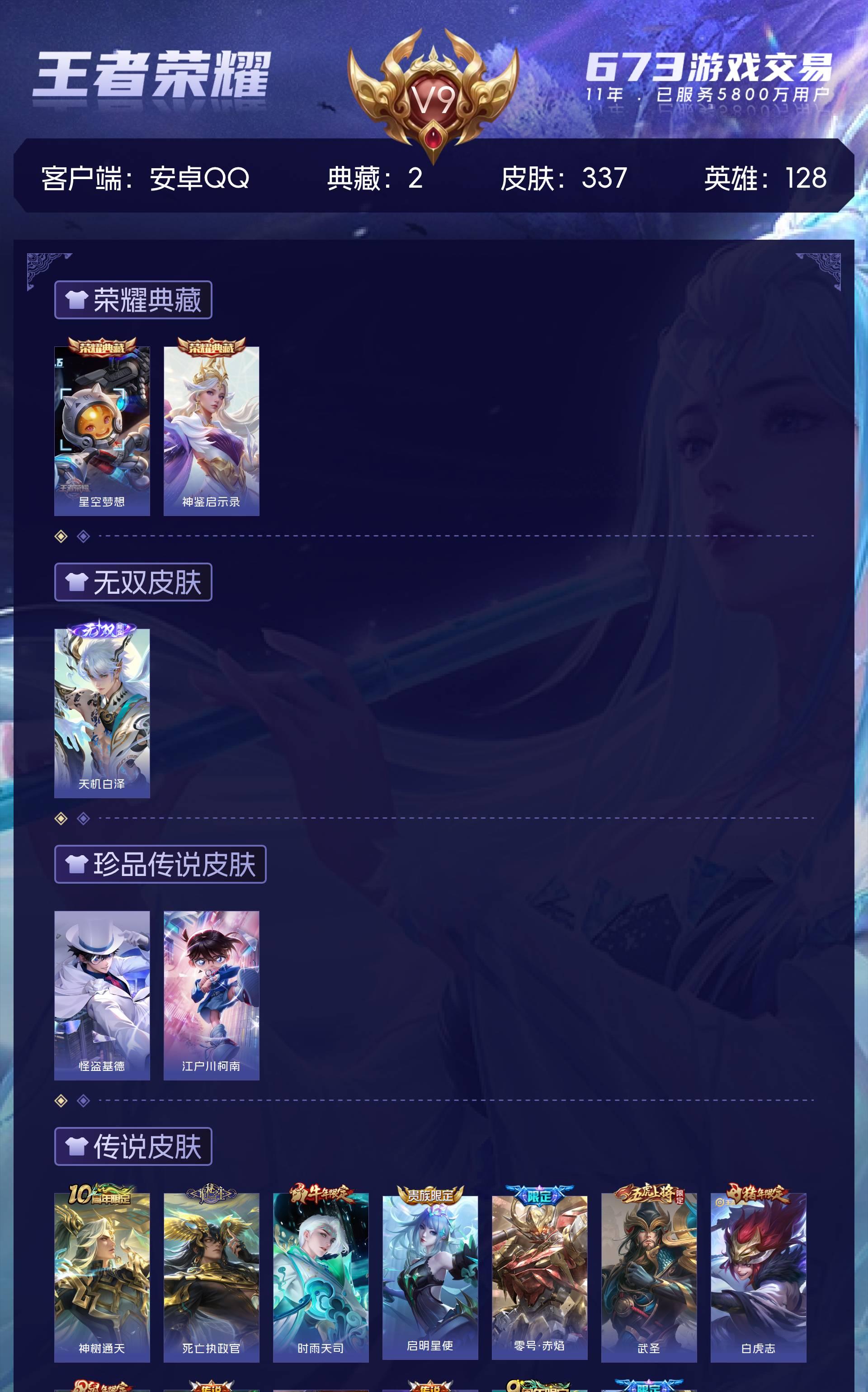 安卓QQ/最强王者/337皮肤/128英雄/2典藏/0珍品无双/1无双/2珍品传说/12传说/89史