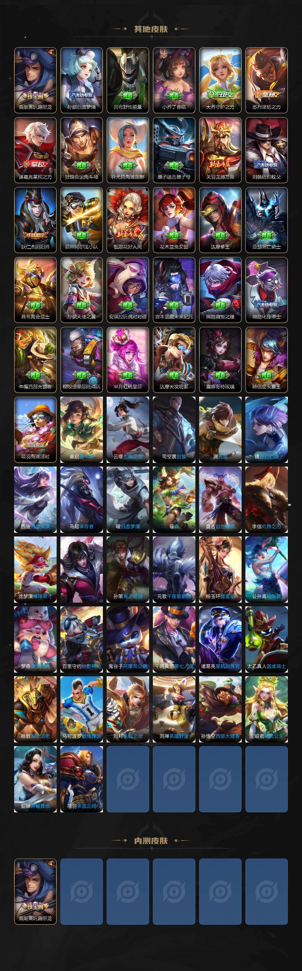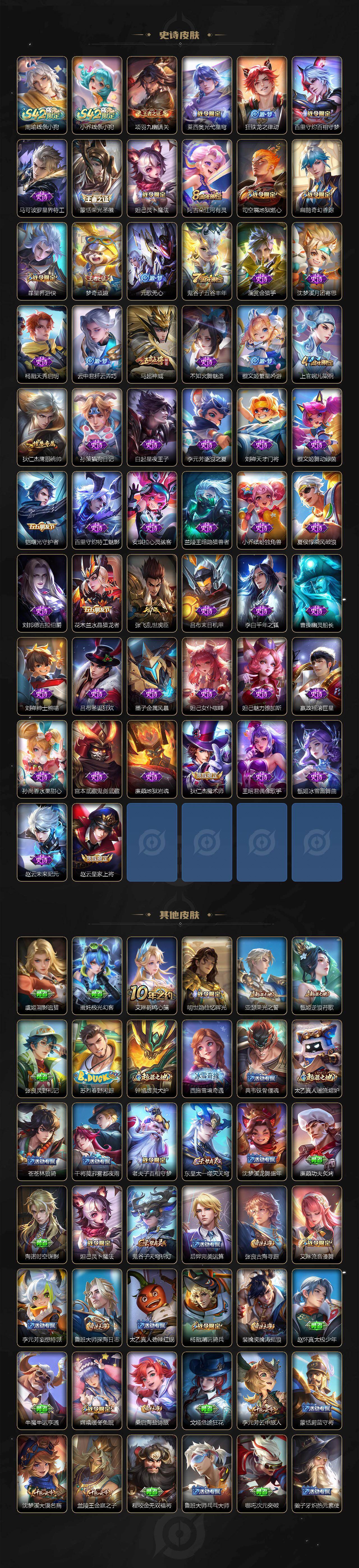 【限定皮肤】:狄仁杰阴阳师,赵云皇家上将,高渐离玩趣恶龙,扁鹊奇幻香踪,元歌无心