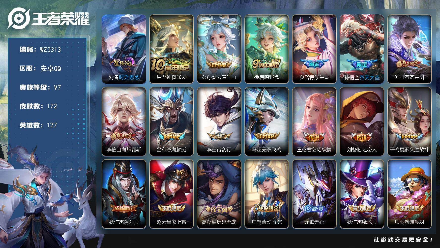 【秒换绑】安卓Q-V7-最强王者段位-127英雄-172皮肤-13传说-54史诗