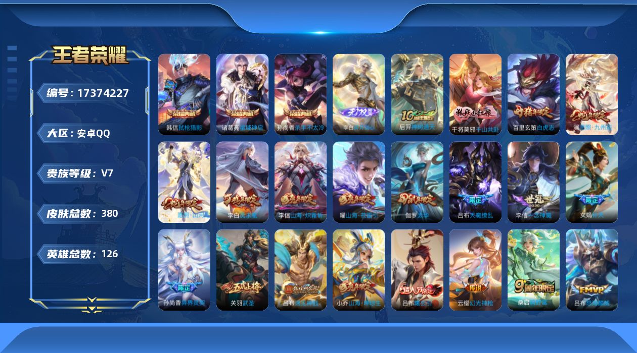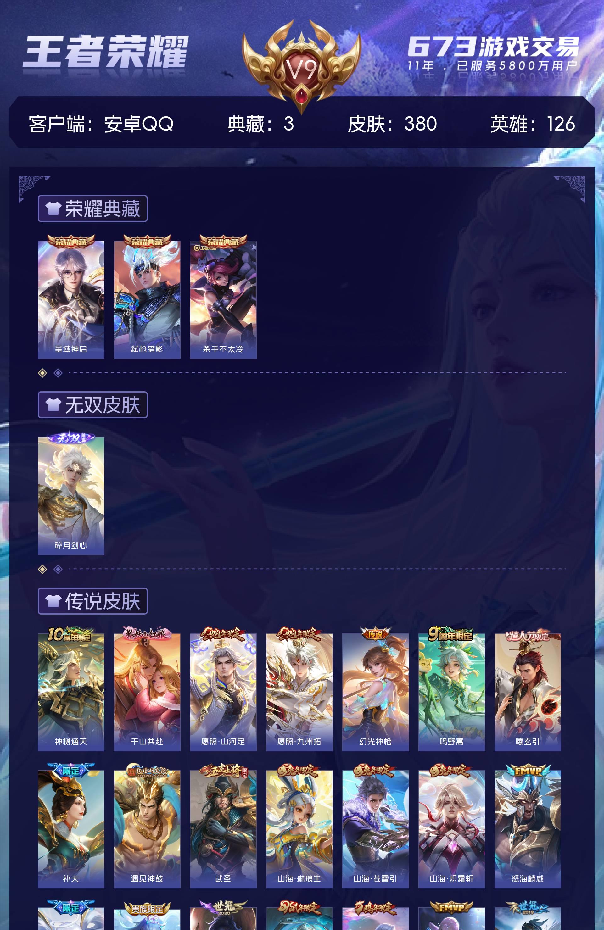V9 皮肤380 英雄126 永恒钻石 荣耀典藏3 无双皮肤1 传说27 其他皮肤355