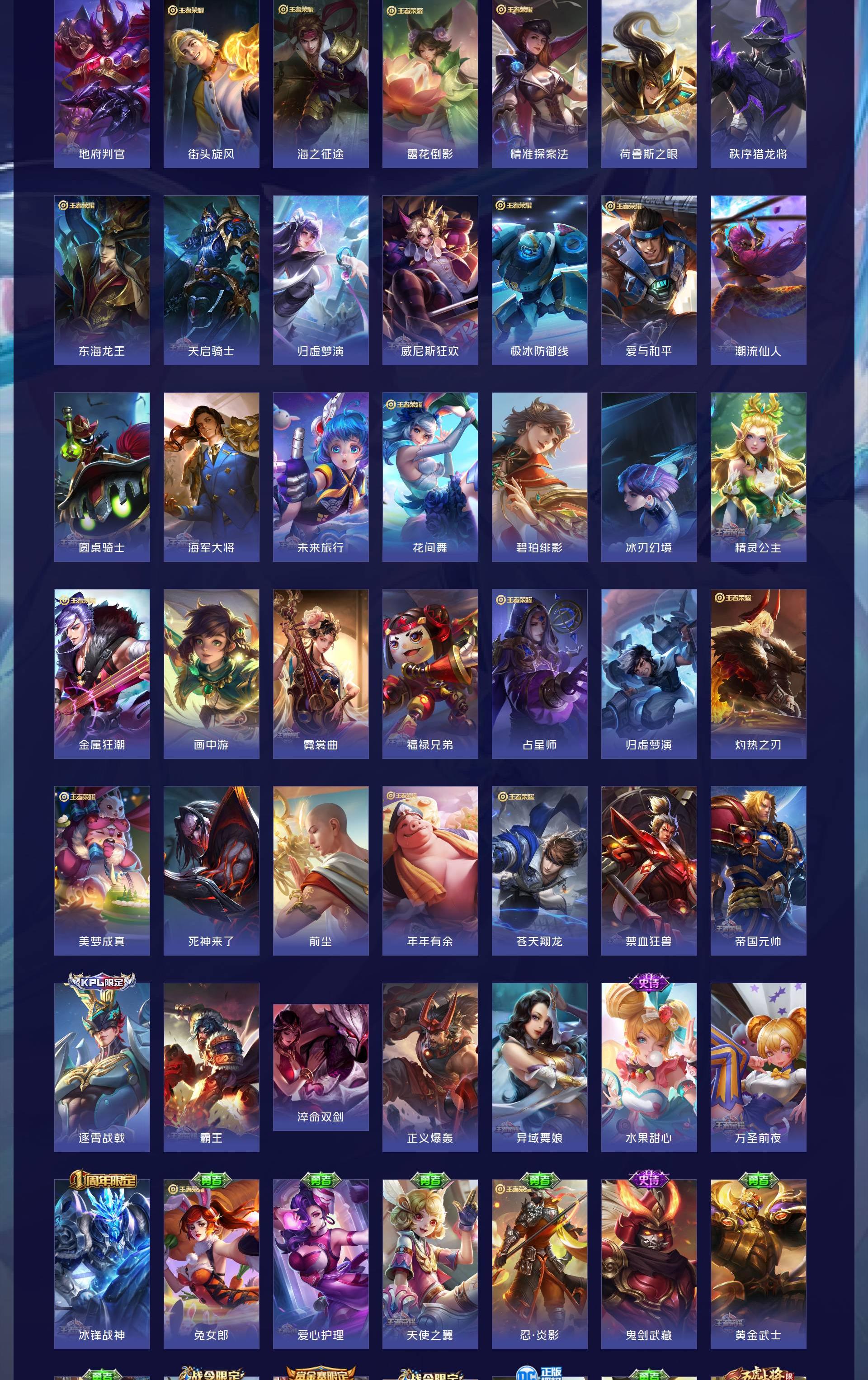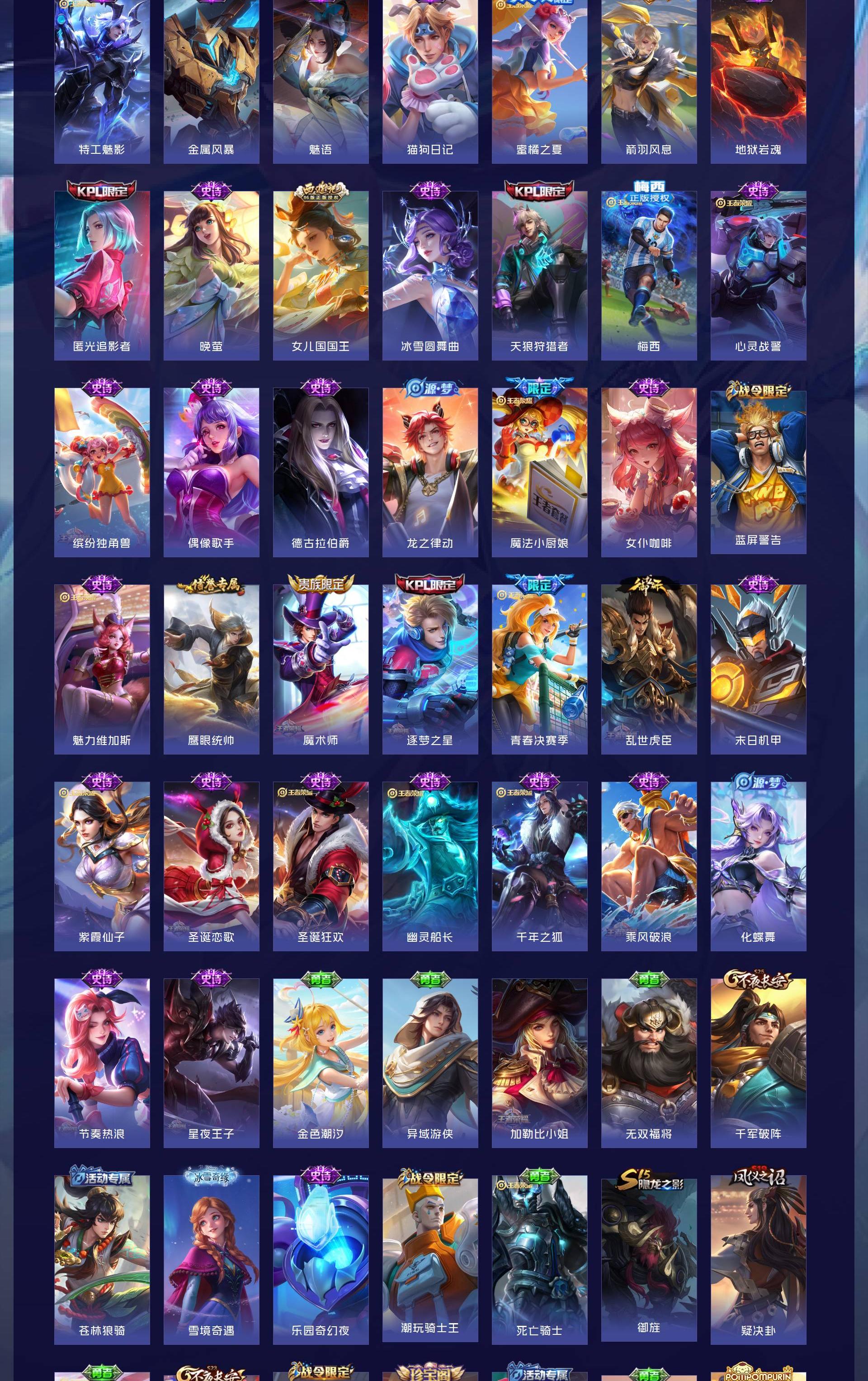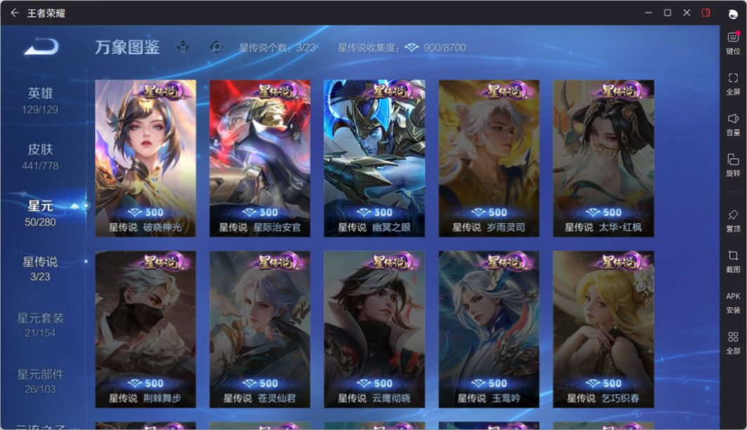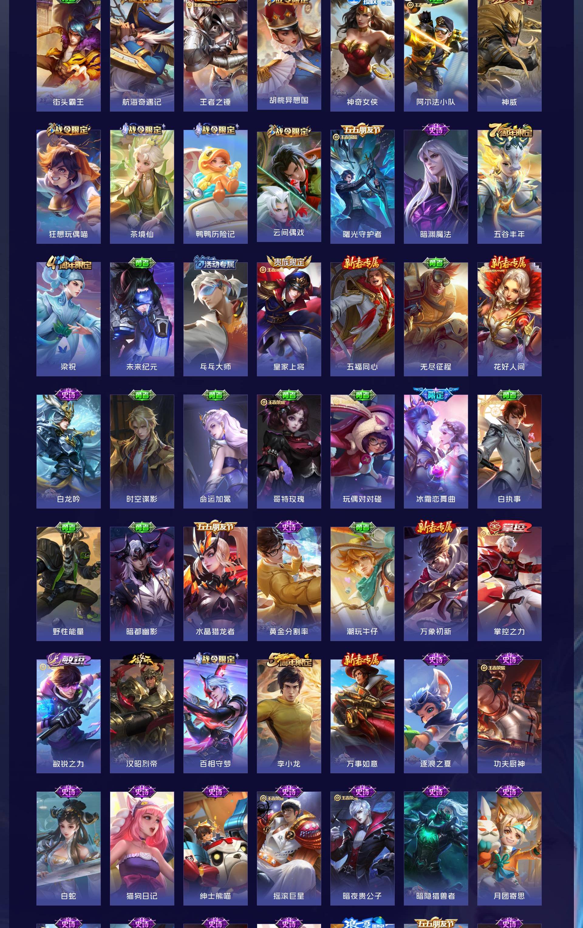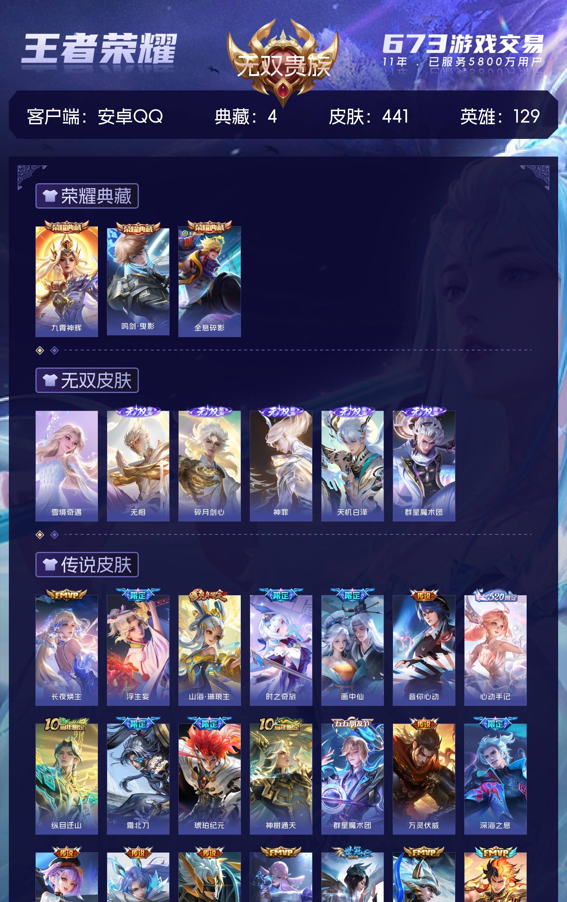 无双贵族 皮肤441 英雄129 无双王者 荣耀典藏4 无双皮肤6 传说65 其他皮肤373