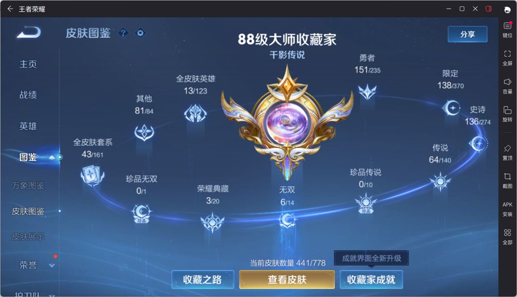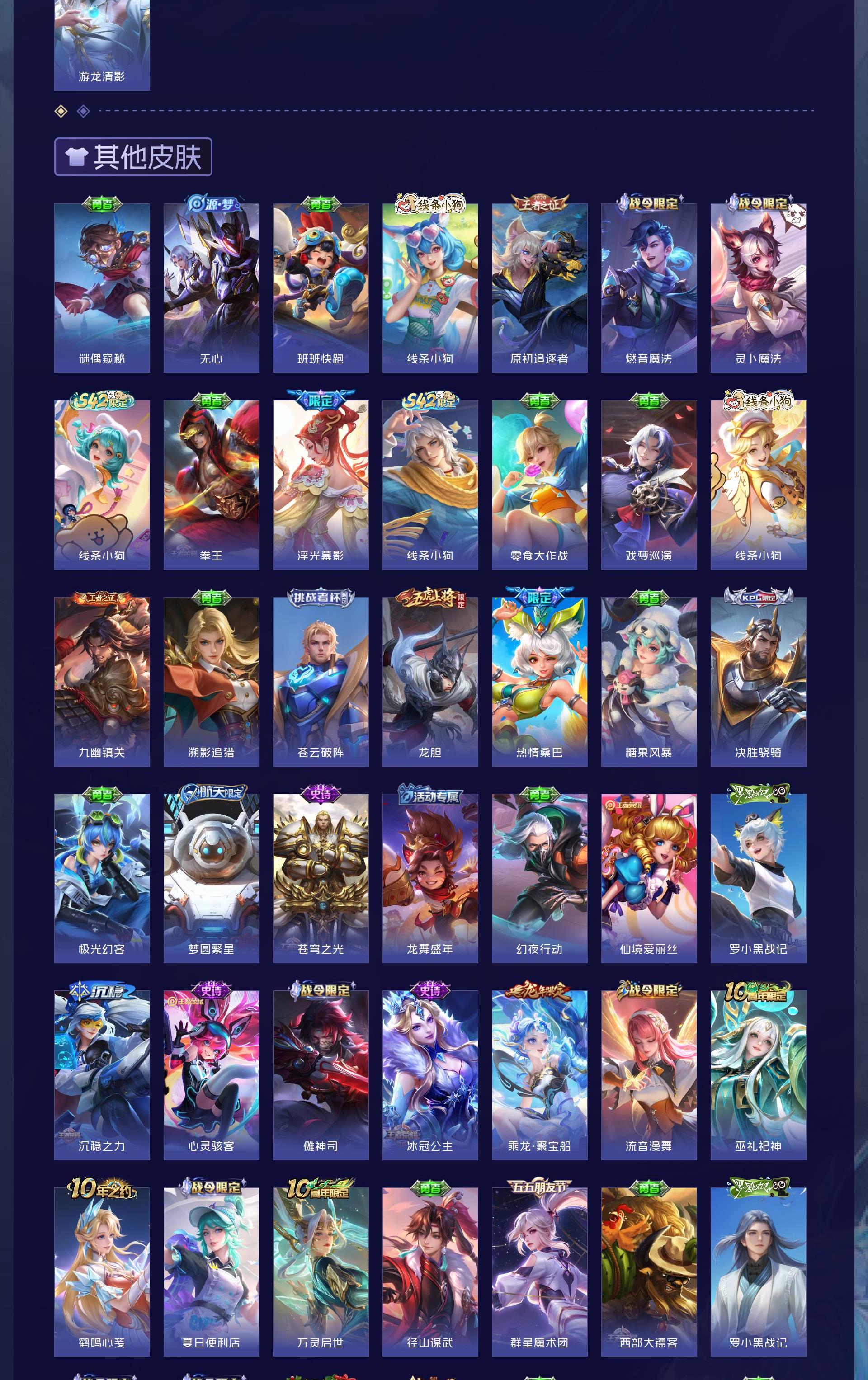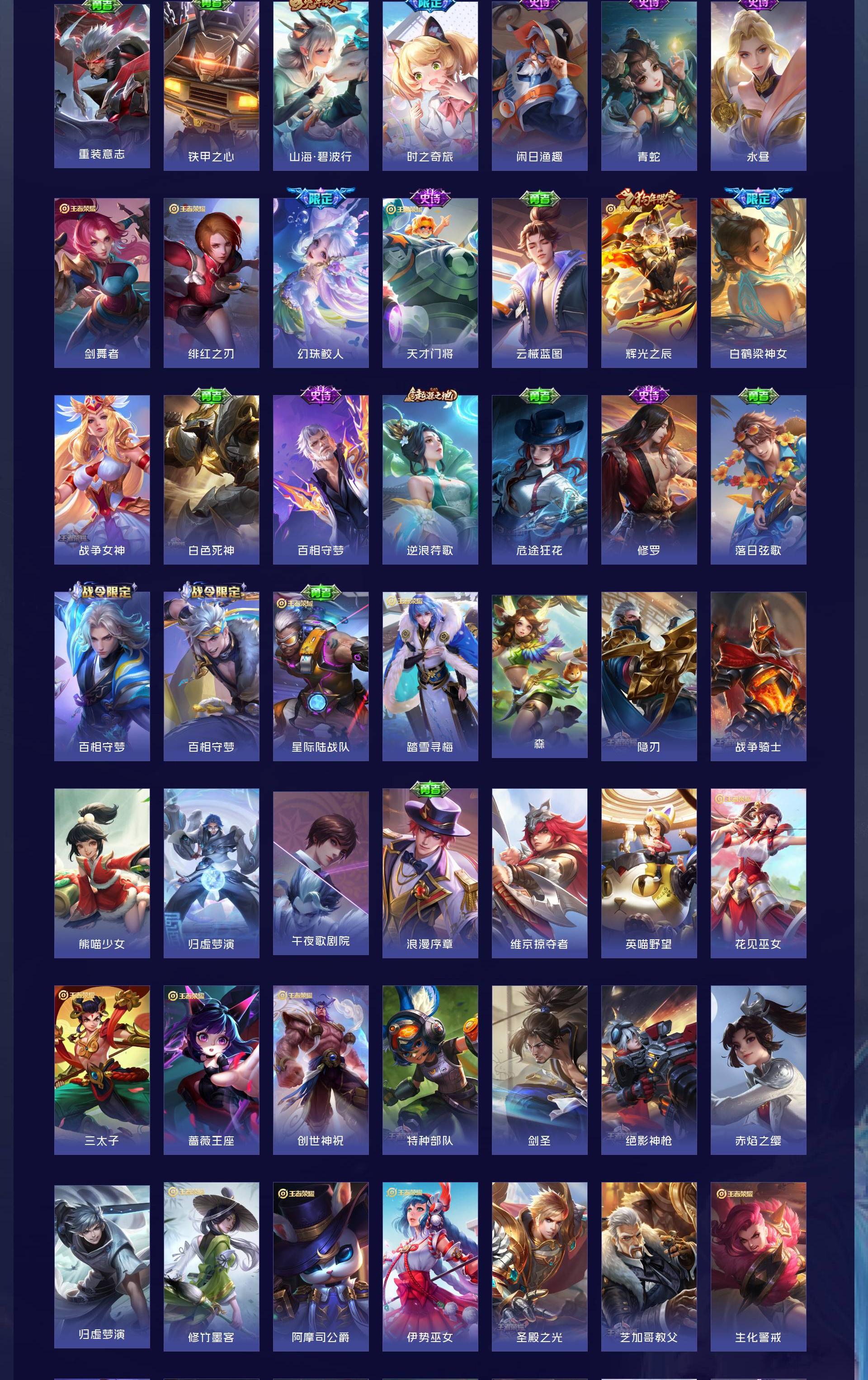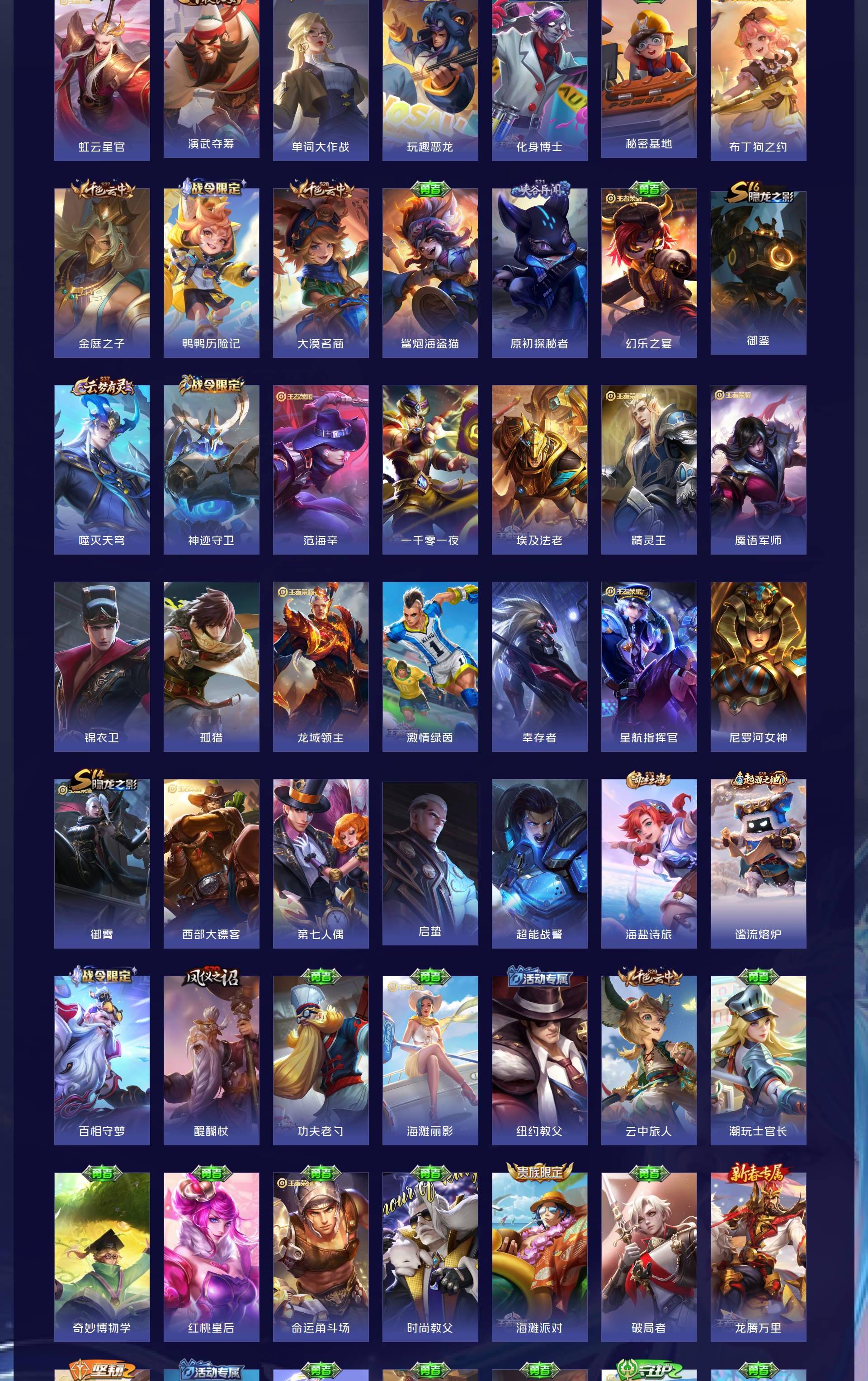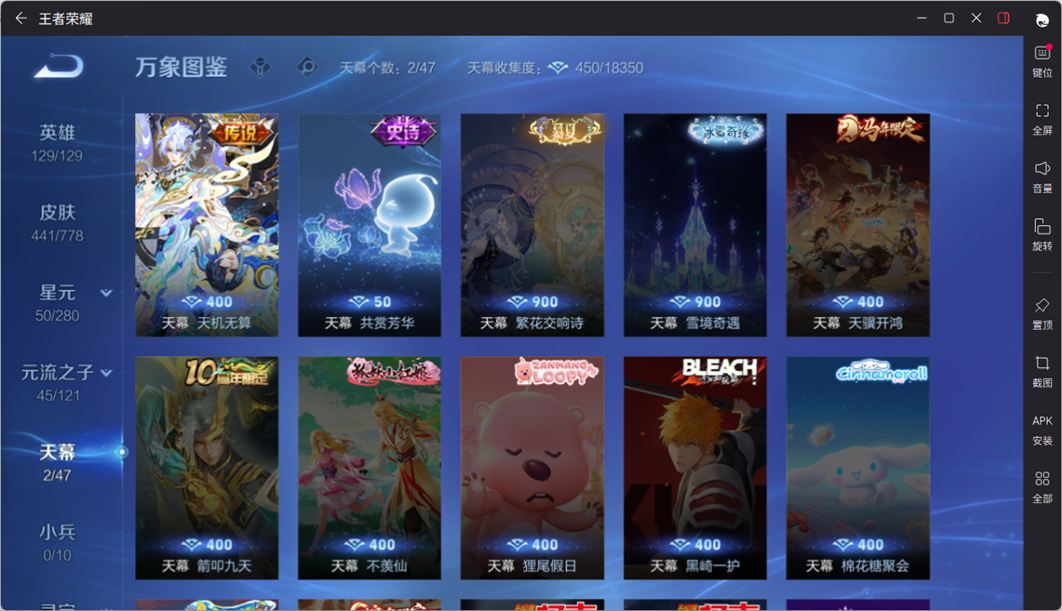 无双贵族 皮肤441 英雄129 无双王者 荣耀典藏4 无双皮肤6 传说65 其他皮肤373