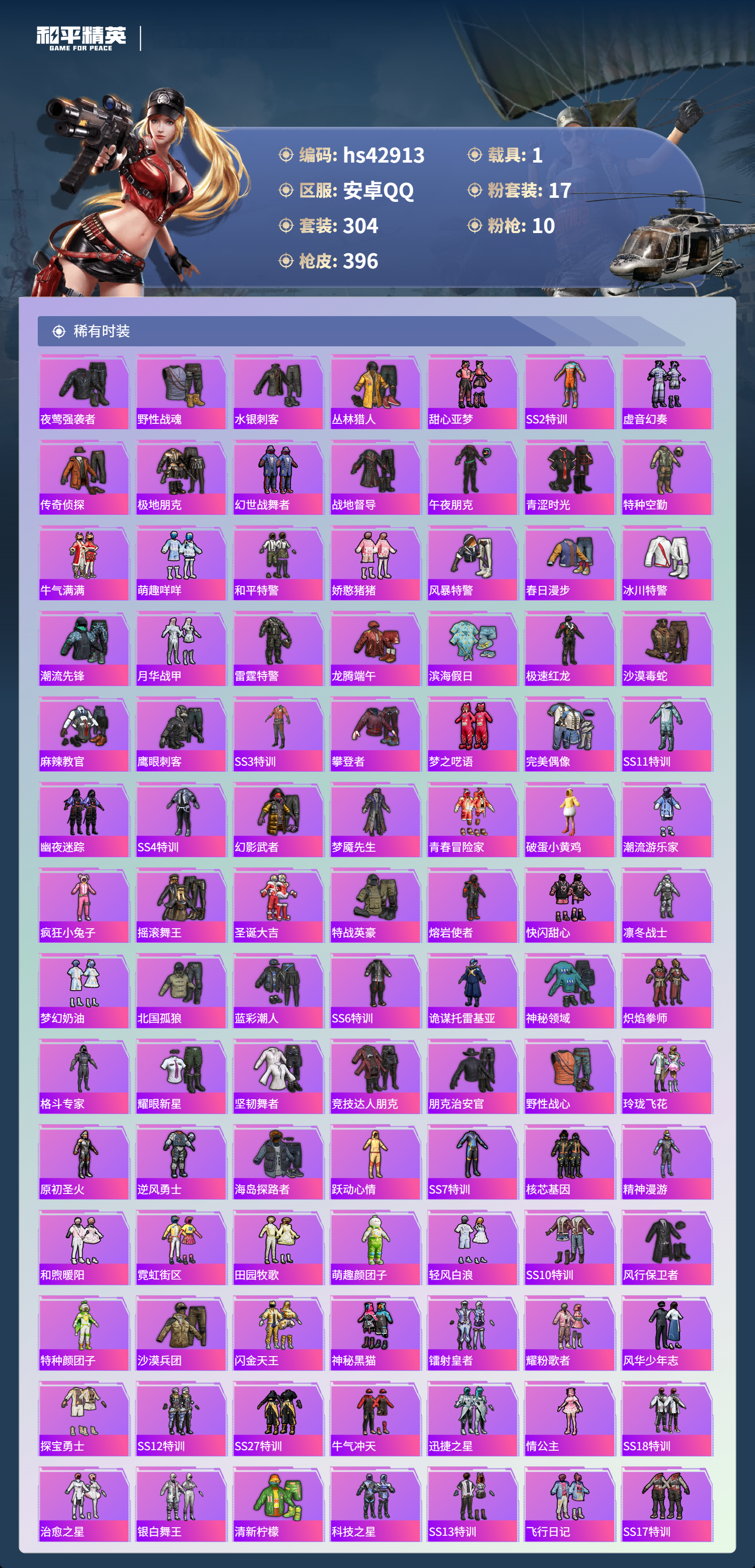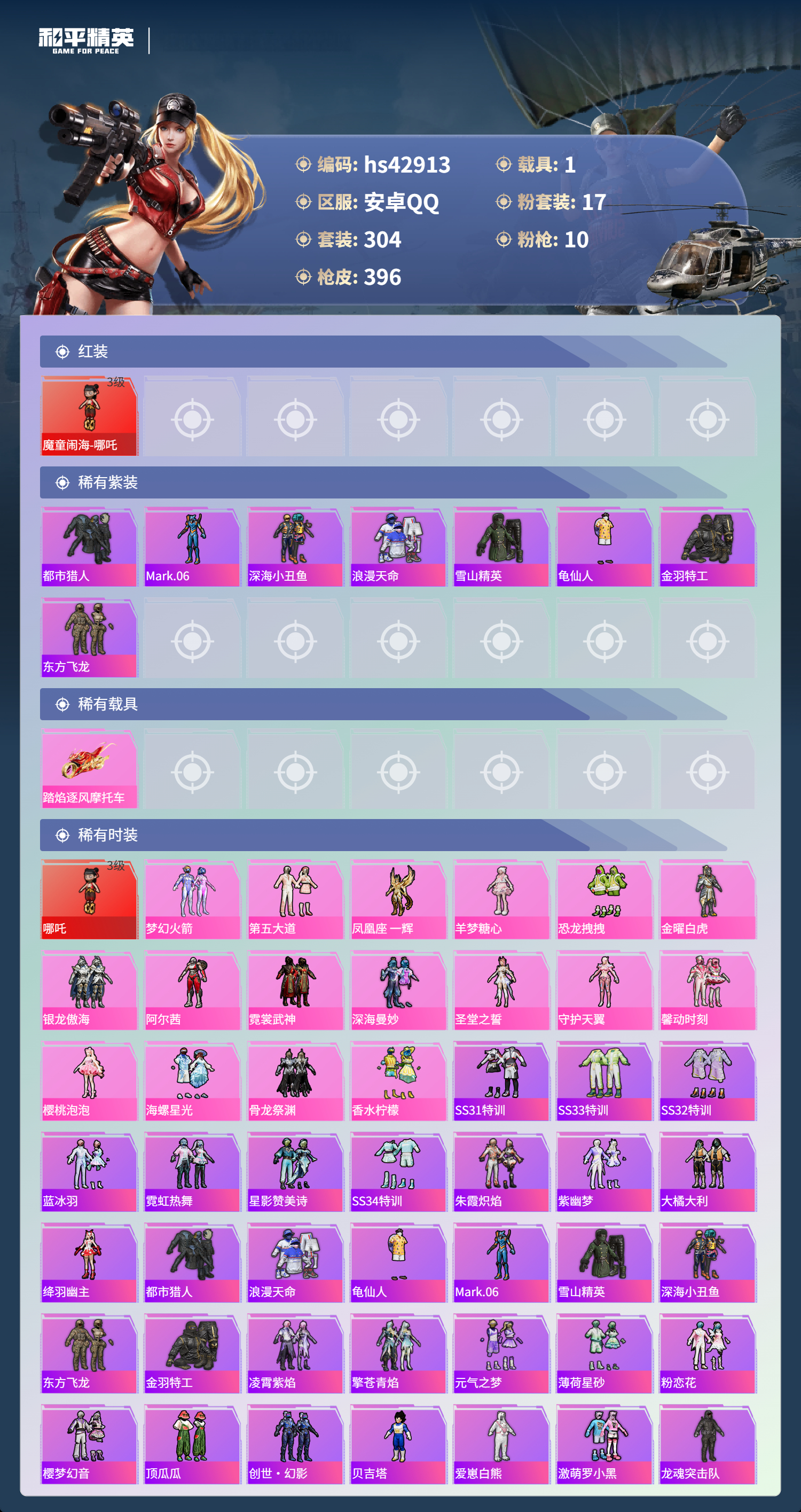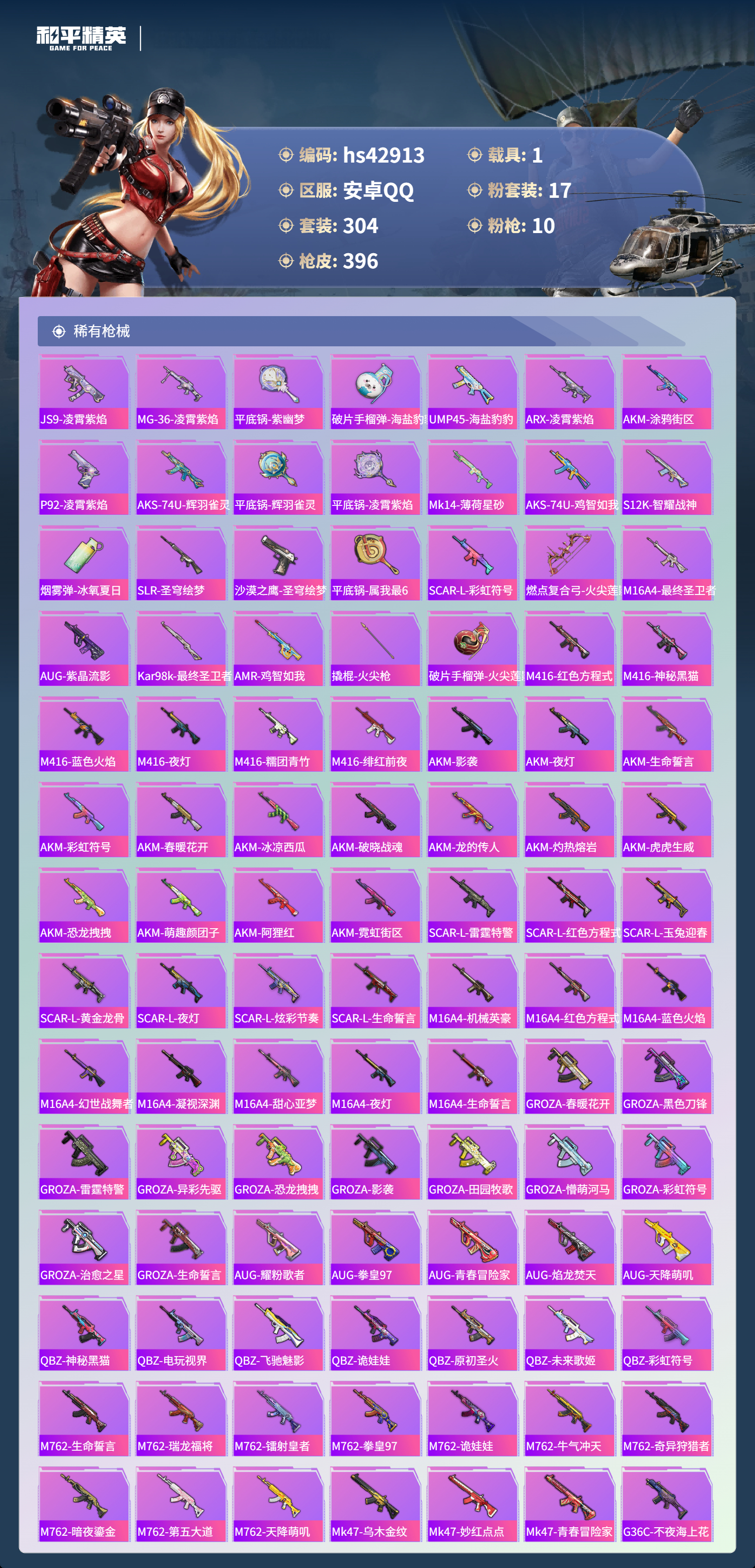 hs42913 安卓手Q-25王牌印记-1红装-17粉装-10特效枪-1载具-热力值-304套装-396枪皮-1卓越印记