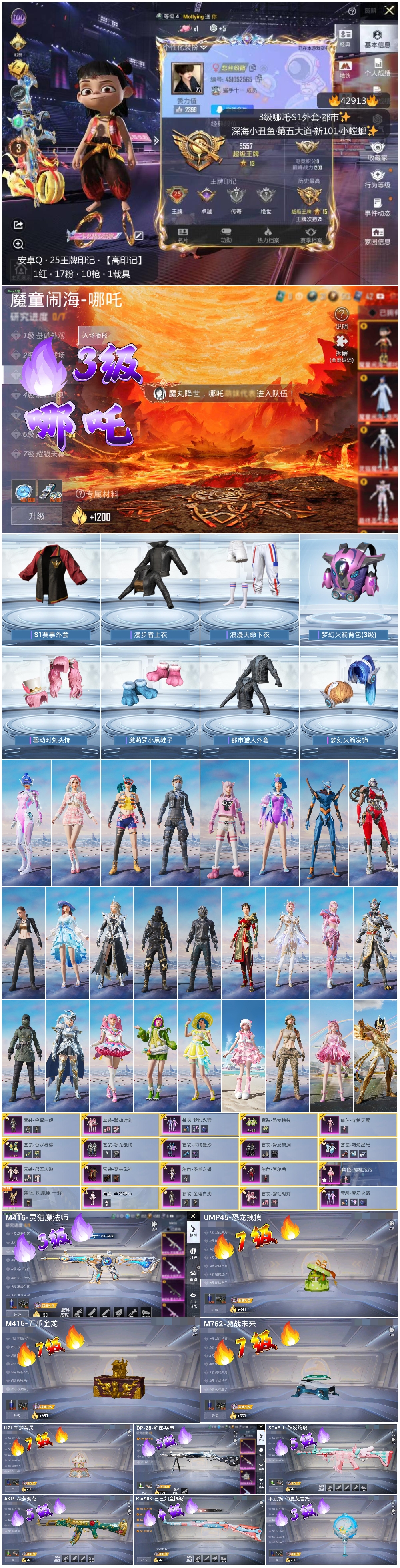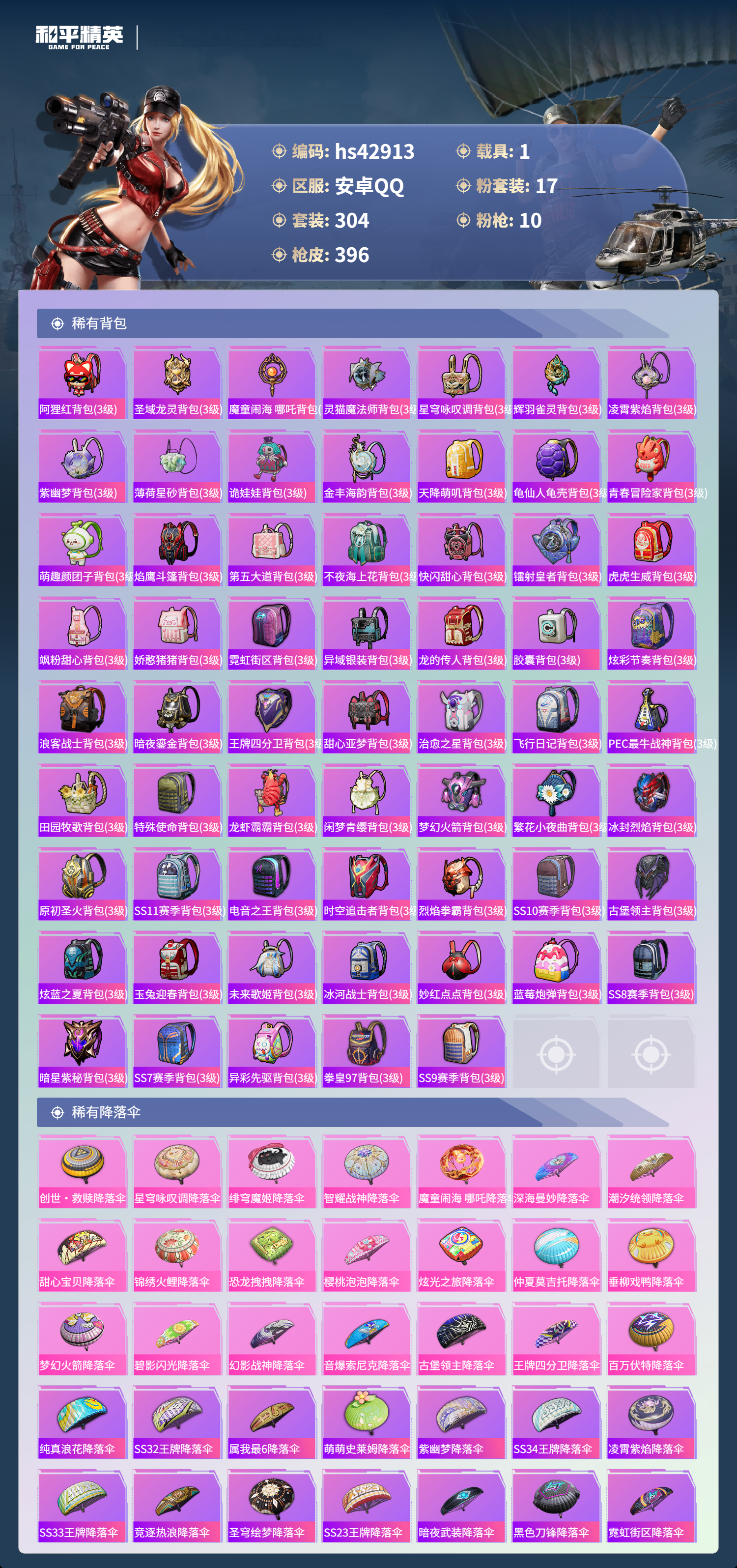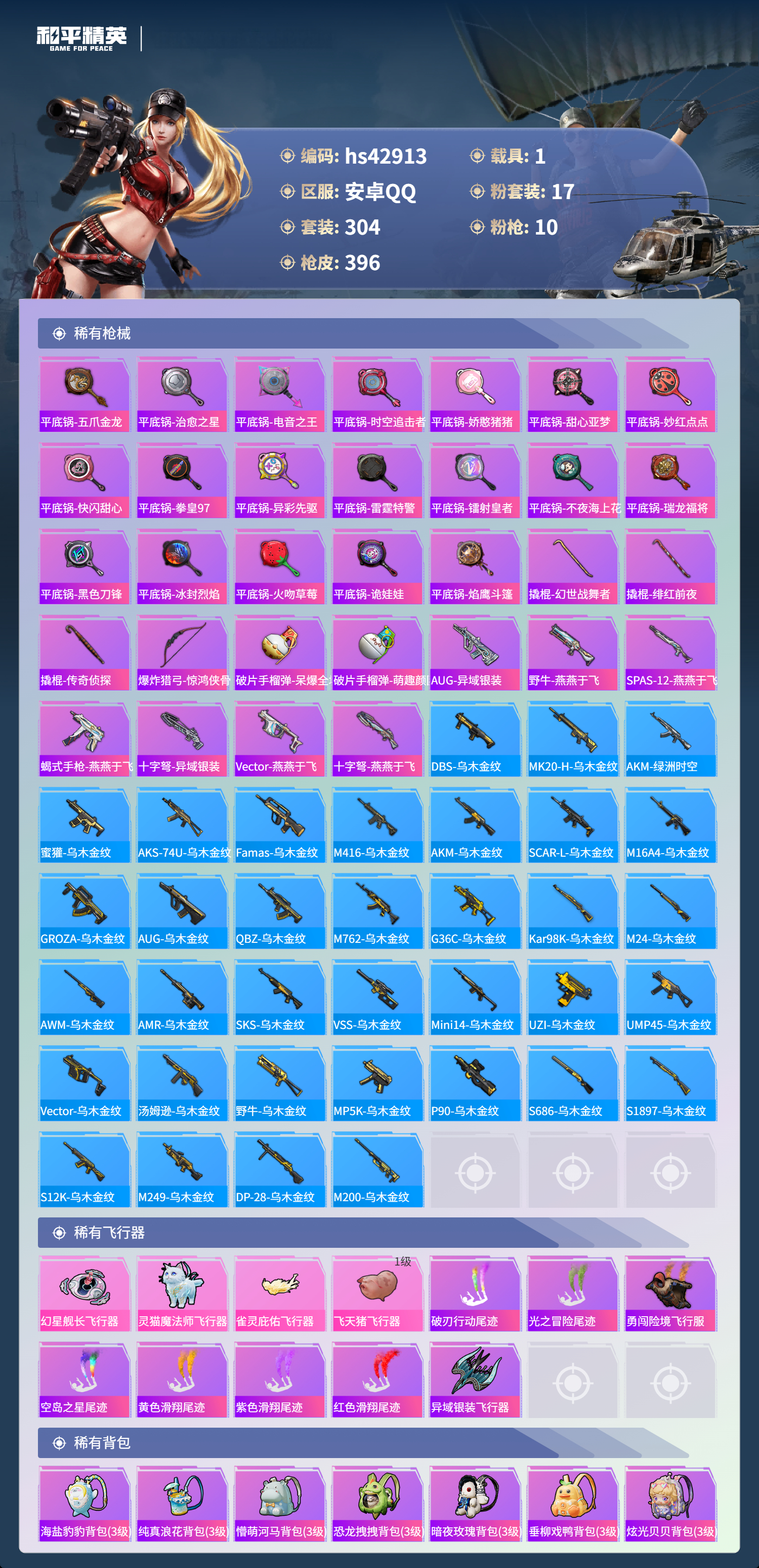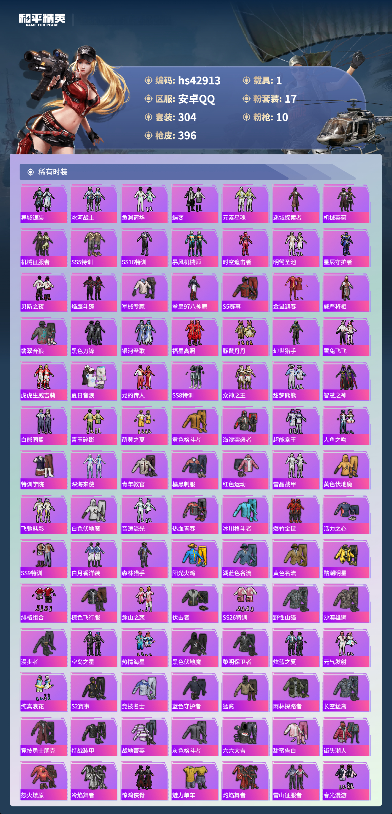 hs42913 安卓手Q-25王牌印记-1红装-17粉装-10特效枪-1载具-热力值-304套装-396枪皮-1卓越印记